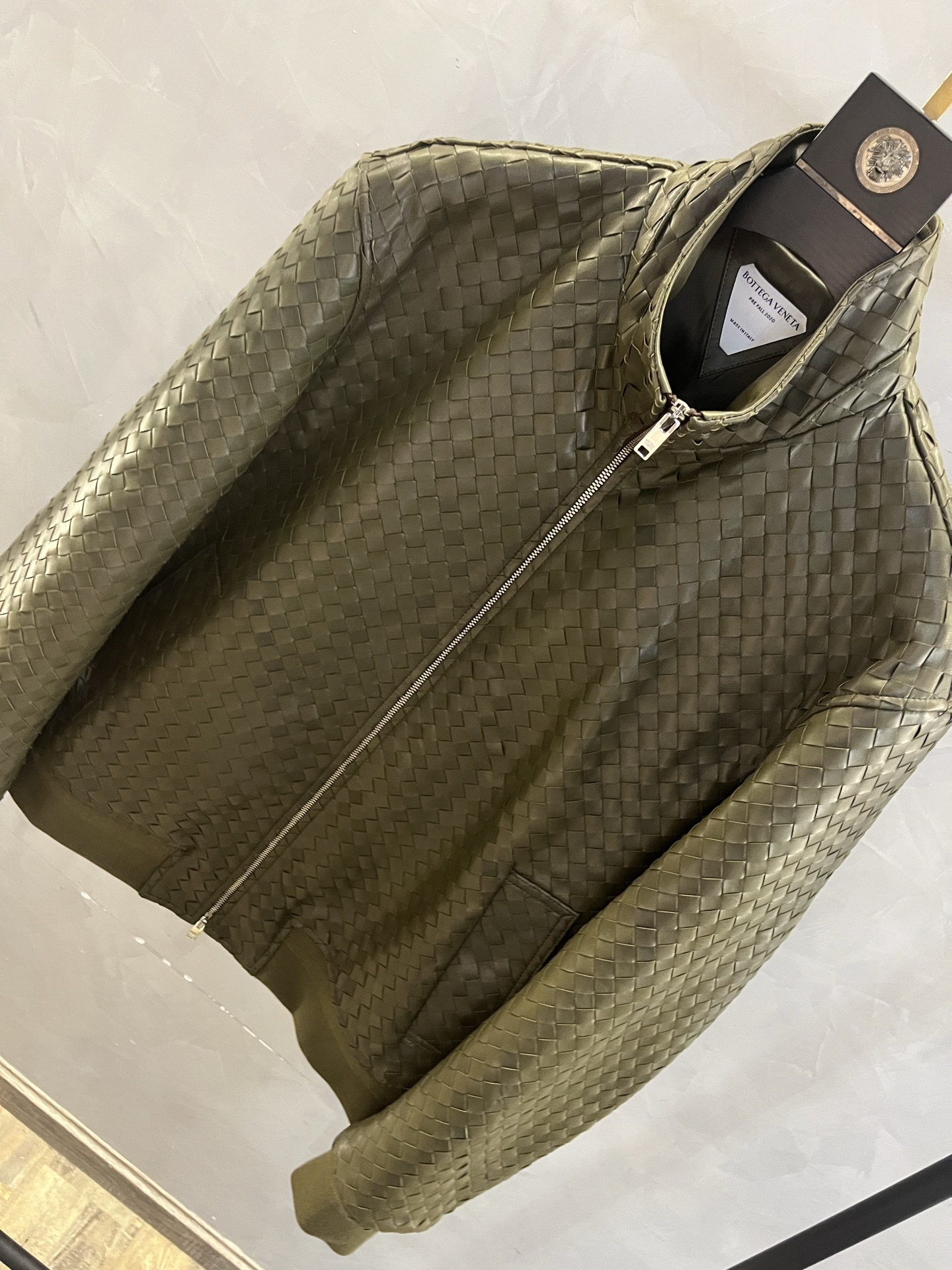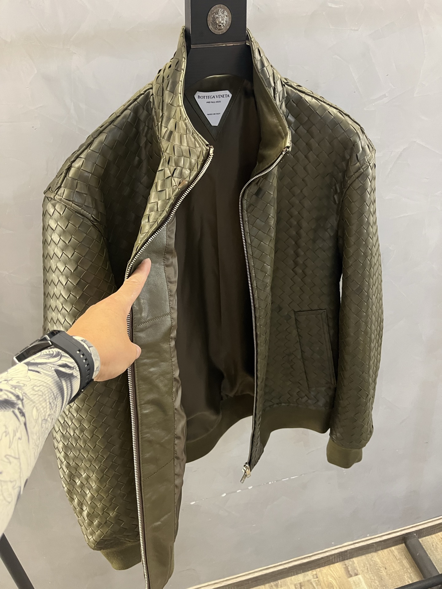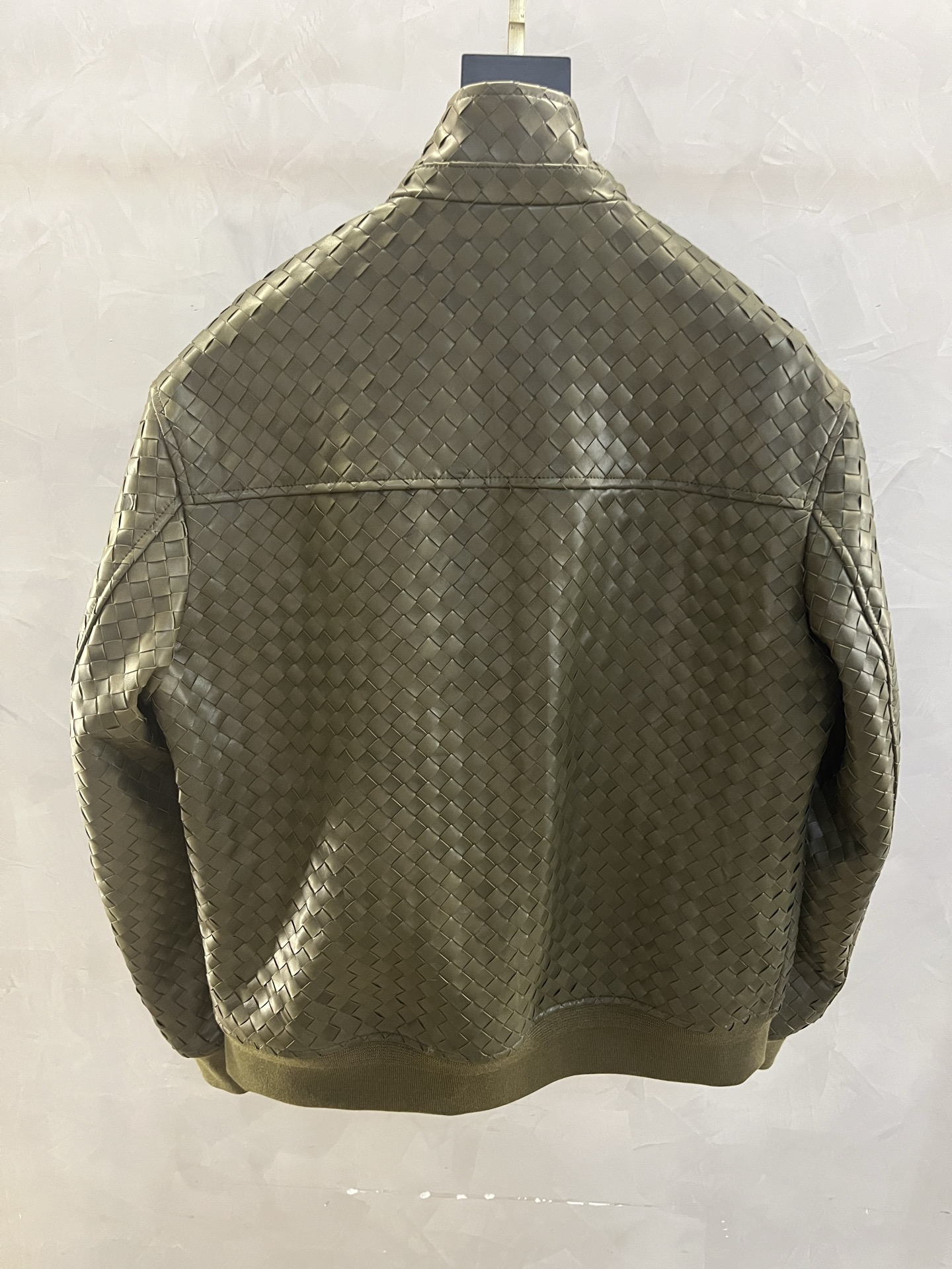 Hong Kong counter authentic synchronized pure handmade stand-up collar lambskin woven leather jacket. BV's bulk hardware and washing are all 1:1 replicas. The entire garment pieces use handmade weaving craftsmanship, which is time-consuming as expected, testing craftsmanship skills during idle time. The ribbing also uses lambskin ribbing, matching the garment itself to enhance its texture. This style is very time-consuming, with three colors available in stock.