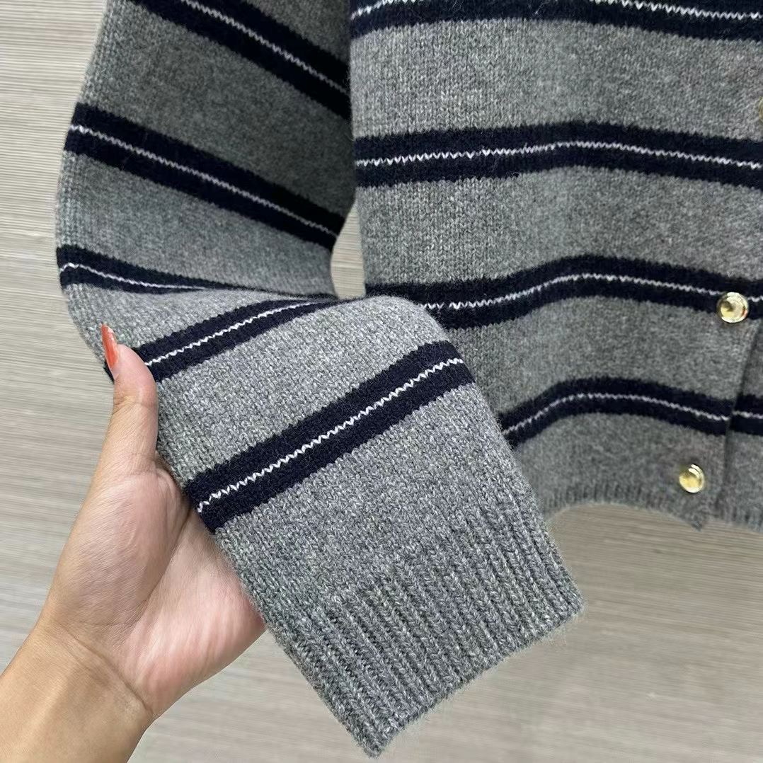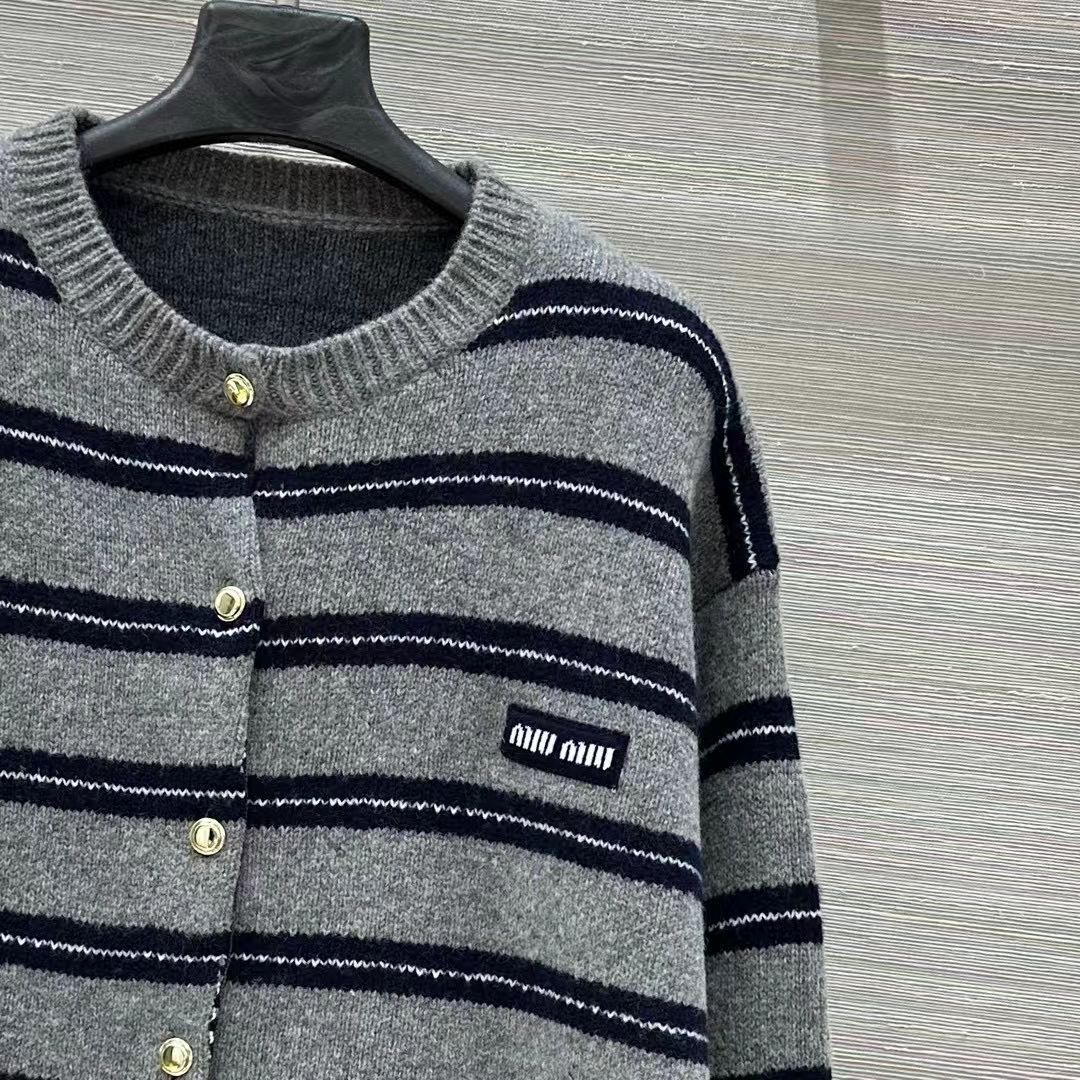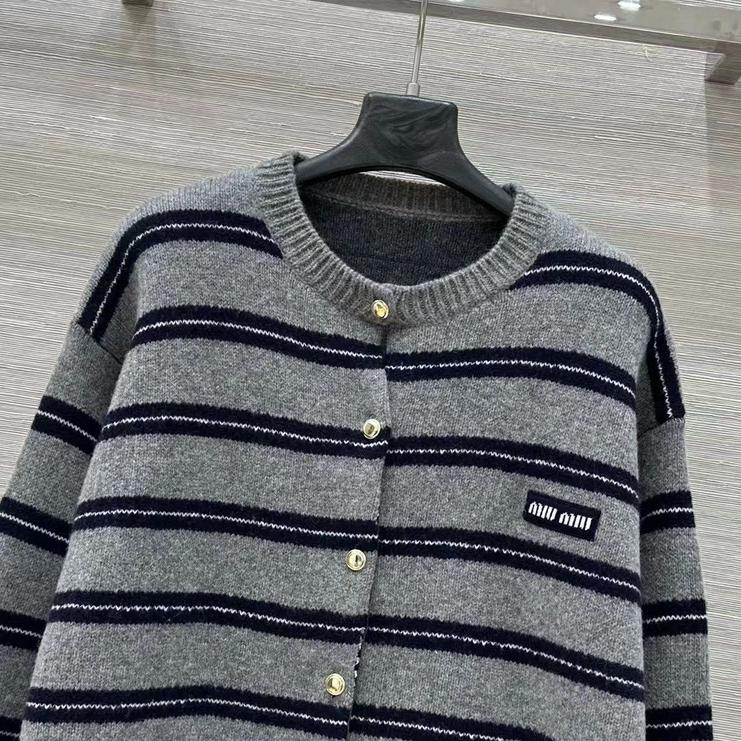 Miu M*i 25/New Miu-style girl's outfit, intellectual fashion style, lace-inspired cashmere coat! Gray-blue striped color scheme, oversized cashmere knitted coat! Made with our 58% wool and 40% cashmere yarn for a thick and comfortable texture! Letter label design enhances a youthful, elegant, and sweet style! Original custom classic cut, versatile and flattering for all body types—looks incredibly beautiful when worn! Check the details for craftsmanship and quality~ Sizes S, M, L