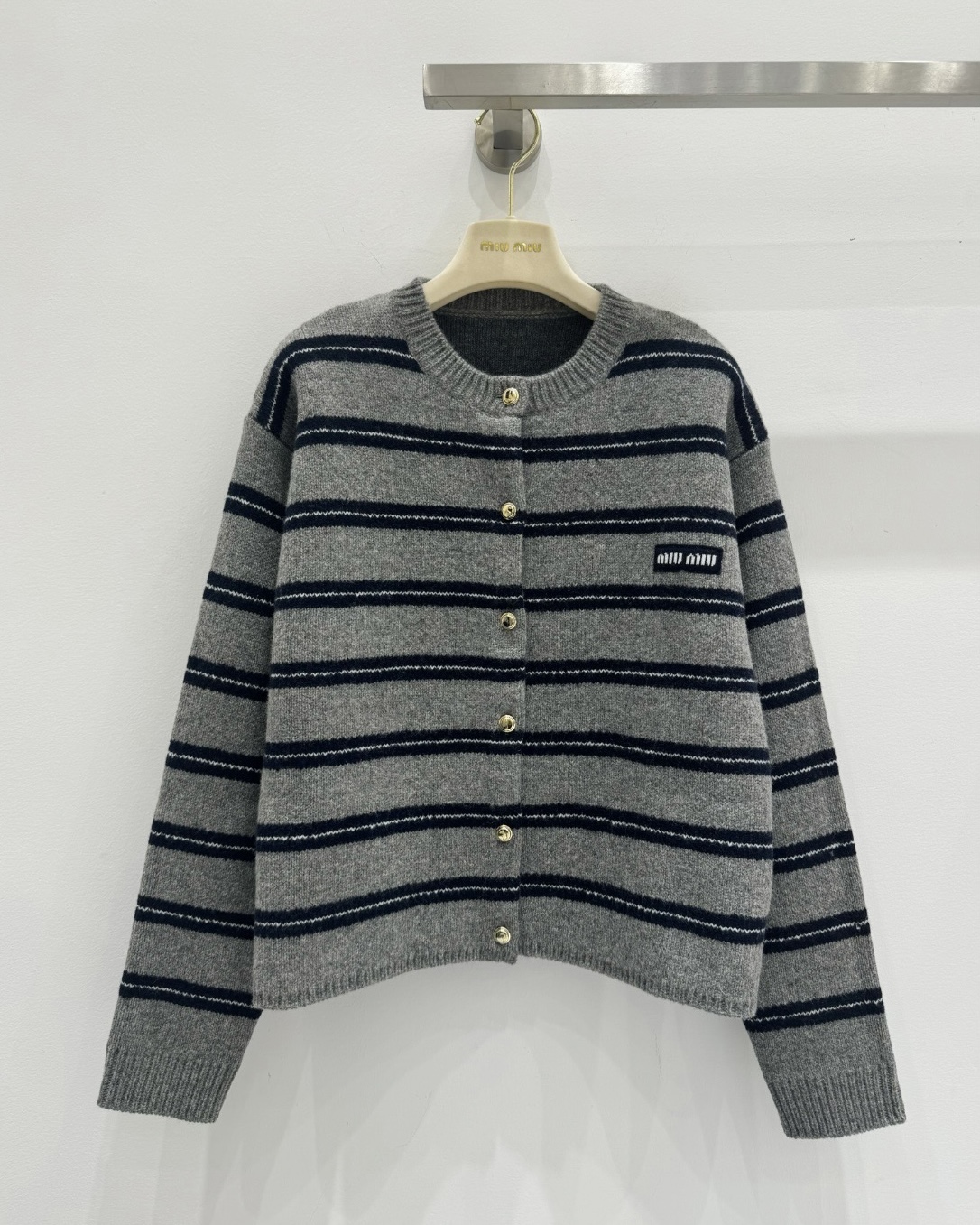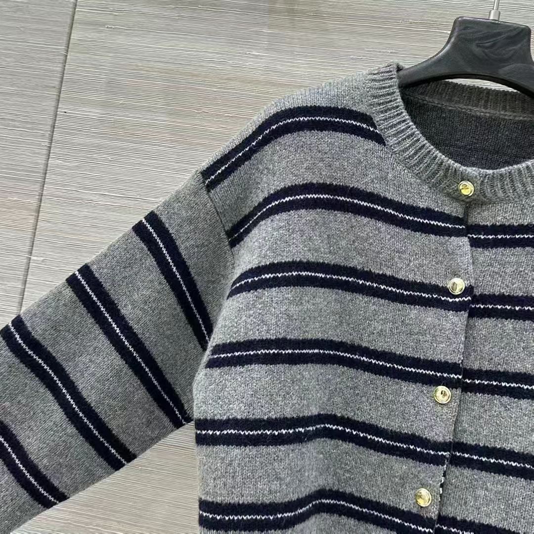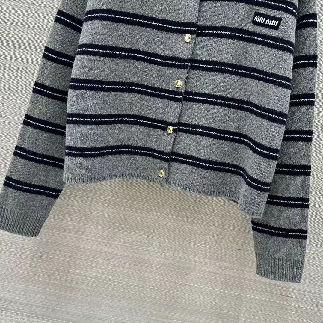 Miu M*i 25/New Miu-style girl's outfit, intellectual fashion style, lace-inspired cashmere coat! Gray-blue striped color scheme, oversized cashmere knitted coat! Made with our 58% wool and 40% cashmere yarn for a thick and comfortable texture! Letter label design enhances a youthful, elegant, and sweet style! Original custom classic cut, versatile and flattering for all body types—looks incredibly beautiful when worn! Check the details for craftsmanship and quality~ Sizes S, M, L