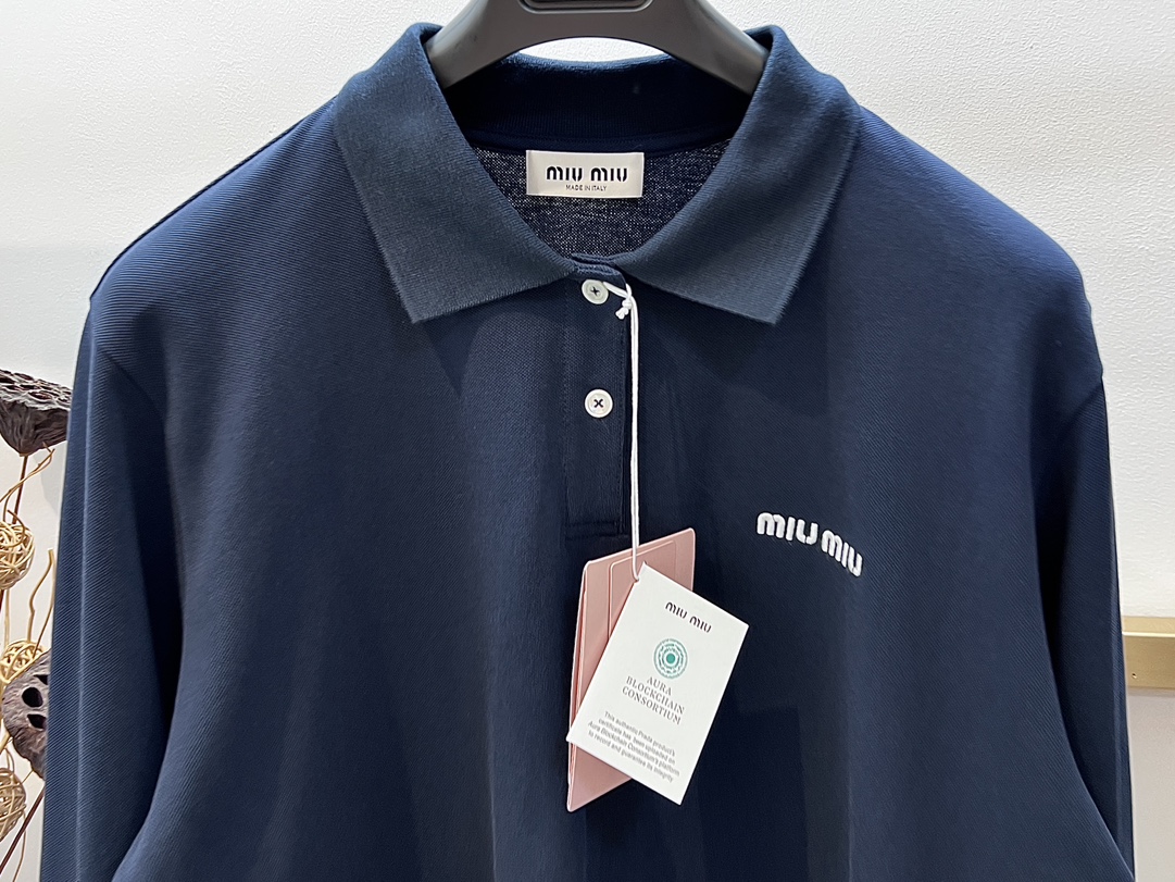 Miumiu 24FW Japan Limited Pop-UP Long Sleeve Polo Collar Shirt! Pique pure cotton, OS silhouette, hem with contrasting color block design, side slit adorned with Miu Miu classic embroidered logo letter badge, adding iconic elements. Really understands fashion.