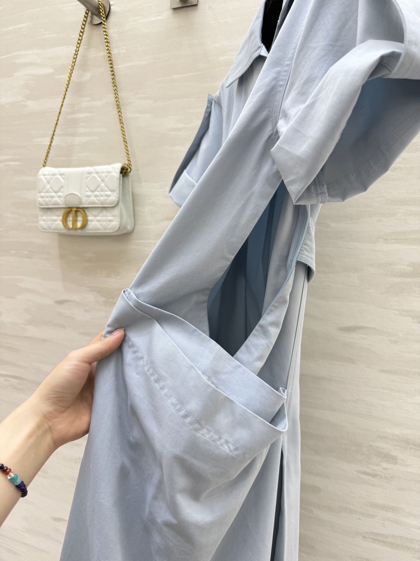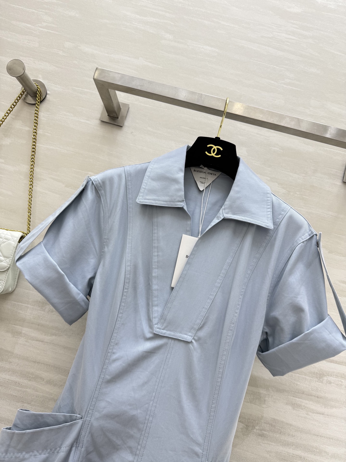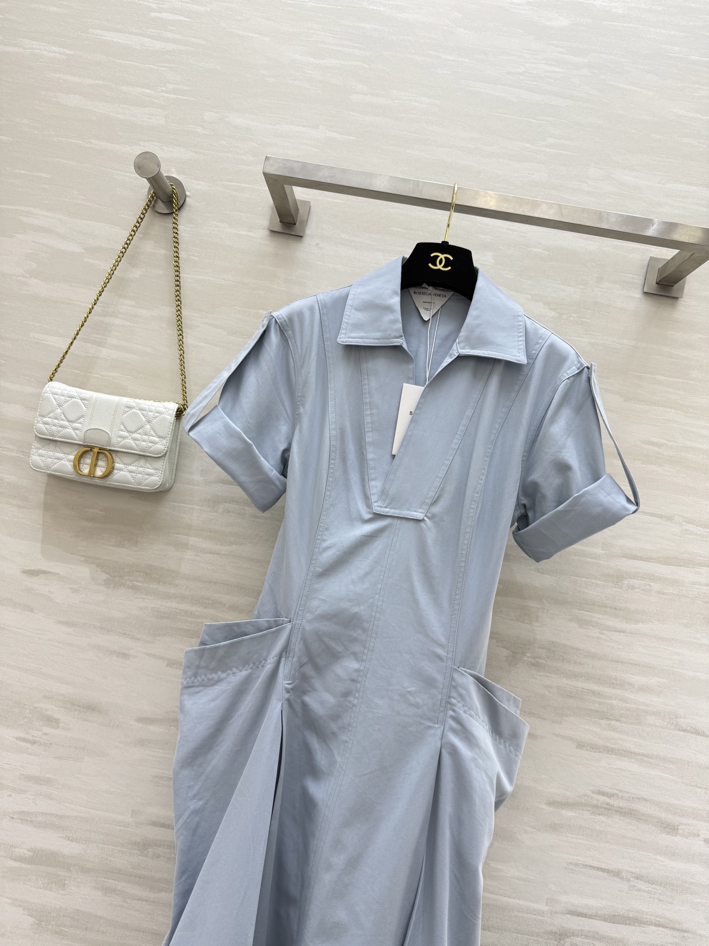 #Bv²⁵ New minimalist style roll-up sleeve V-neck dress with draped double pocket decoration, waist-cinching pleated umbrella hem design. The waist-tie version is extremely slimming. Wearing it gives an elegant, intellectual, and relaxed feel. Super wearable shirt dress, versatile for commuting. High-quality custom. First release in stock sizes: S/M/L (S size bust: 86, waist: 74, dress length: 102)