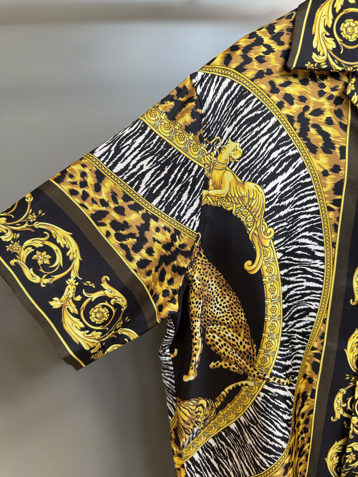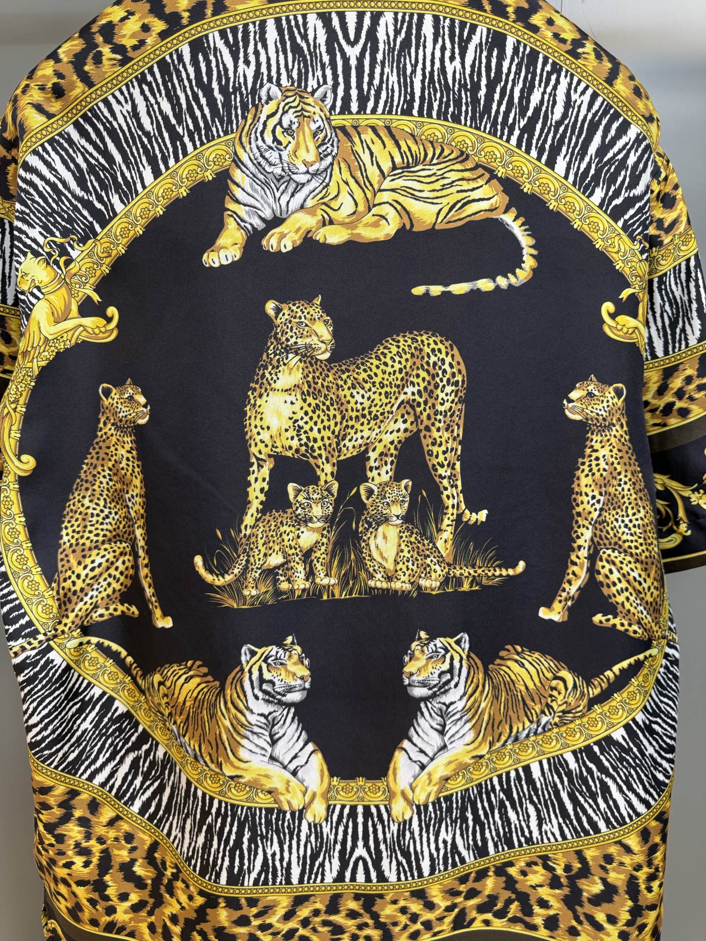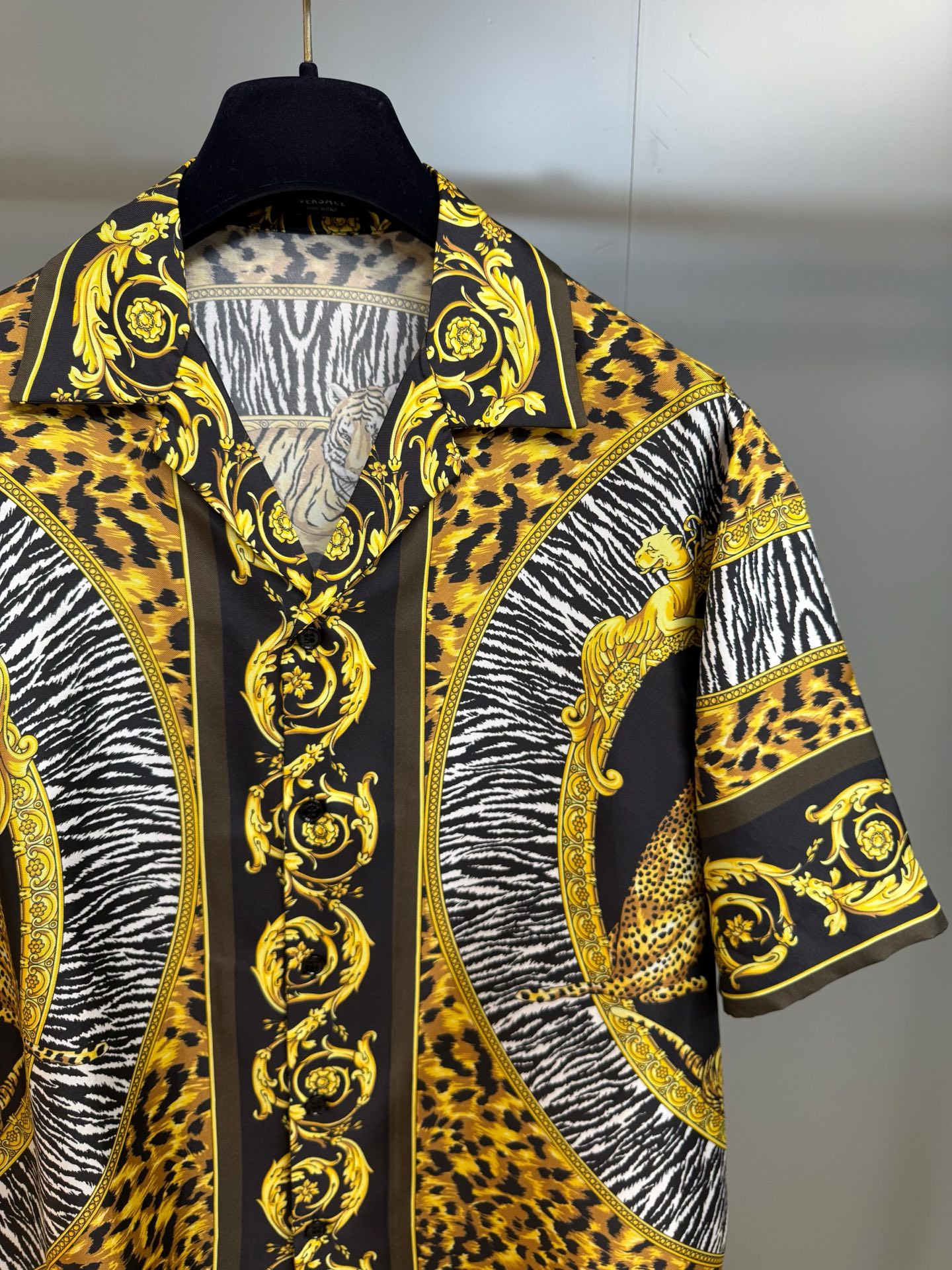 Shirt 💯 Mulberry Silk Versace New VS Leopard and Zebra Print Men's Wild Cats Silk Shirt, twill short-sleeve shirt, fully decorated with Wild Cats print, reinterpreted with zebra and leopard patterns to refresh the classic animal kingdom print, Wild Cats print, short sleeves, notch lapel, front button closure. Fabric: 100% mulberry silk!