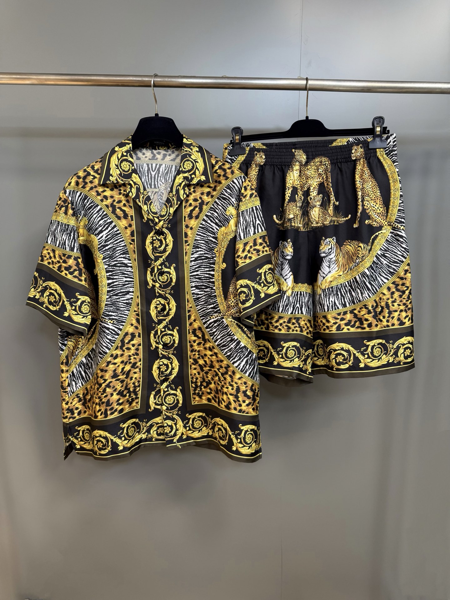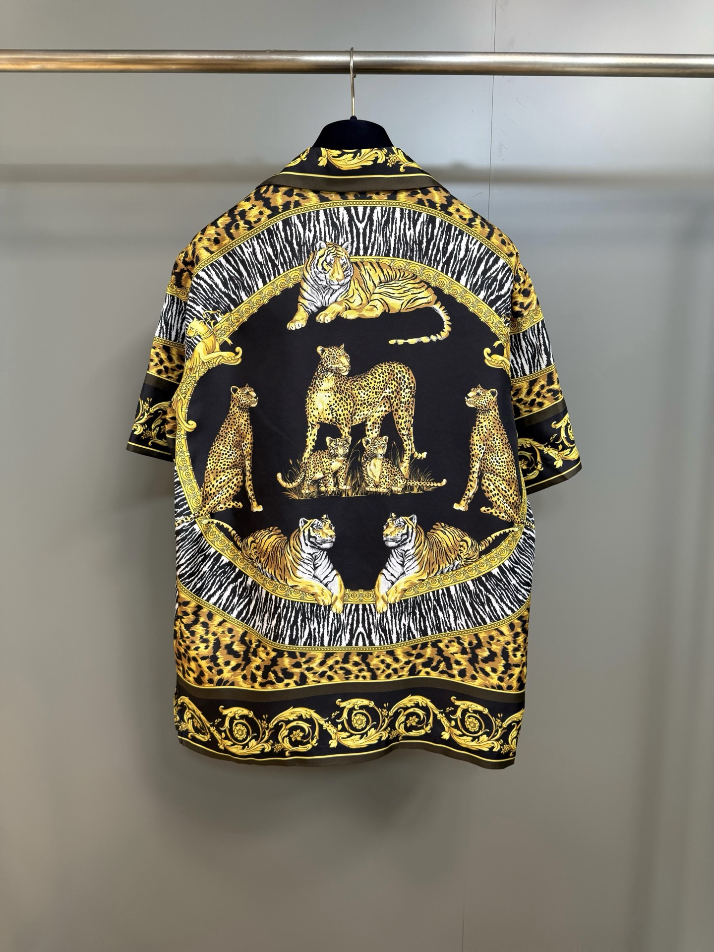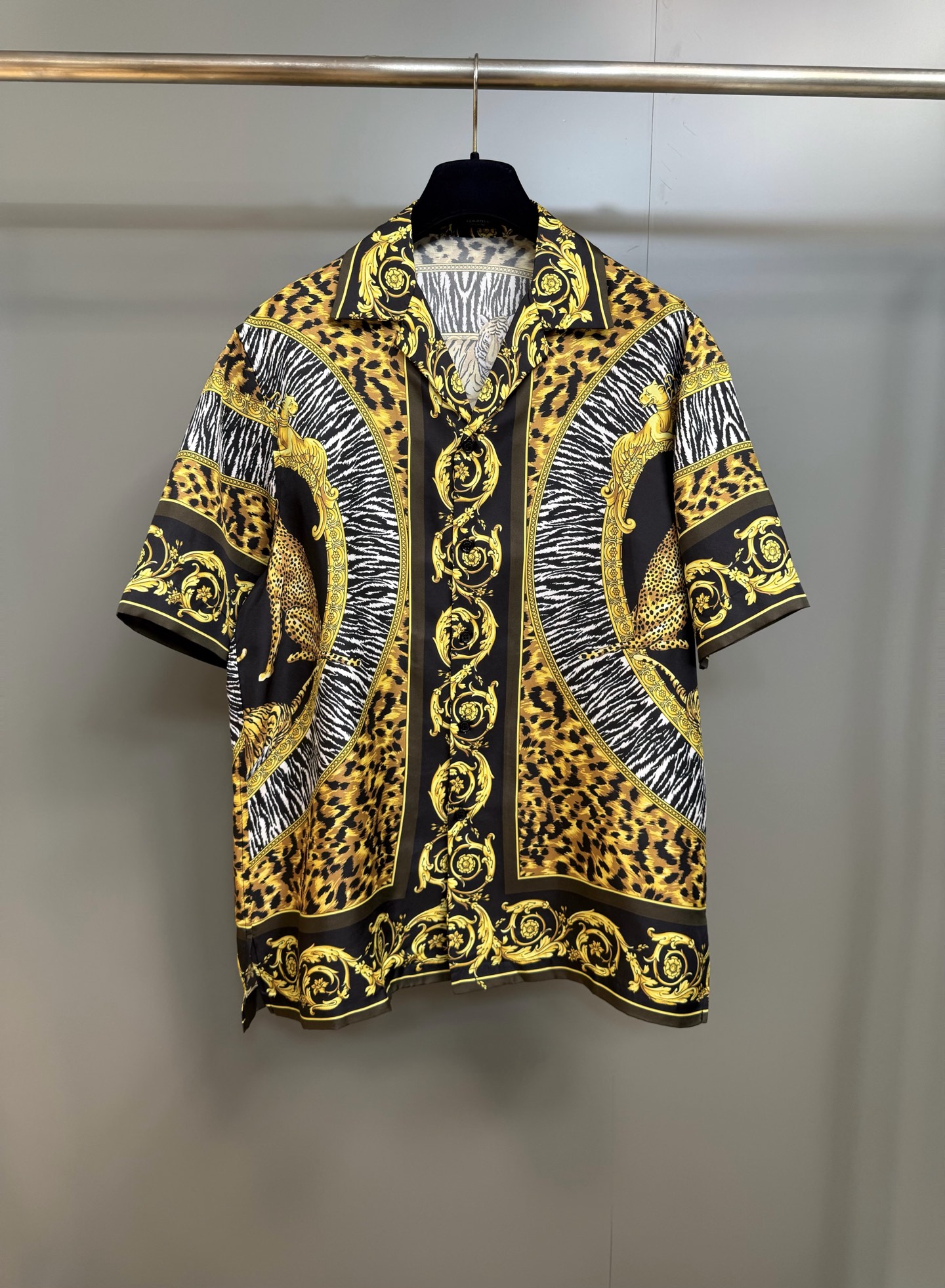 Shirt 💯 Mulberry Silk Versace New VS Leopard and Zebra Print Men's Wild Cats Silk Shirt, twill short-sleeve shirt, fully decorated with Wild Cats print, reinterpreted with zebra and leopard patterns to refresh the classic animal kingdom print, Wild Cats print, short sleeves, notch lapel, front button closure. Fabric: 100% mulberry silk!