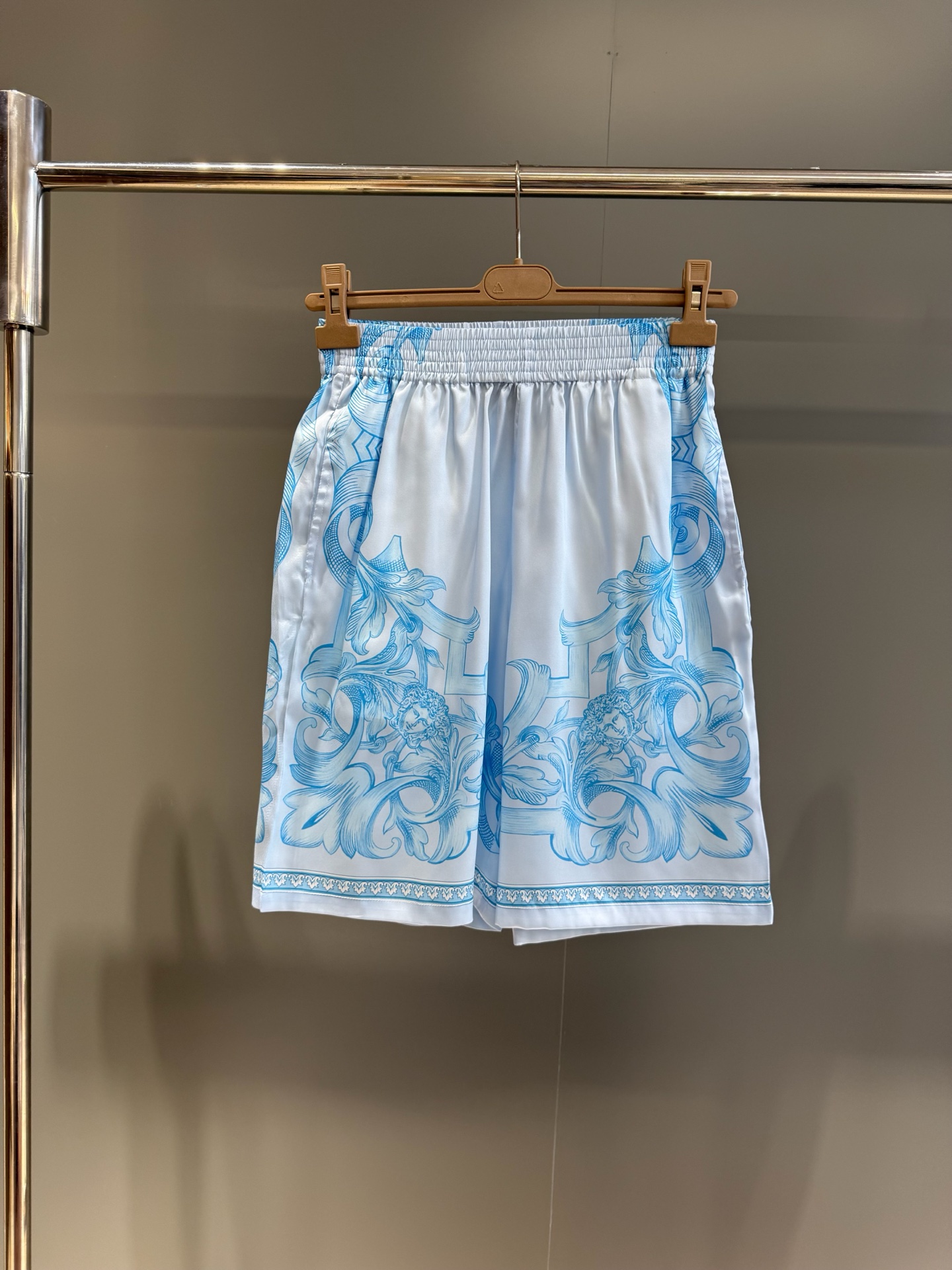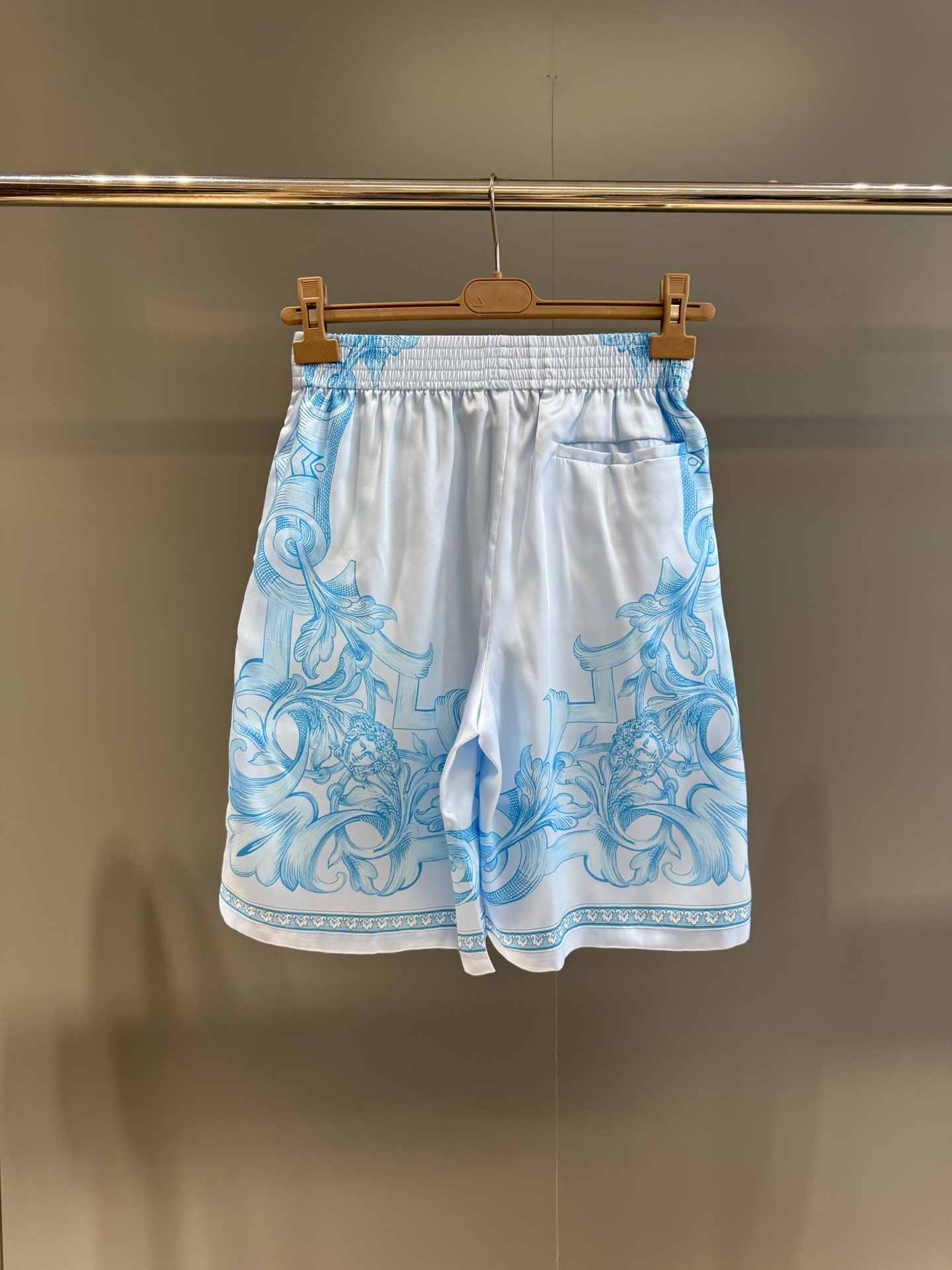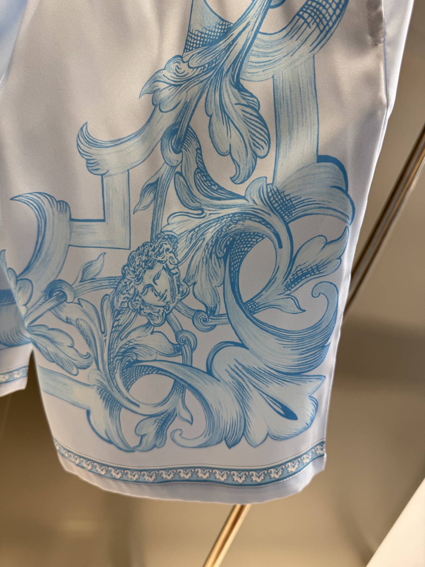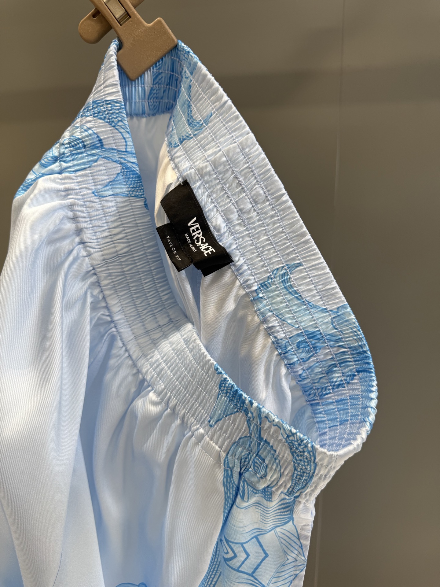 New VS BAROCCO SEA tech silk shorts, knee-length shorts, crafted from silk twill, adorned with Barocco Sea print, Barocco Sea print, side pockets, back welt pockets, elastic waistband. Fabric: 100% tech silk.