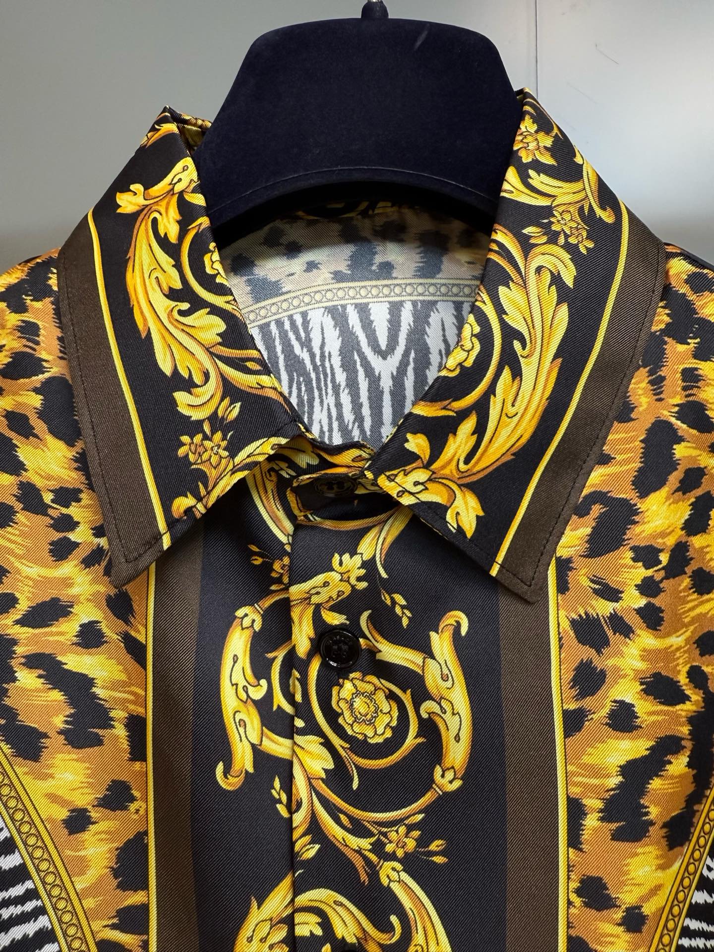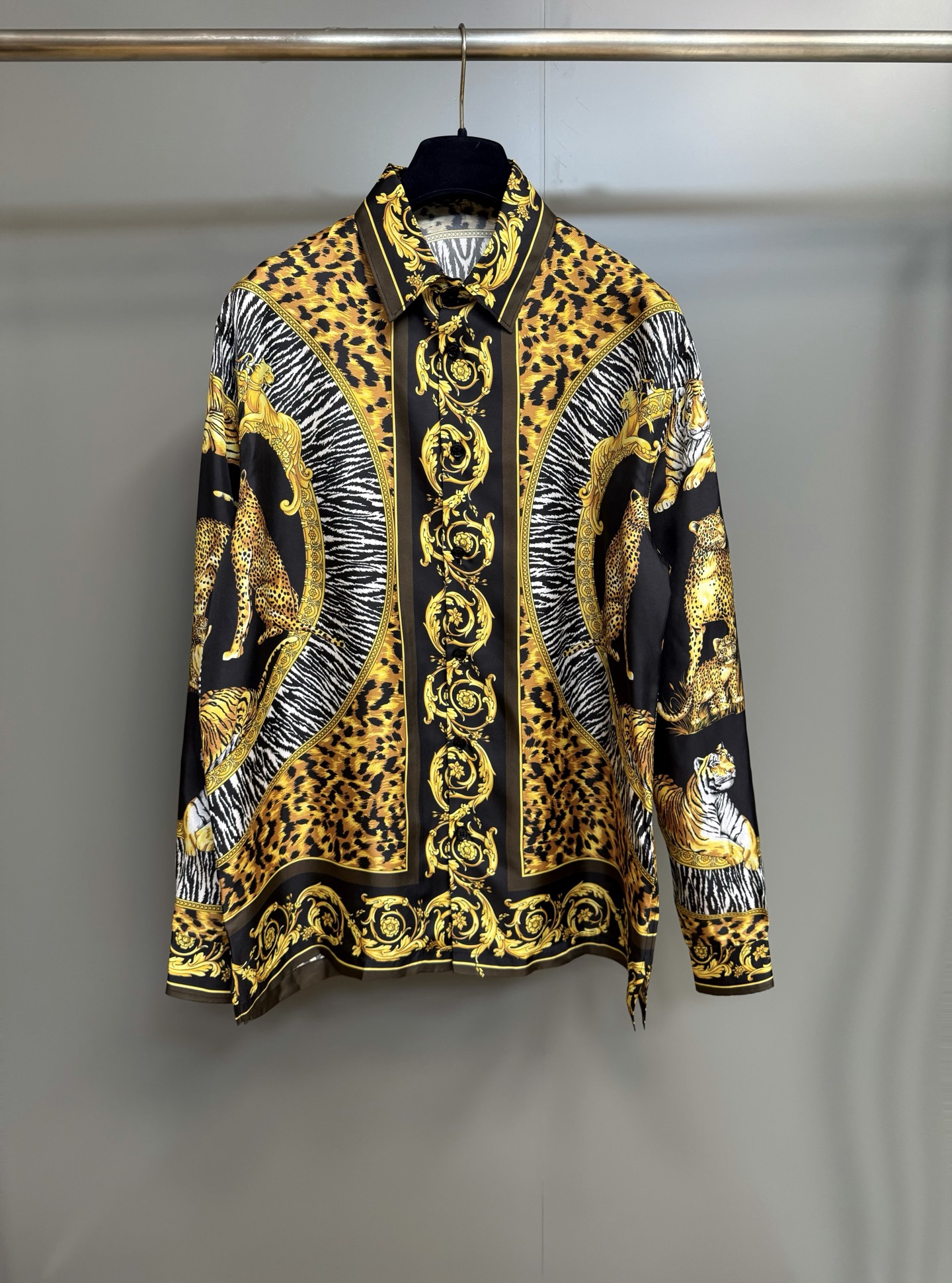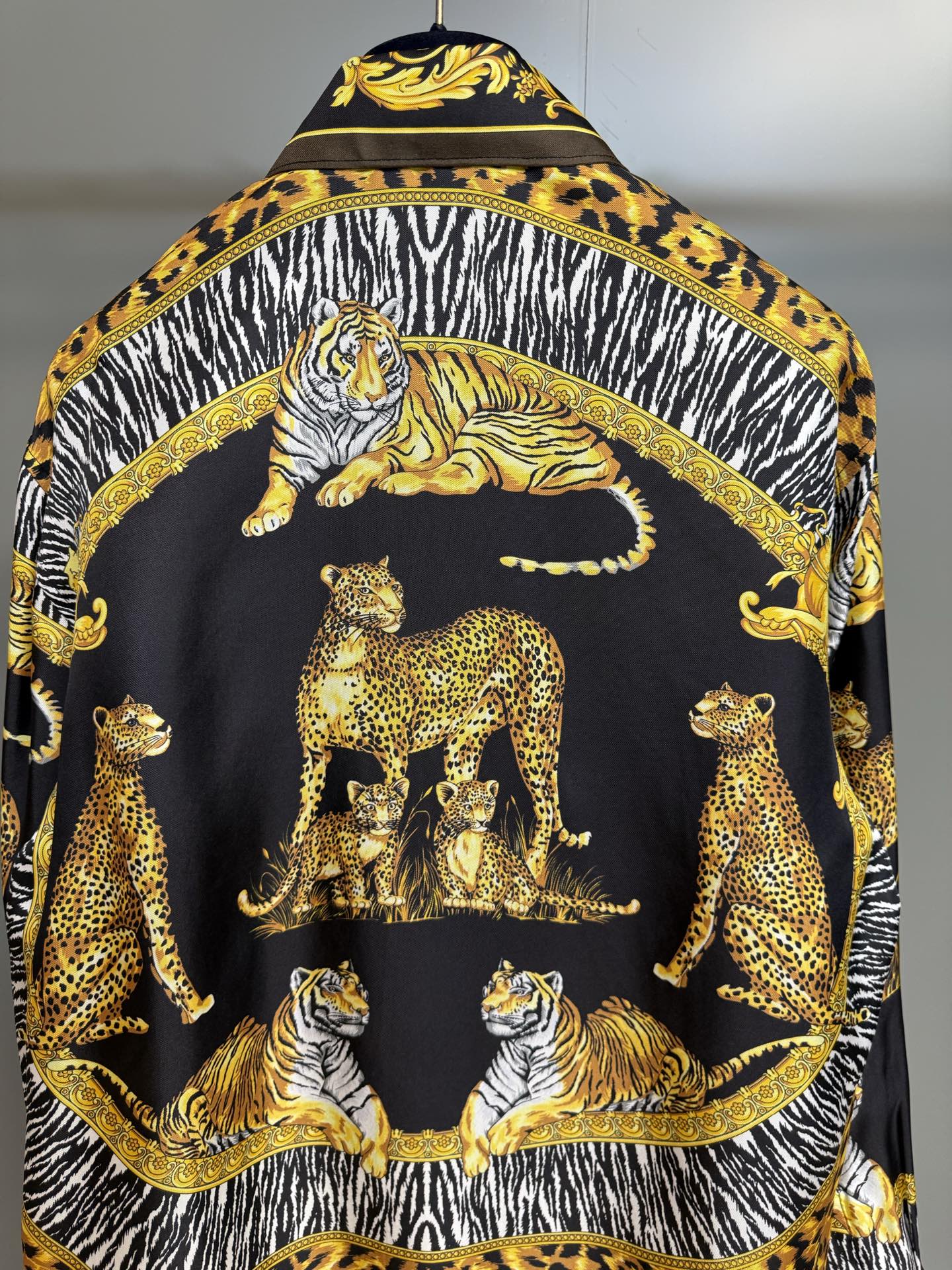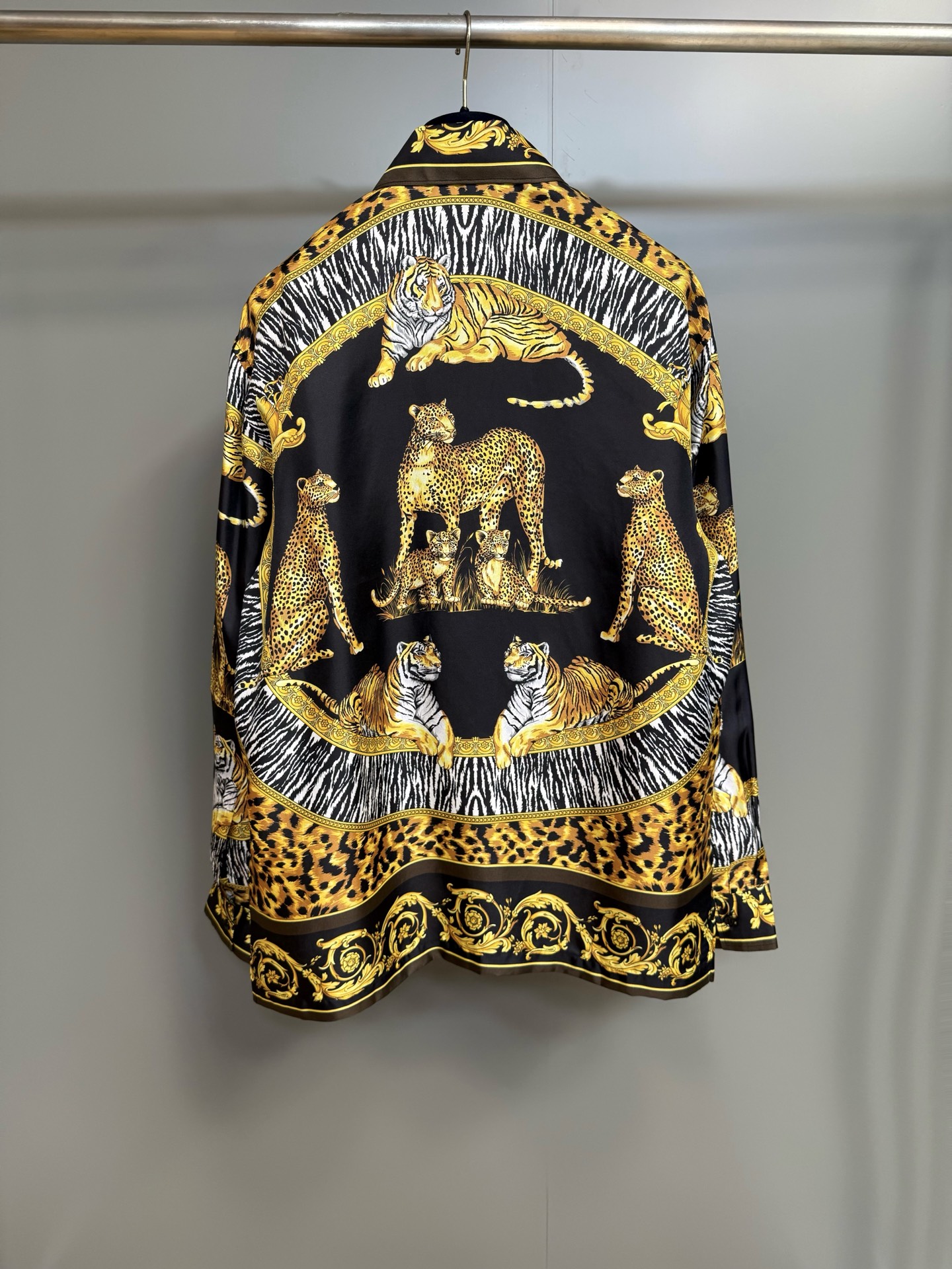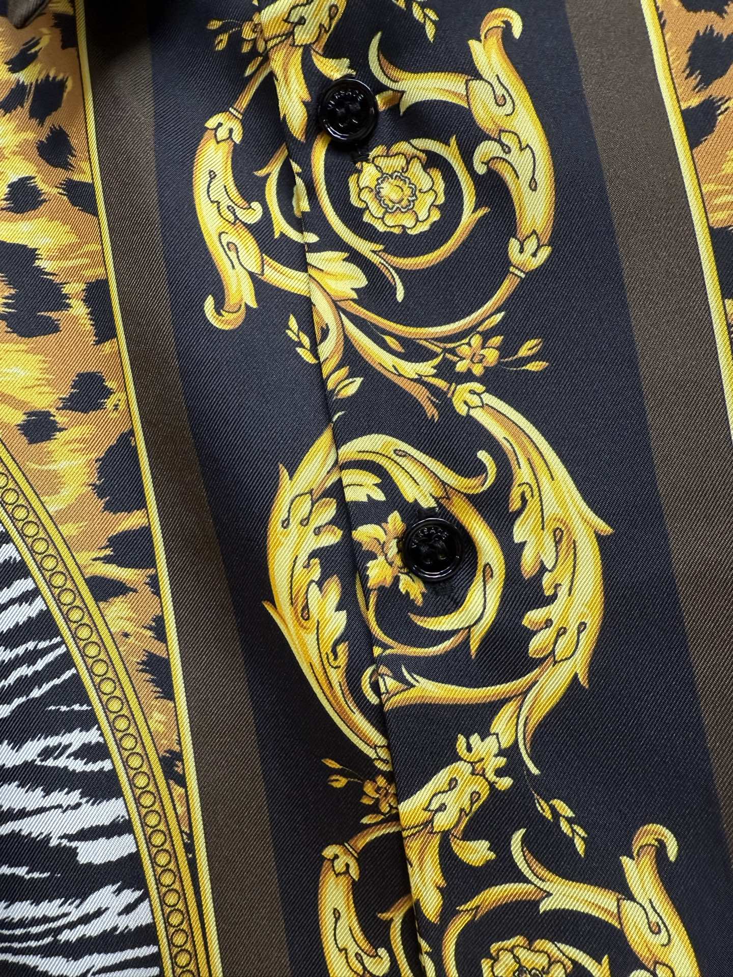 P600 Silk Versace This long-sleeve regular-fit shirt is made of twill silk fabric, adorned with a Wild Cats pattern. Inspired by a modern interpretation of the brand's archival prints, it incorporates zebra and leopard textures into the animal kingdom theme, showcasing a wild and elegant style.