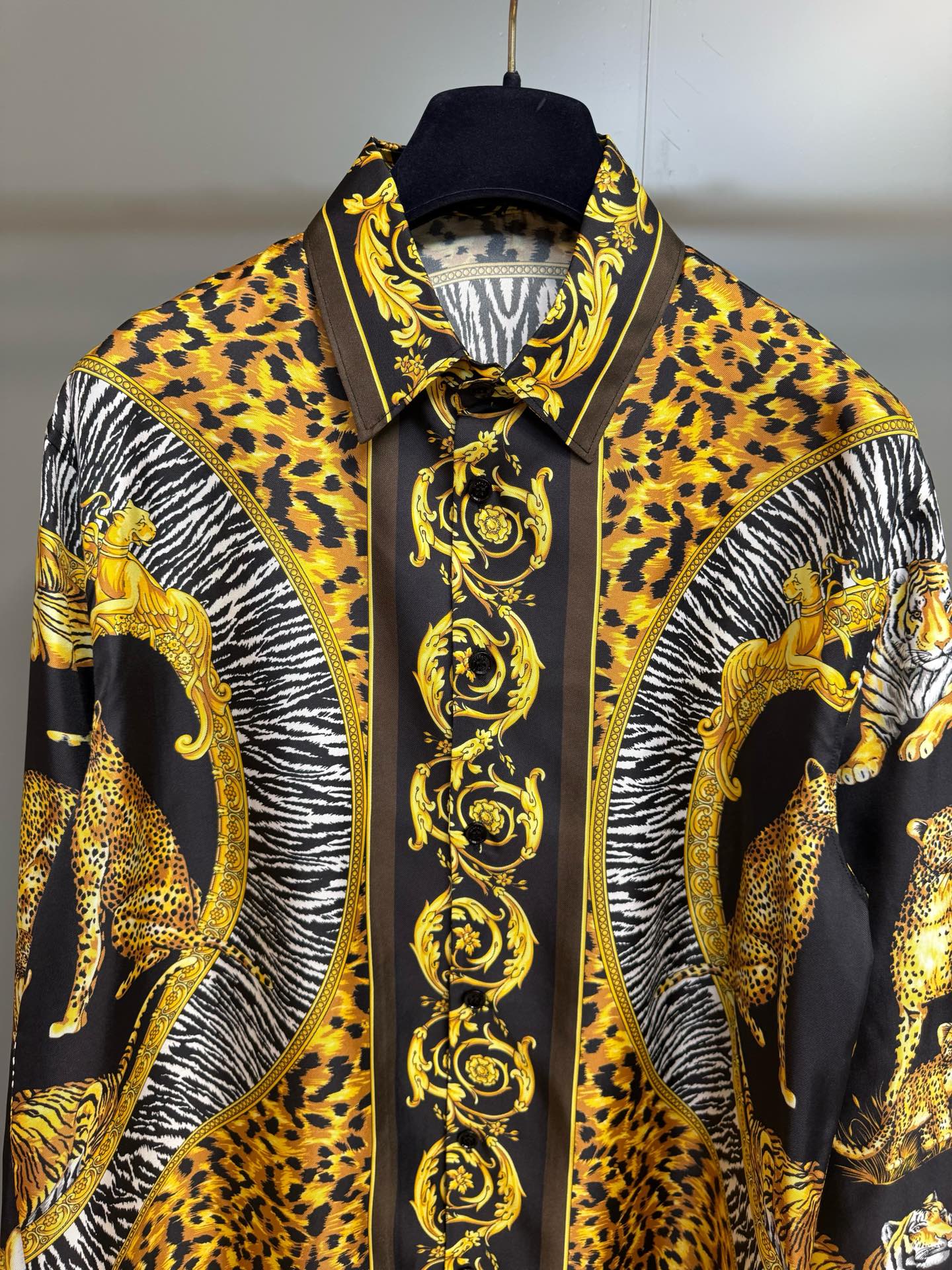 << Wild Cats print Long sleeves Pointed collar Front button closure Button cuffs << Fabric: 100% silk <<