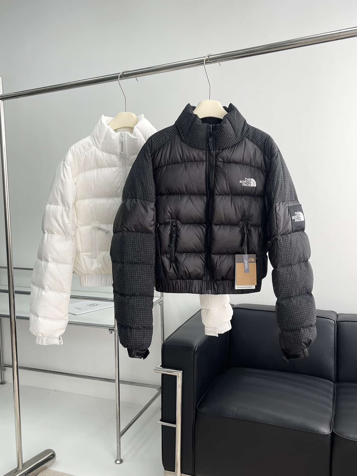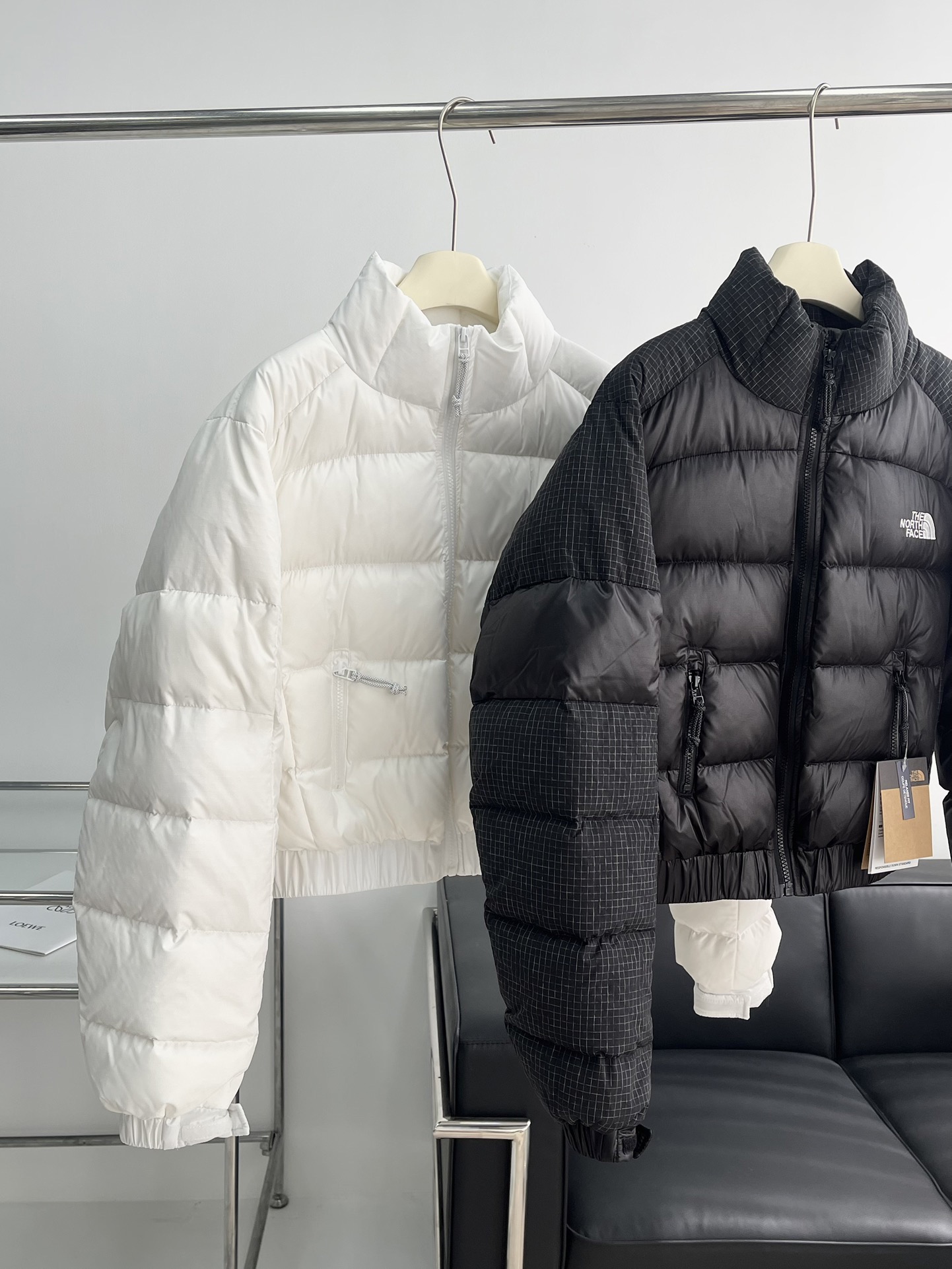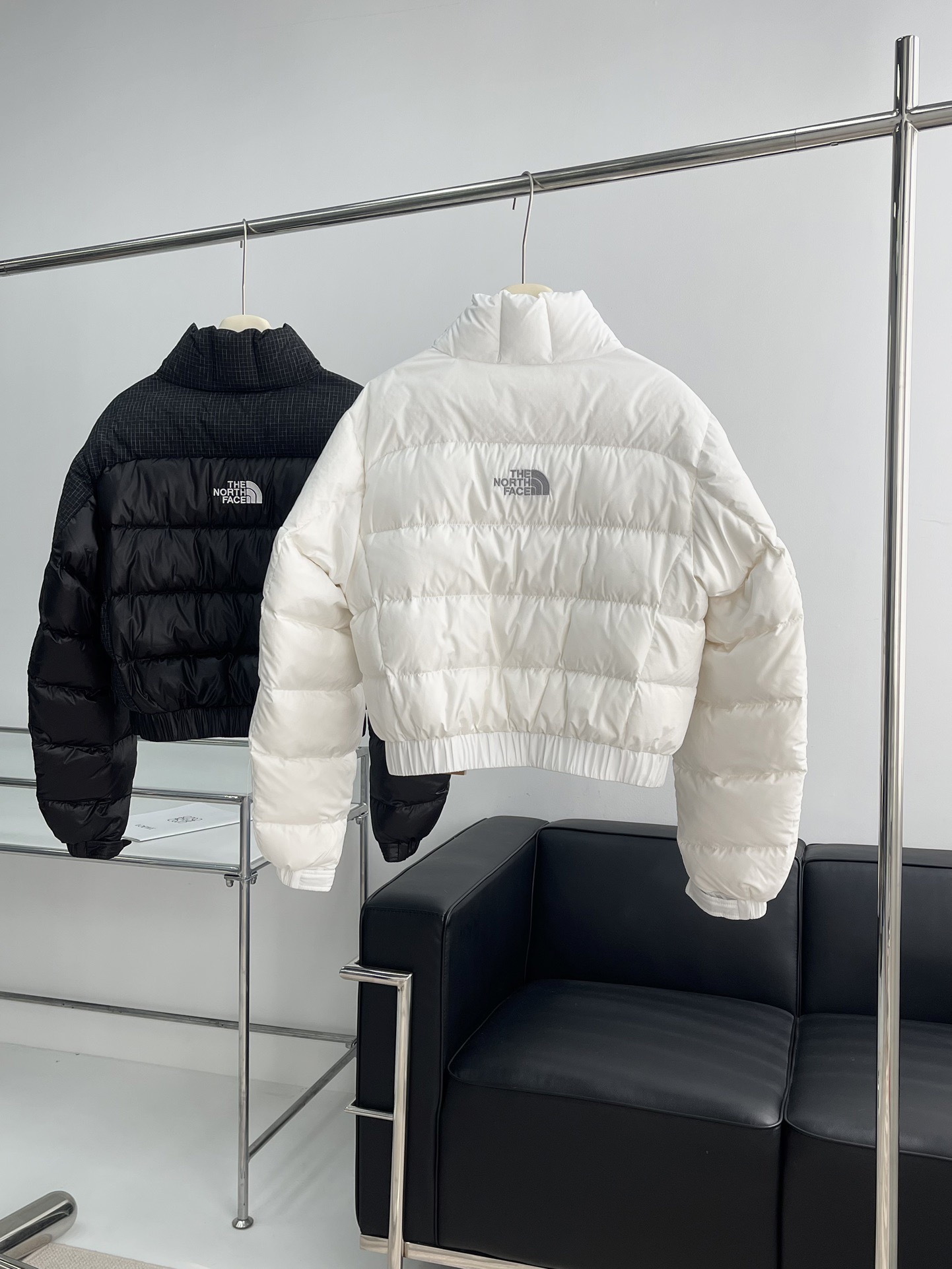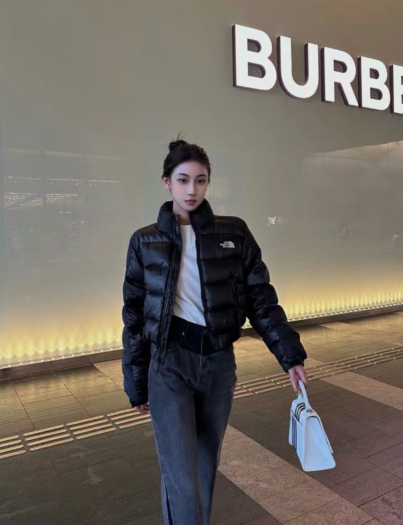 It's extremely popular, worn by various celebrities and internet influencers. Paired with high-waisted pants to make legs appear longer, it's the most suitable North Face down jacket for women. Black is versatile and slimming, the stand-up collar design highlights personal charm, windproof and cold-resistant, offering comfort and leisure. The拼接格子点睛 details add just the right sense of fashion, showcasing a unique and interesting style. The high-waisted ultra-short design looks very精致 when worn, rejecting a bulky winter. The entire garment is lightweight and warm, accentuating long legs. Short styles are this year's yyds, super cool when worn.