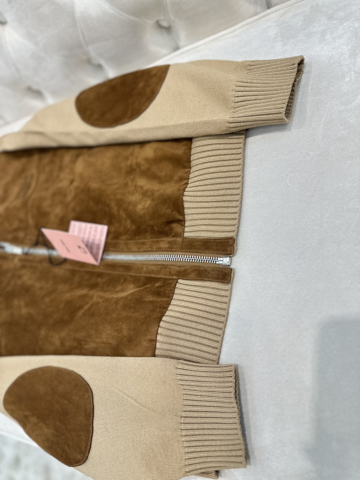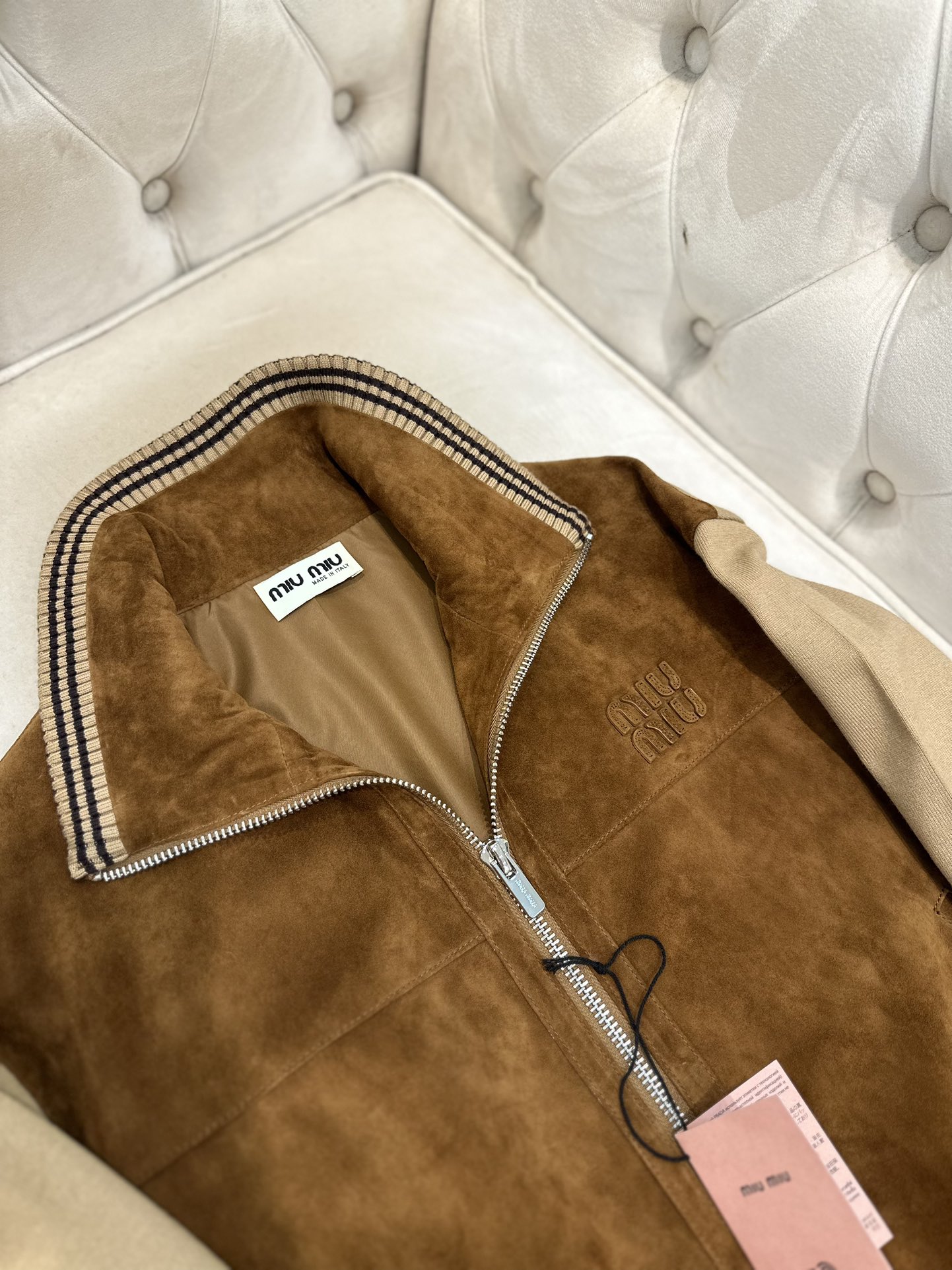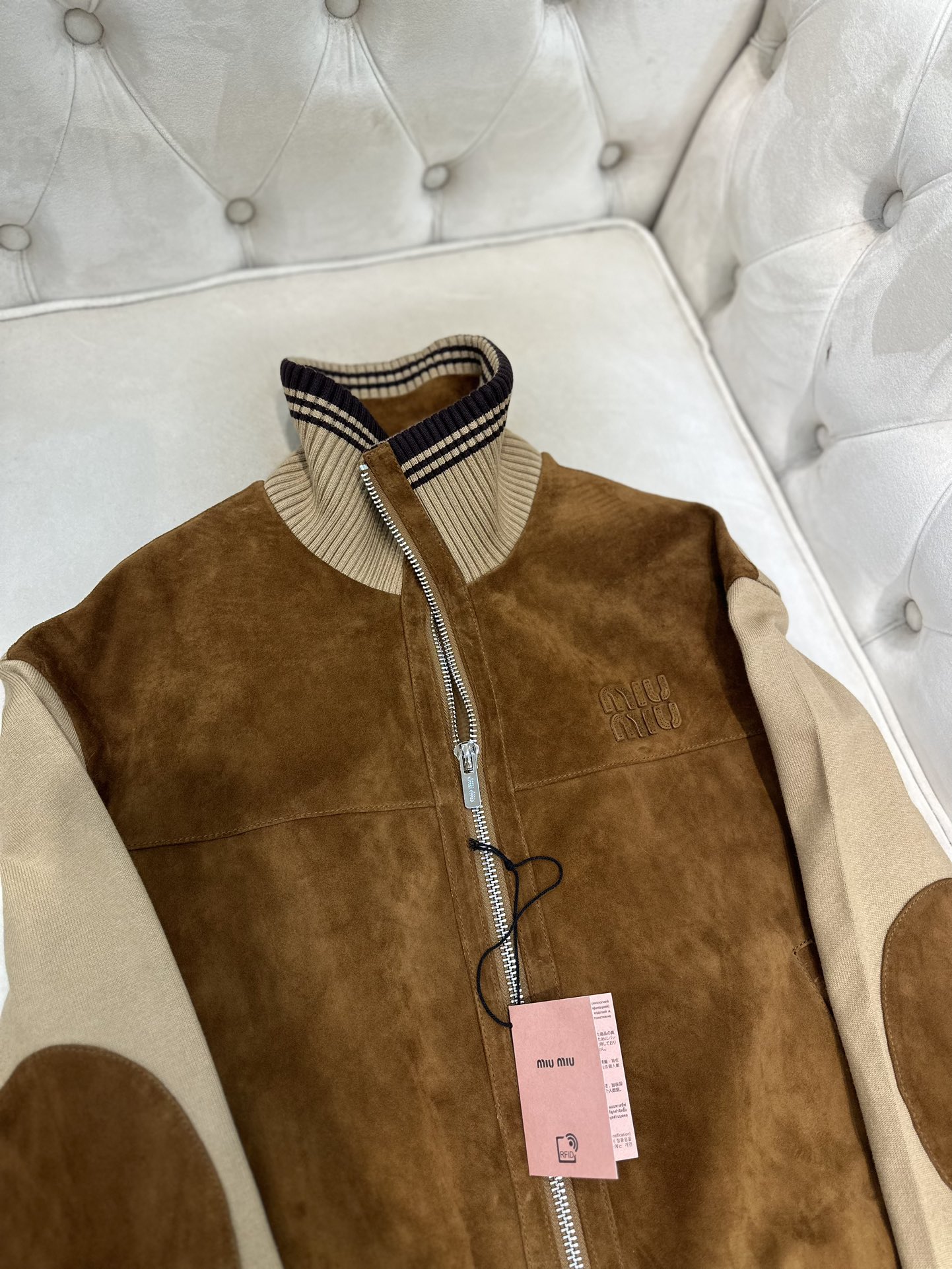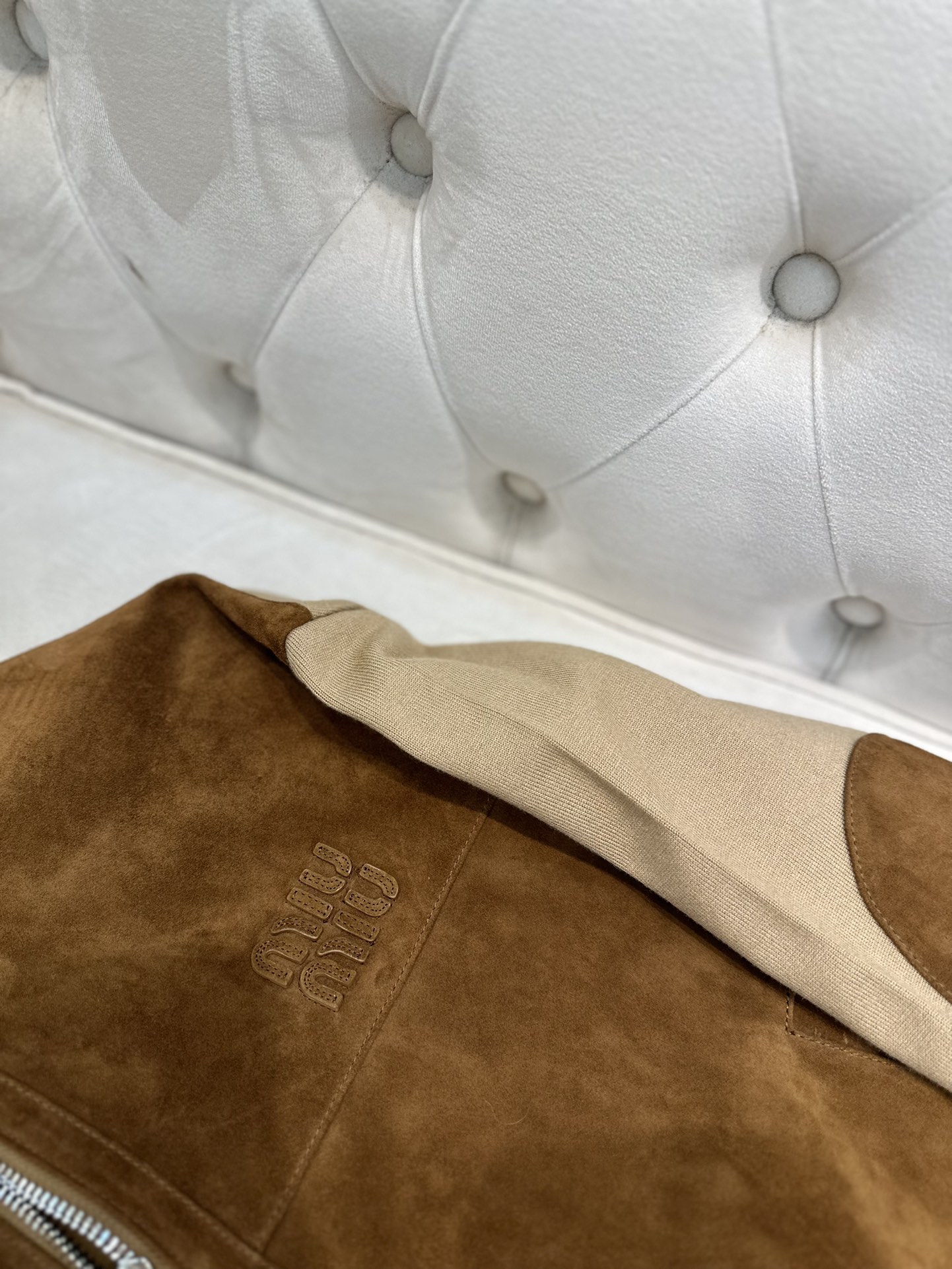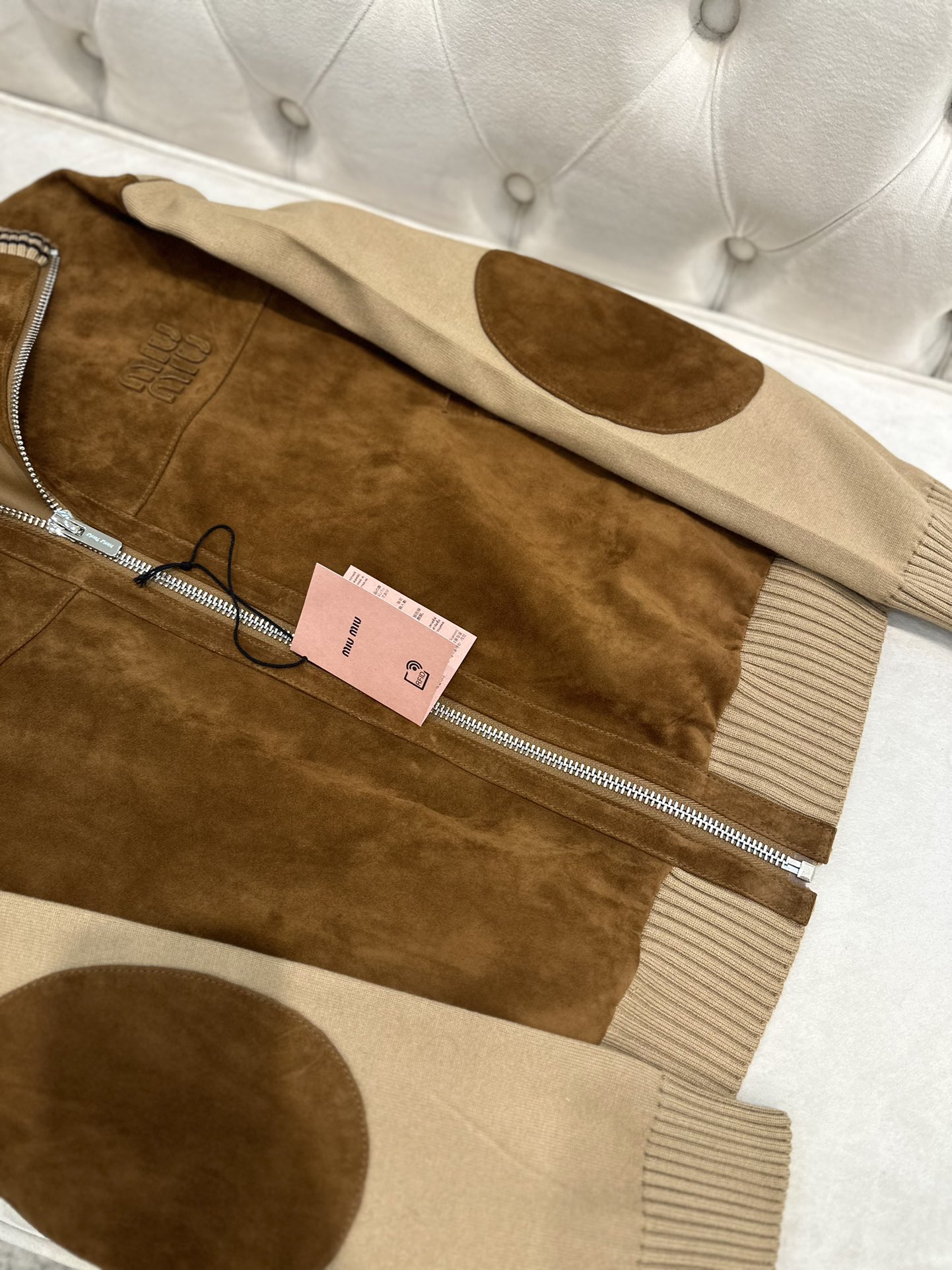 Miumiu 2025 AW Wool cashmere knit blend with goatskin suede baseball jacket Sizes: S-L Material: 100% goatskin