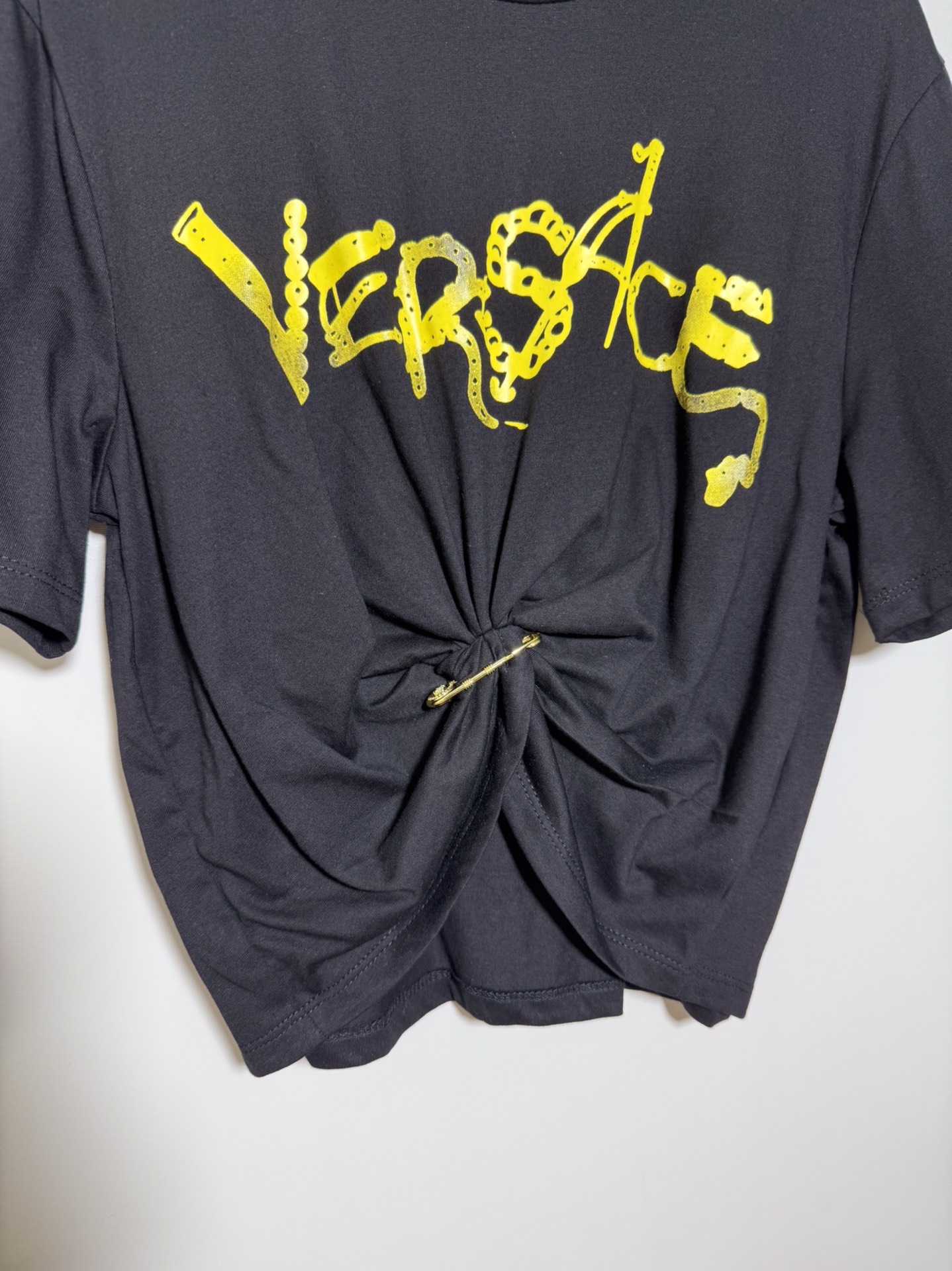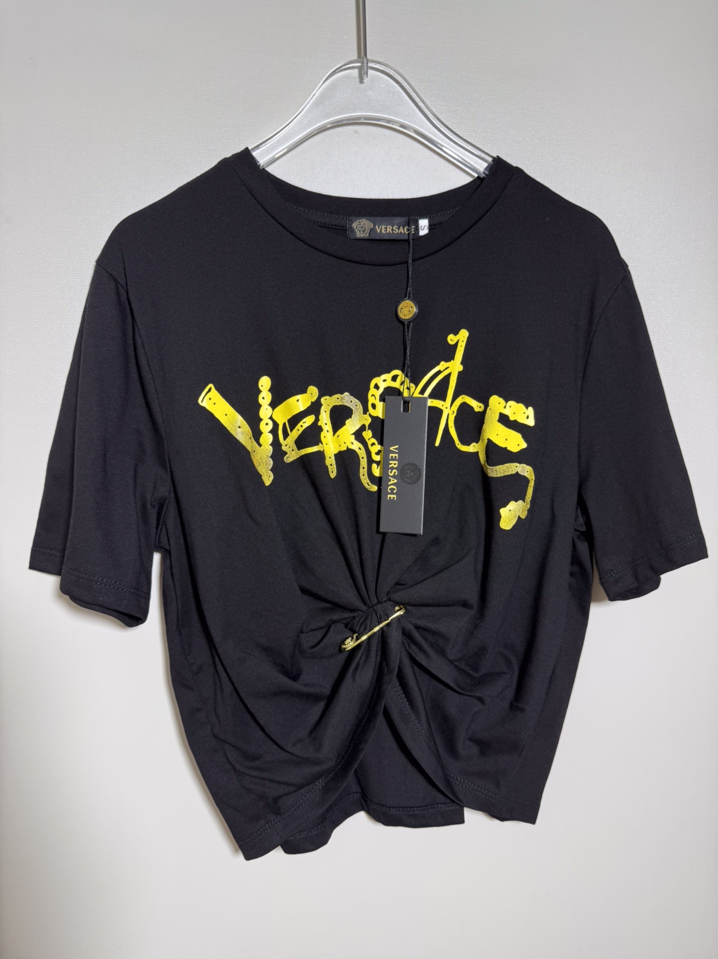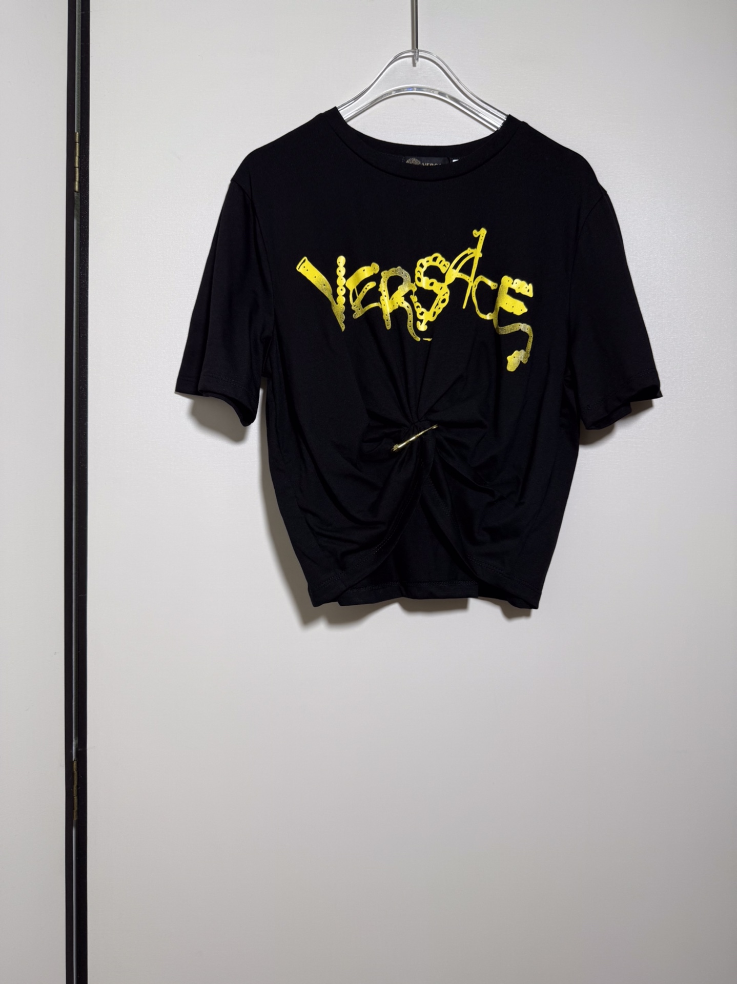 VERSACE Versace popular series women's golden letter print logo pin knot pleated casual short-sleeved embellished crop top. S M L XL