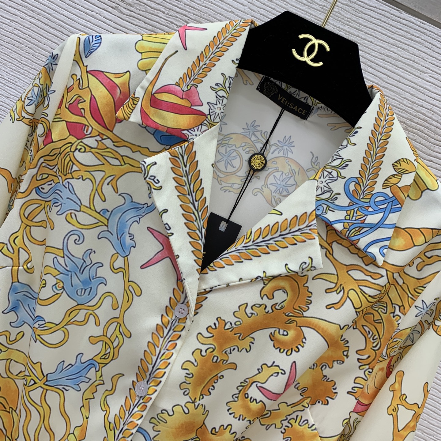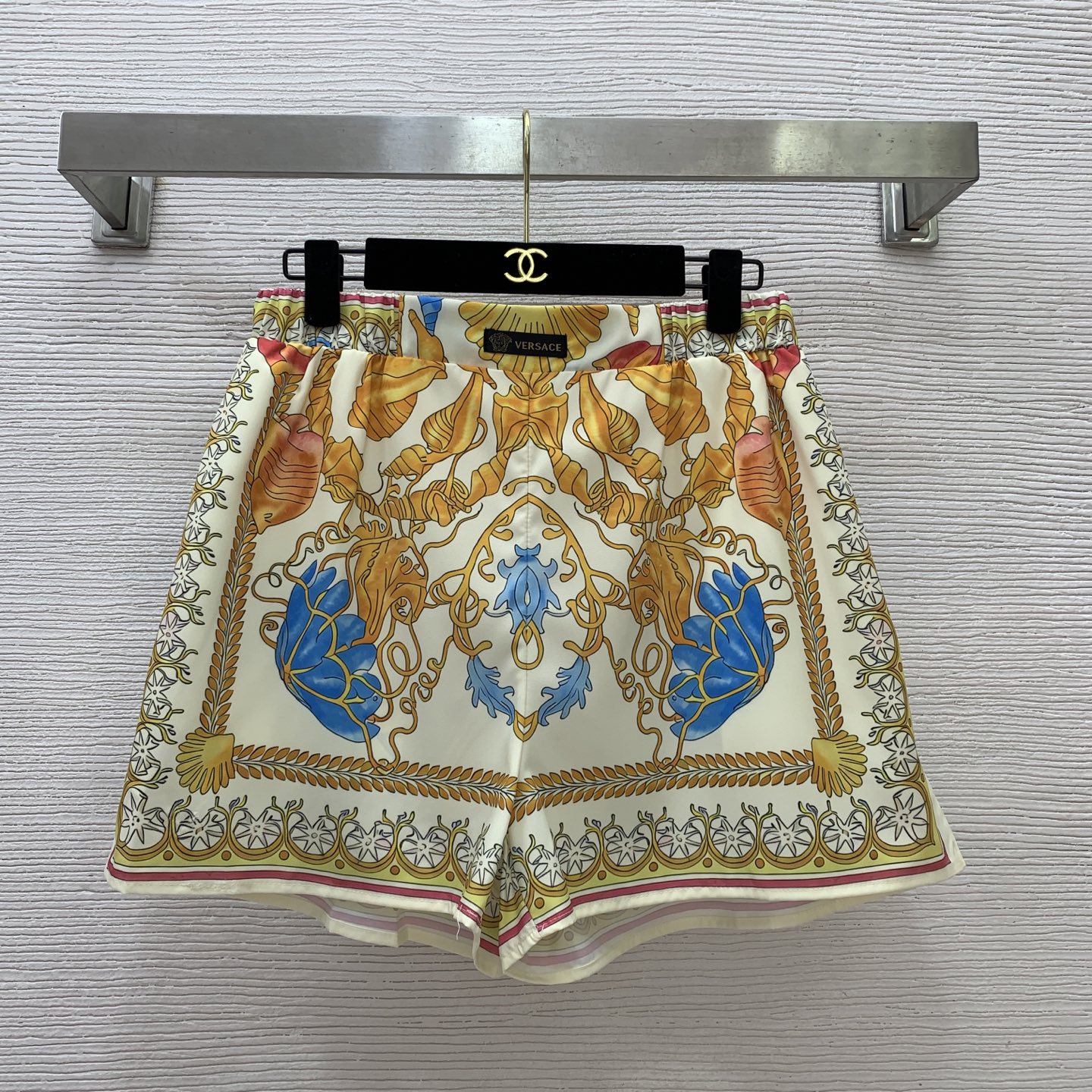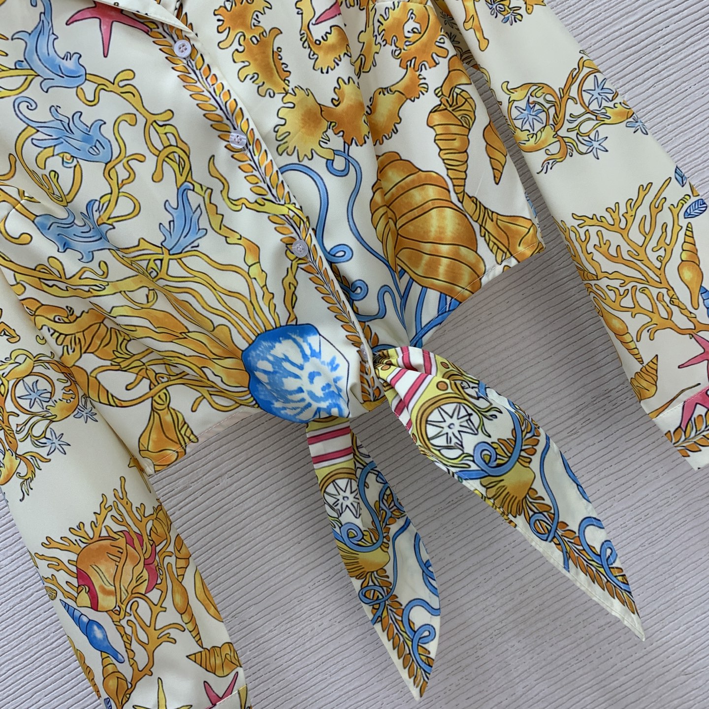 Style No. G25071038 Versac* new starfish, conch, and shell print resort-style fashionable two-piece set! Knotted tie-front small lapel short long-sleeve shirt, sun protection top + loose wide-leg shorts with small fabric tag decoration and elastic waist! S M L XL (Size M: shoulder width 38, bust 100, sleeve length 57, top length 50, waist 70 with back elastic, pants length 38)