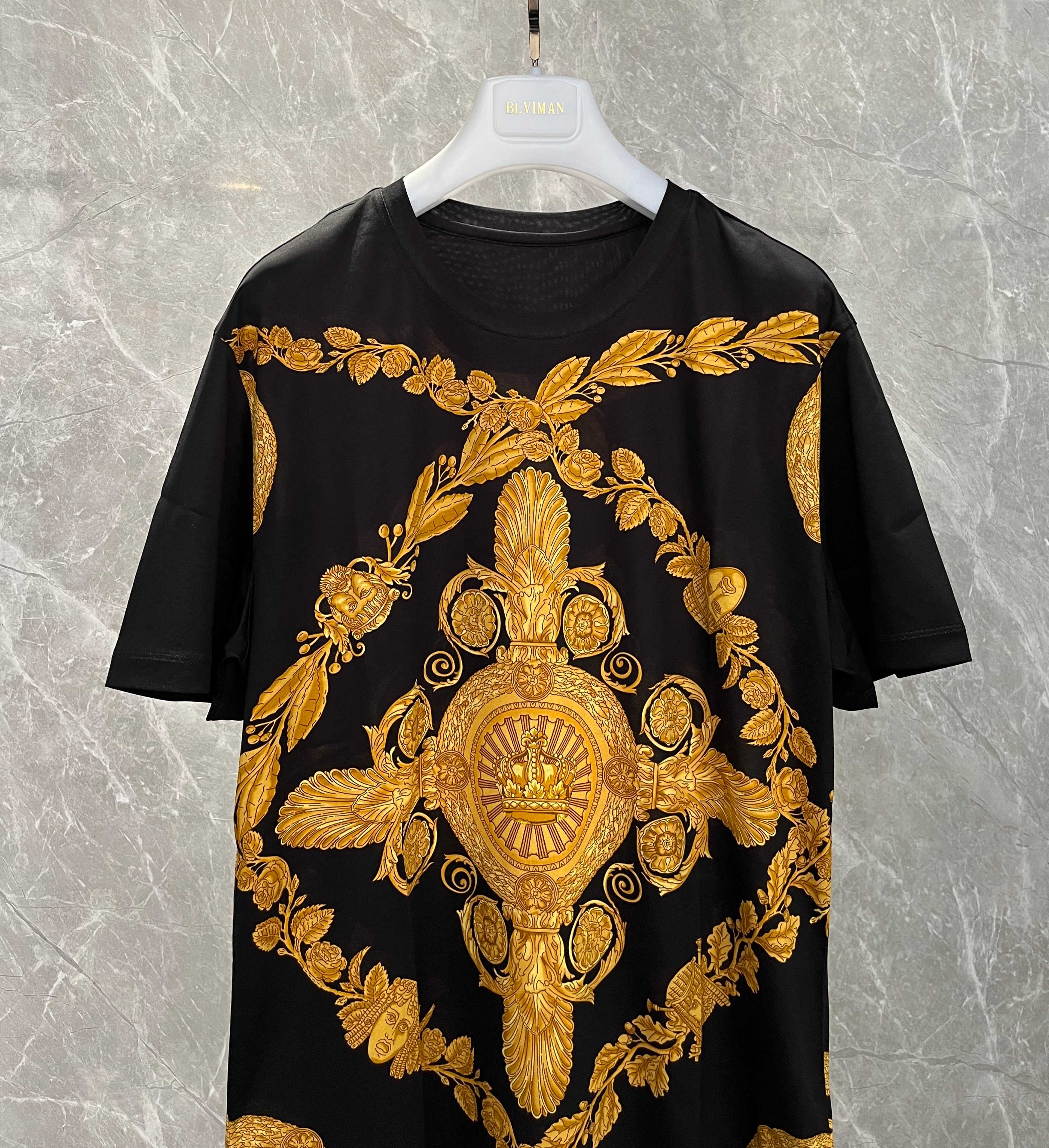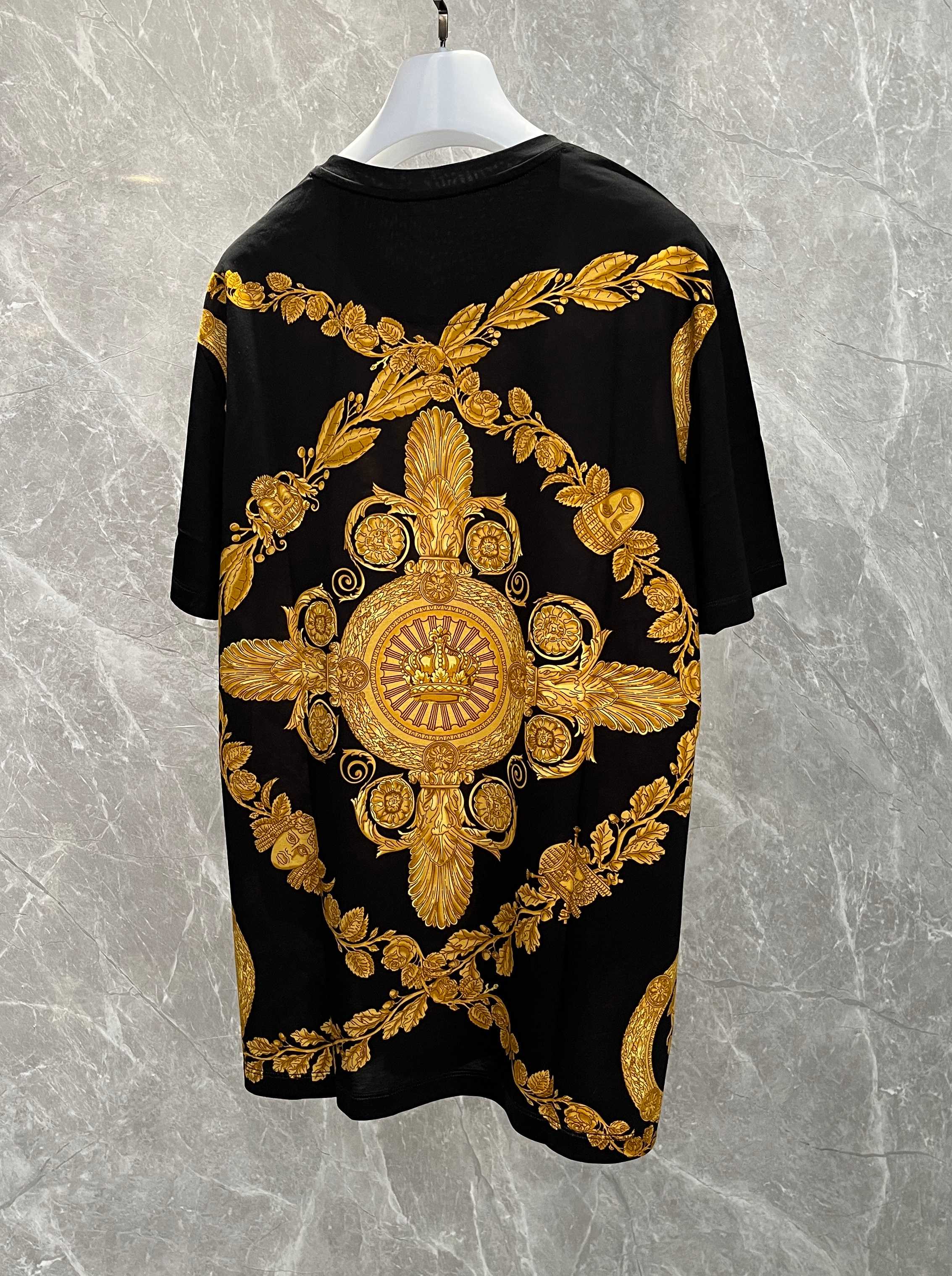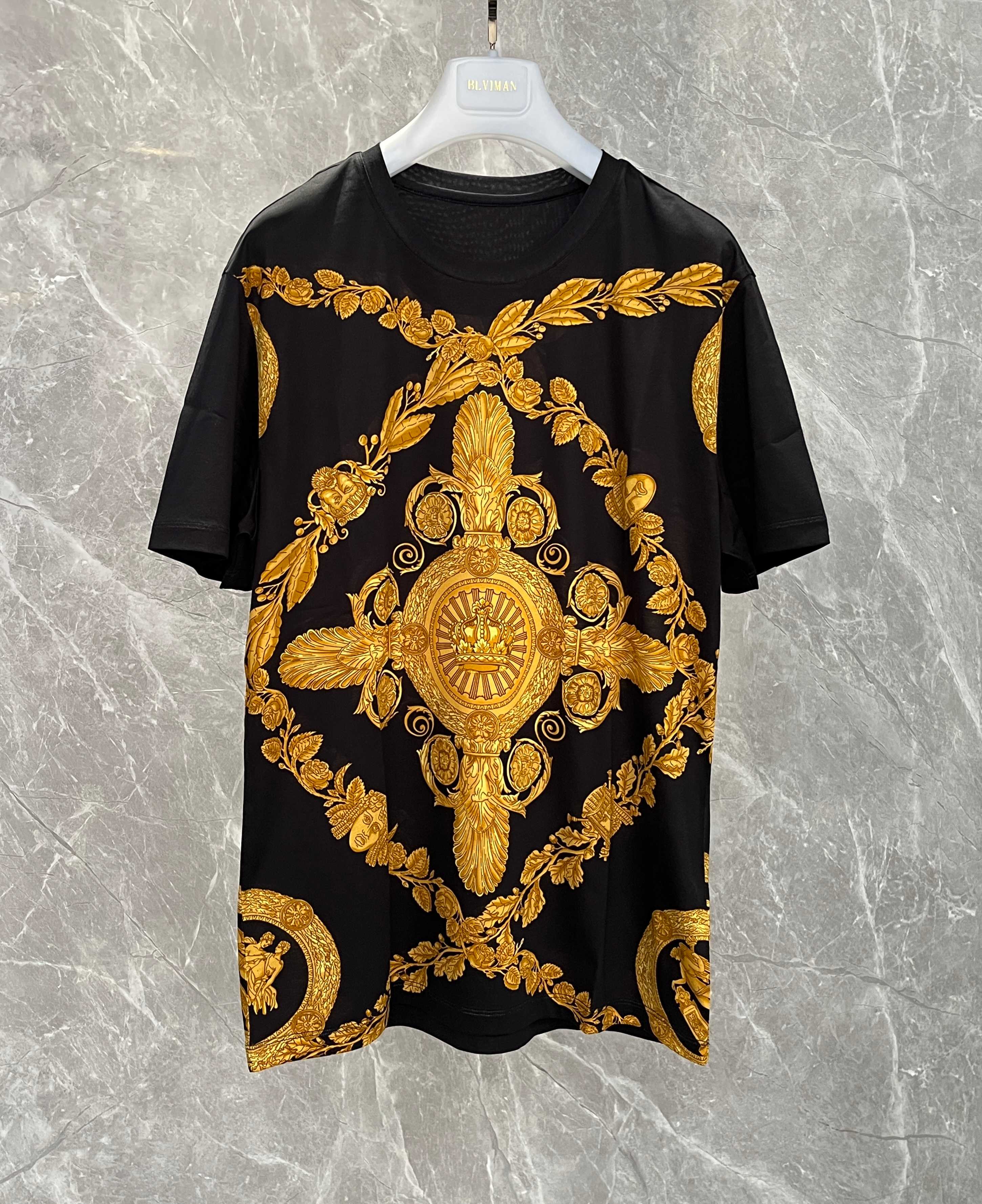 Men's gold baroque black round-neck short-sleeve T-shirt. Sizes: M L XL 2XL 3XL 4XL.