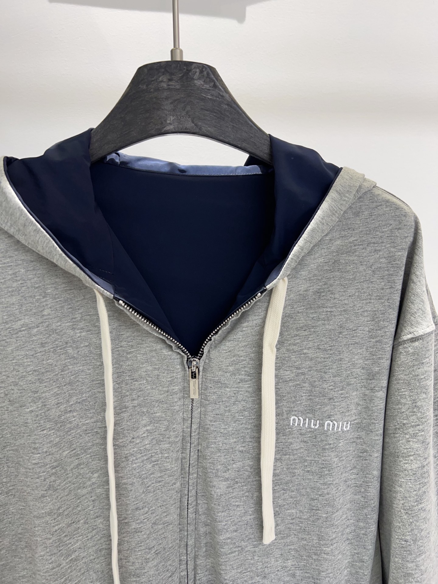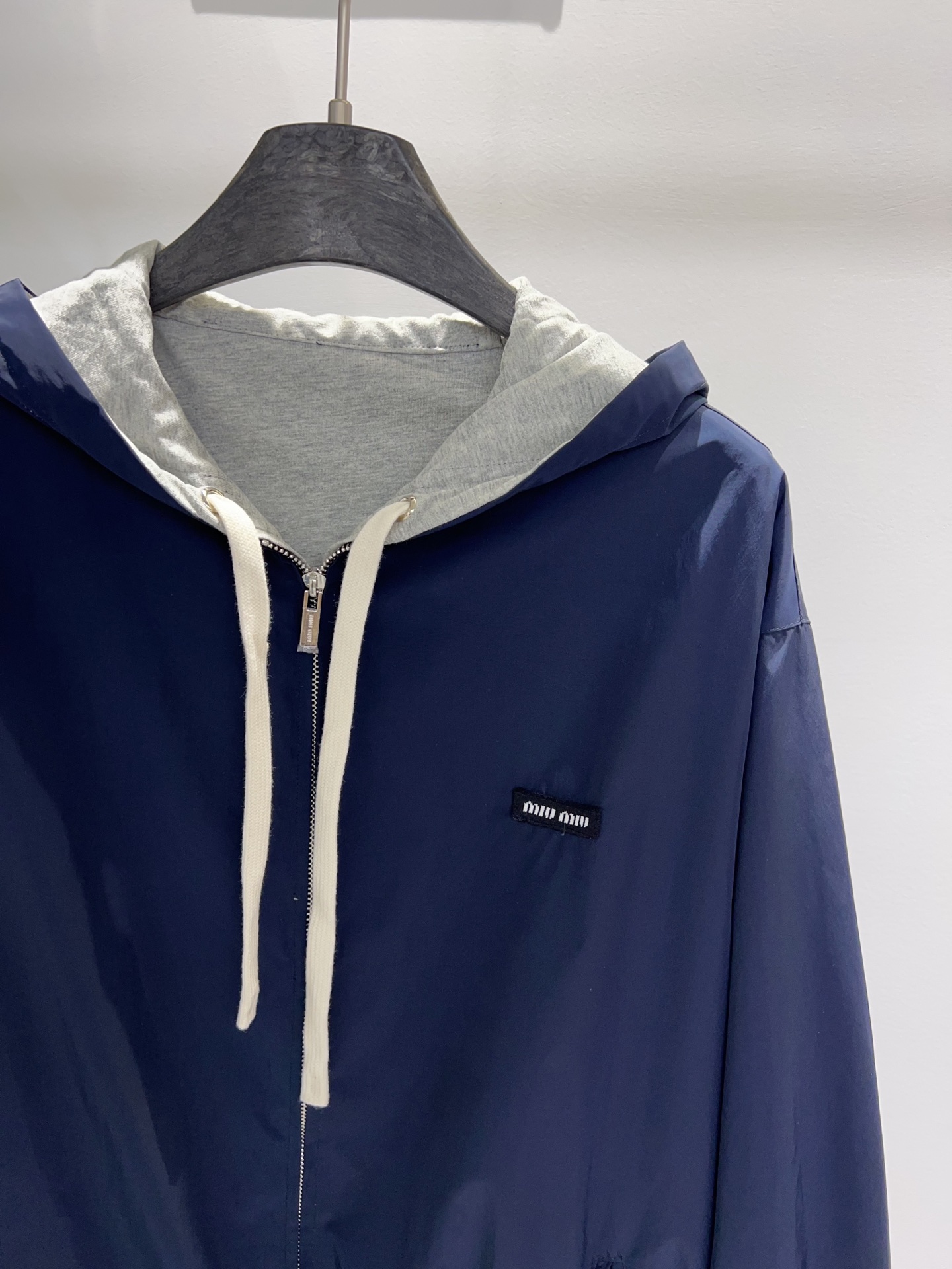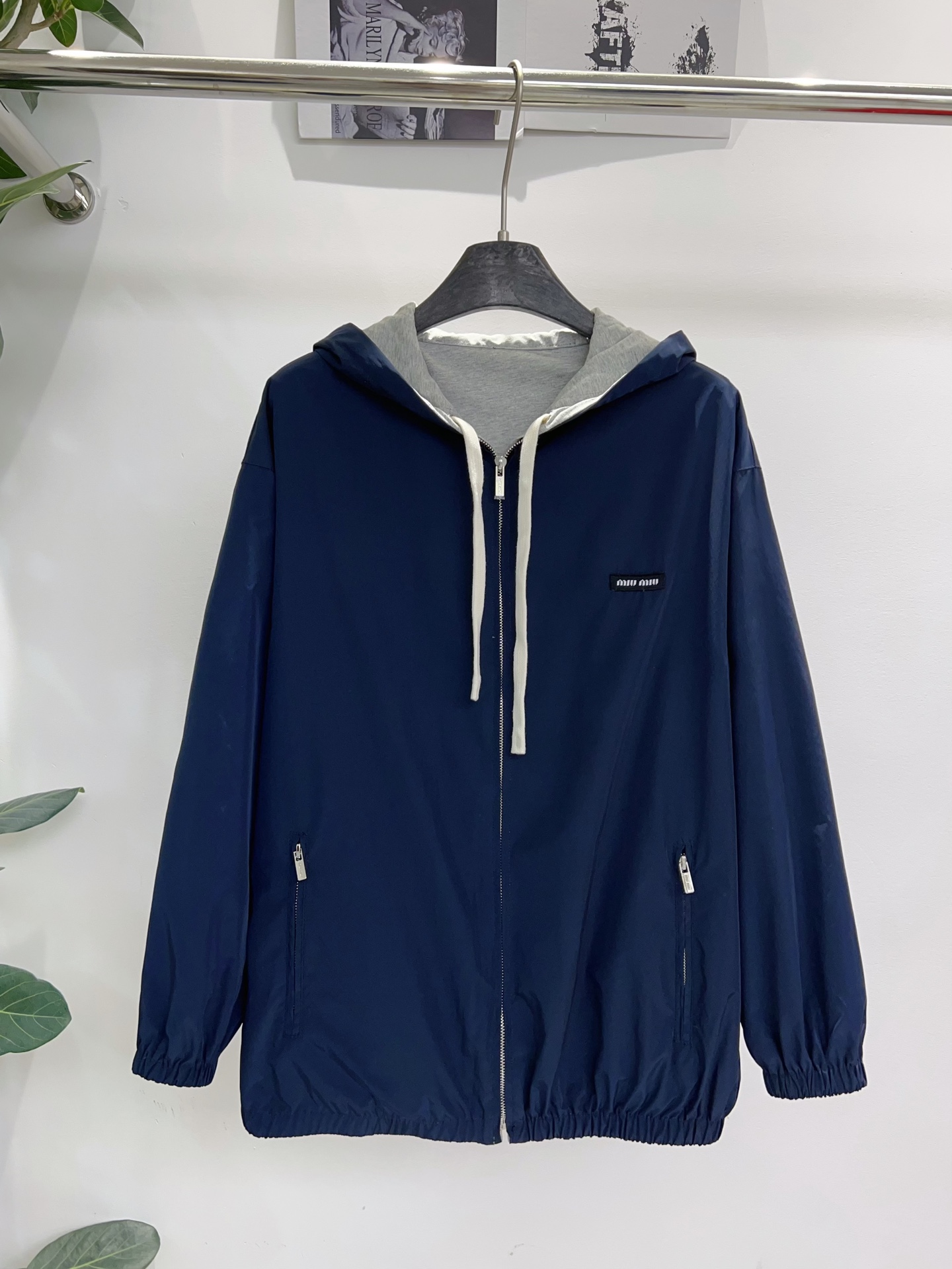 MiuM*i25/New Two-Tone Double-Sided Reversible Zipper Hooded Jacket! Material: One side nylon fabric, one side pure cotton fabric. Can be both edgy and sweet, casual and pure. Embroidered letter logo badge on the chest. Loose zipper silhouette, incredibly versatile. Red/Blue SML