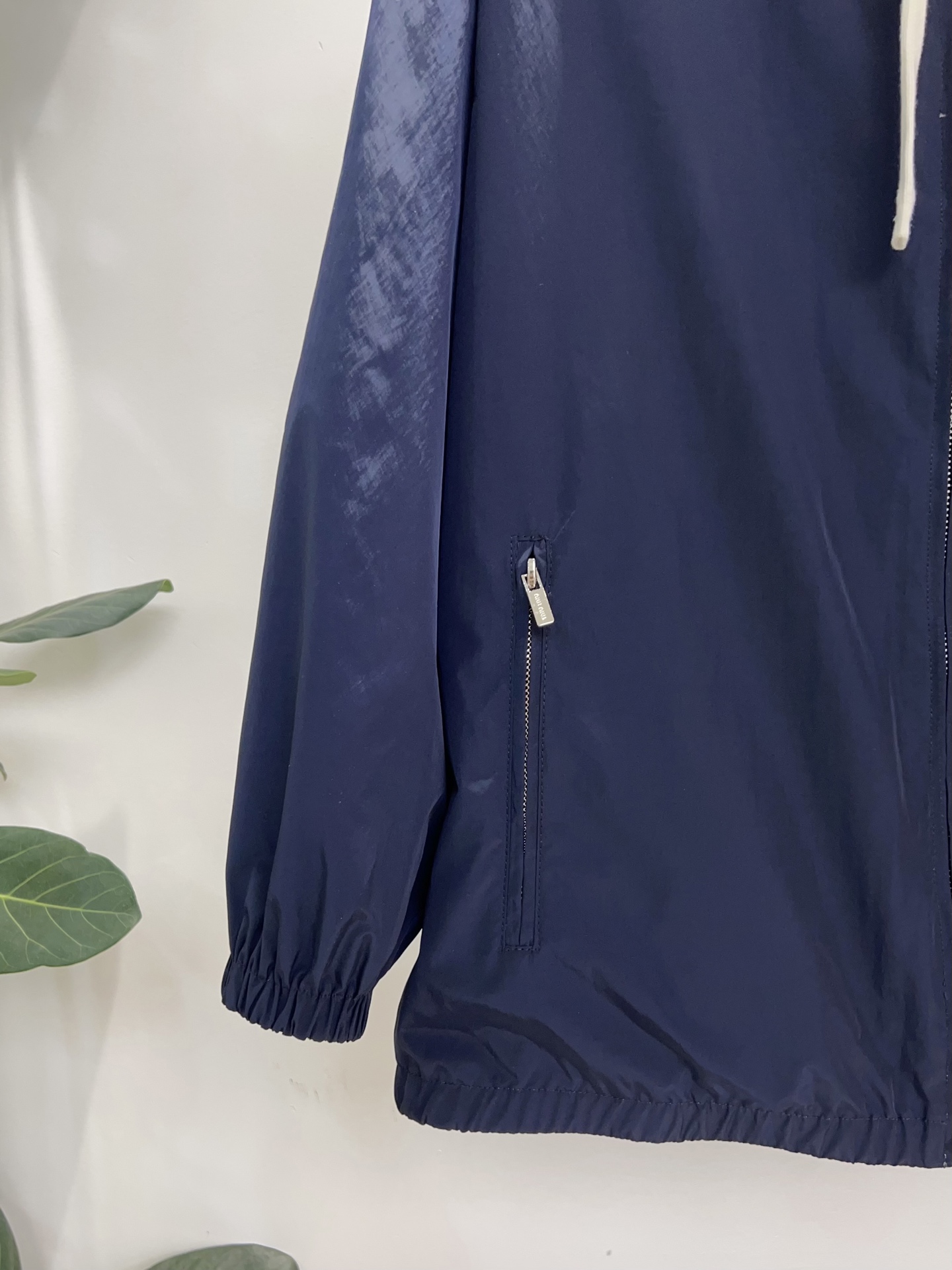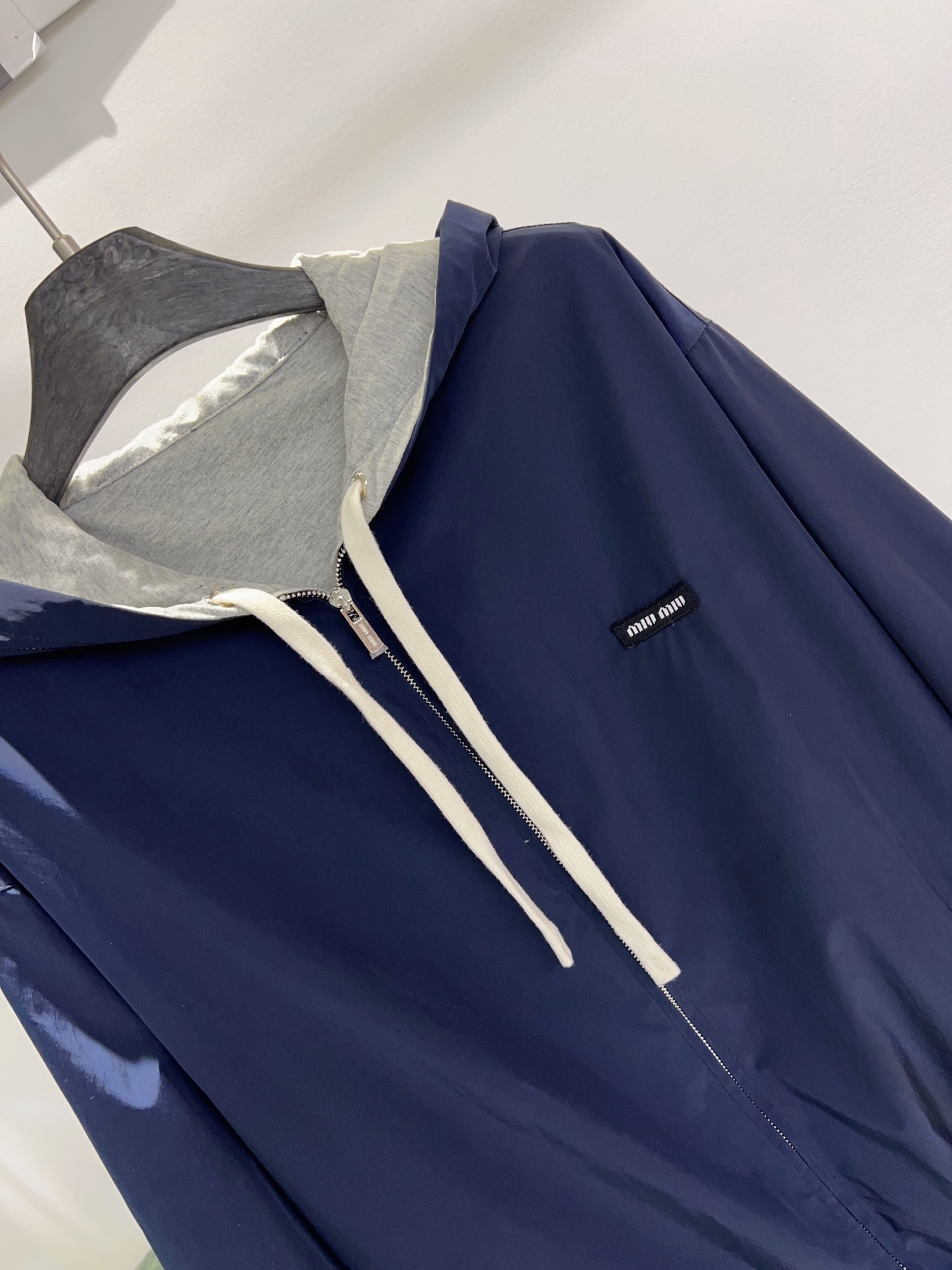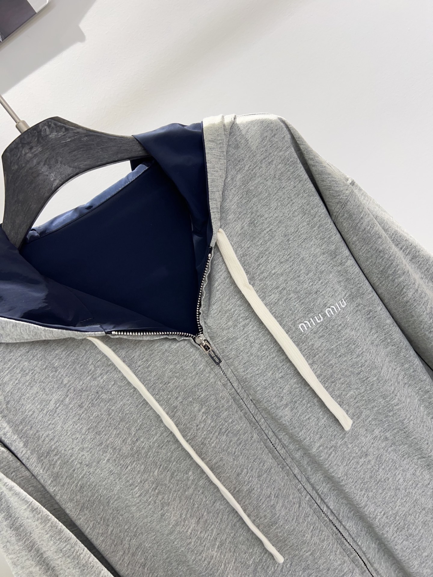 MiuM*i25/New Two-Tone Double-Sided Reversible Zipper Hooded Jacket! Material: One side nylon fabric, one side pure cotton fabric. Can be both edgy and sweet, casual and pure. Embroidered letter logo badge on the chest. Loose zipper silhouette, incredibly versatile. Red/Blue SML