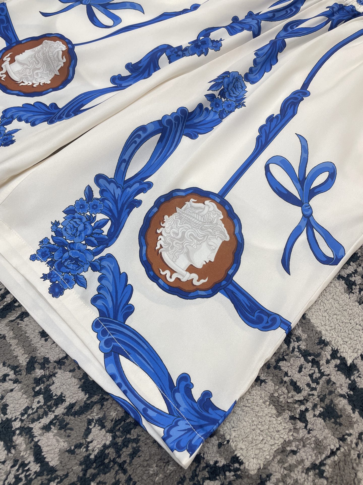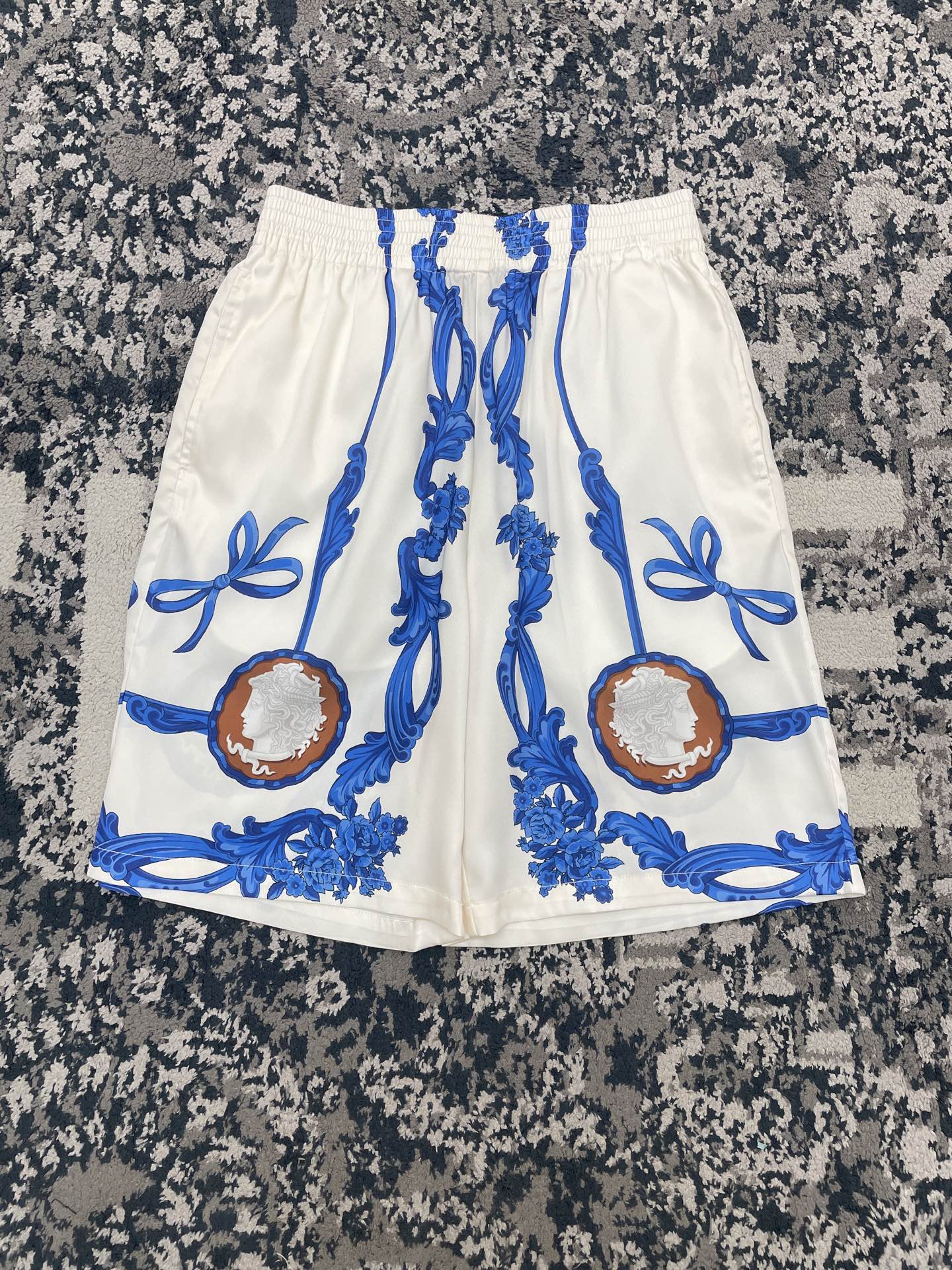 Shorts in technical silk twill, loose silhouette, with overall Medusa Cameo print.