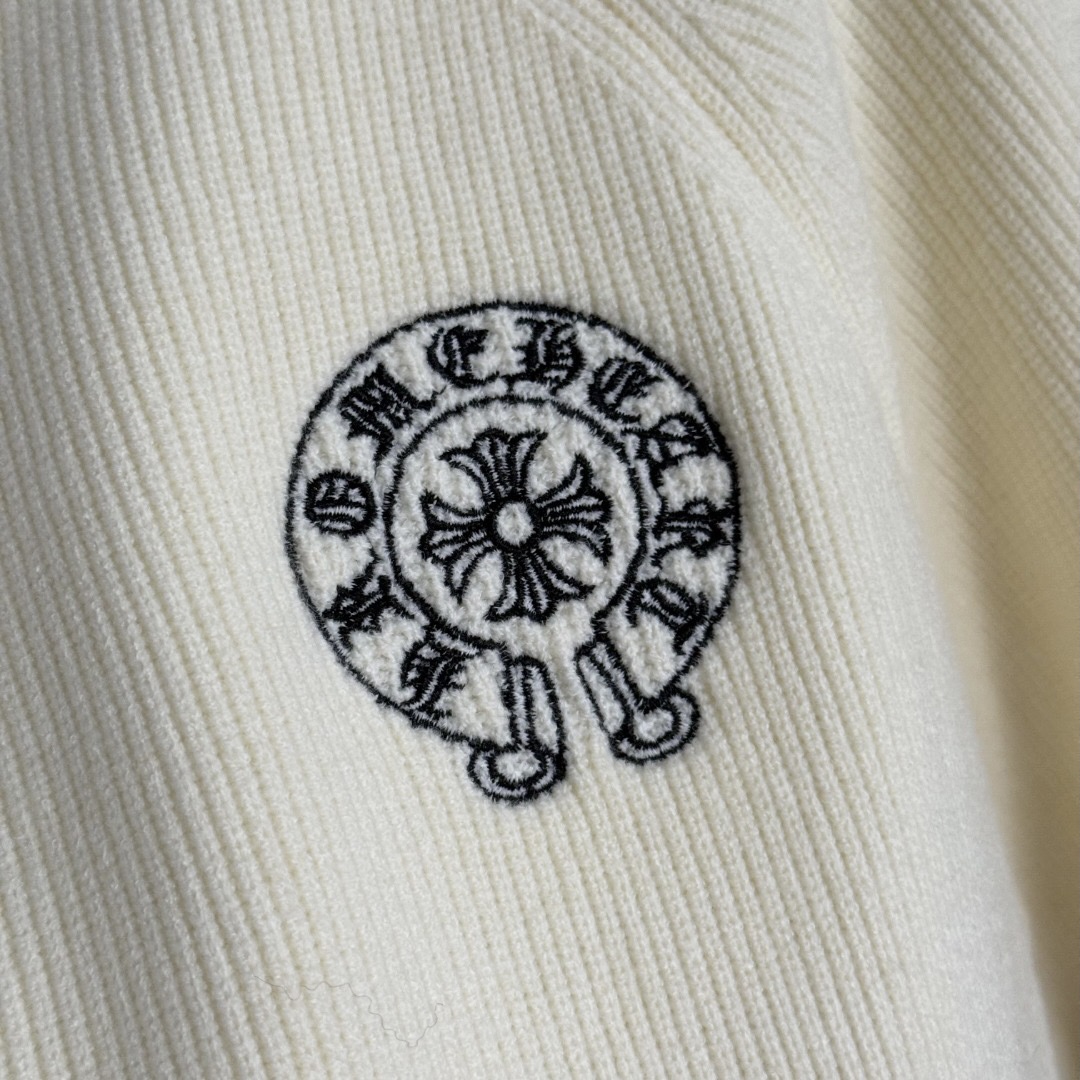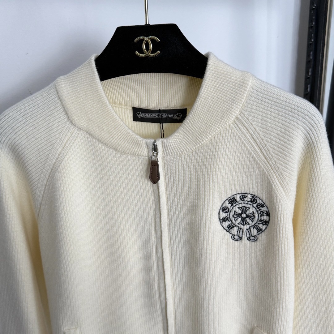 Style No. 20255550 Chrome Hearts* New Style Cross Flower Embroidery Logo Long Sleeve Knitted Cardigan Zipper Jacket, Off-white, Black, [One Size; Bust 92, Sleeve Length 66, Length 48; Weight: 0.395kg]