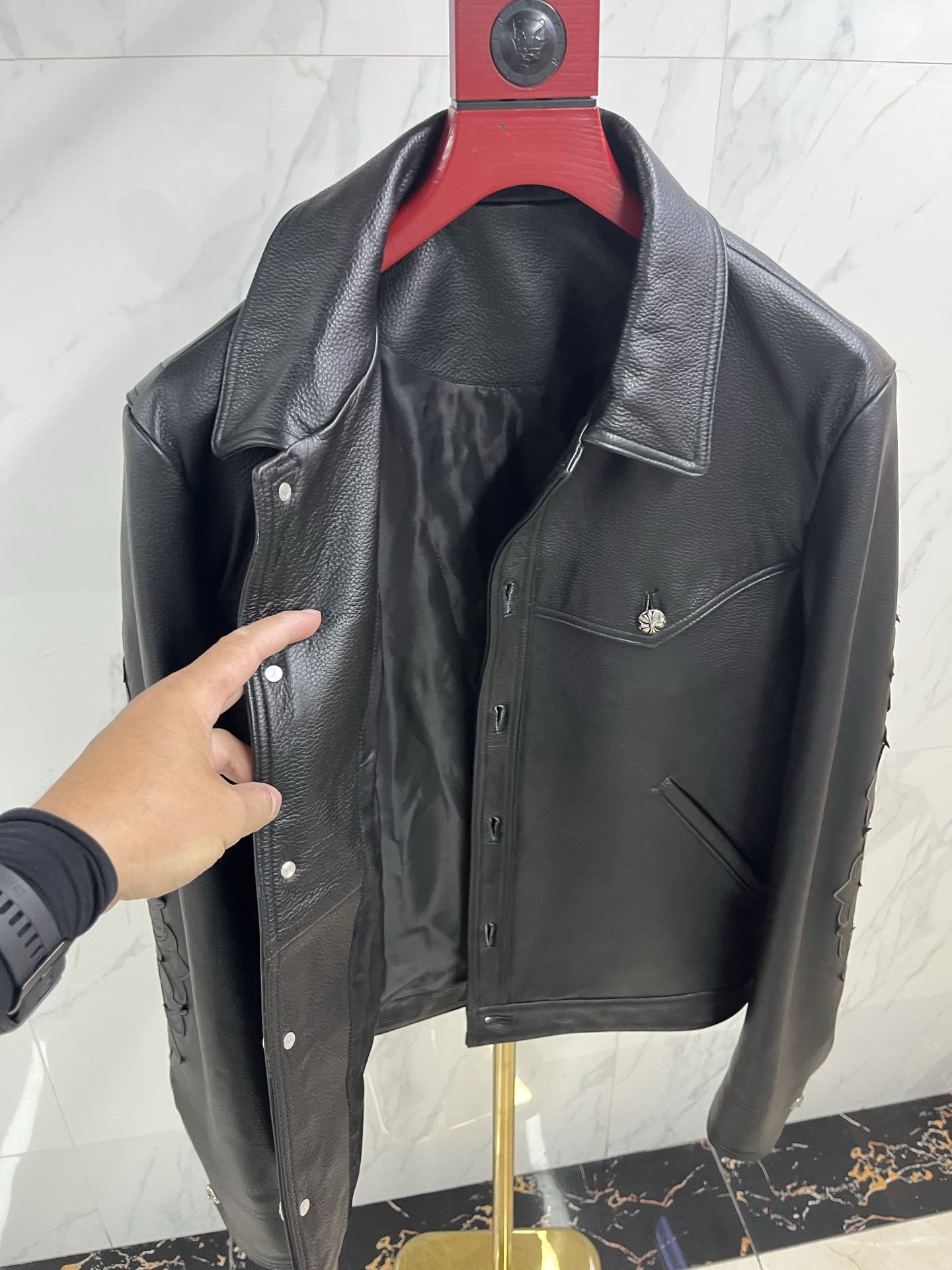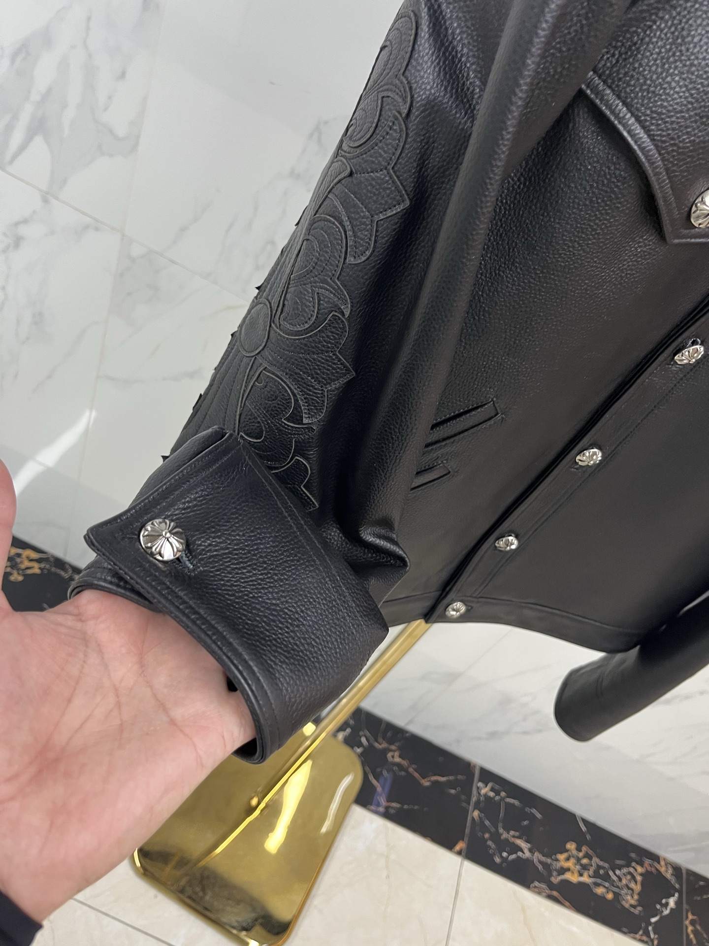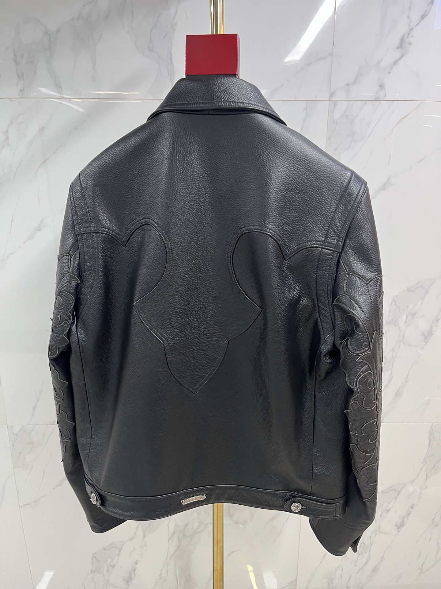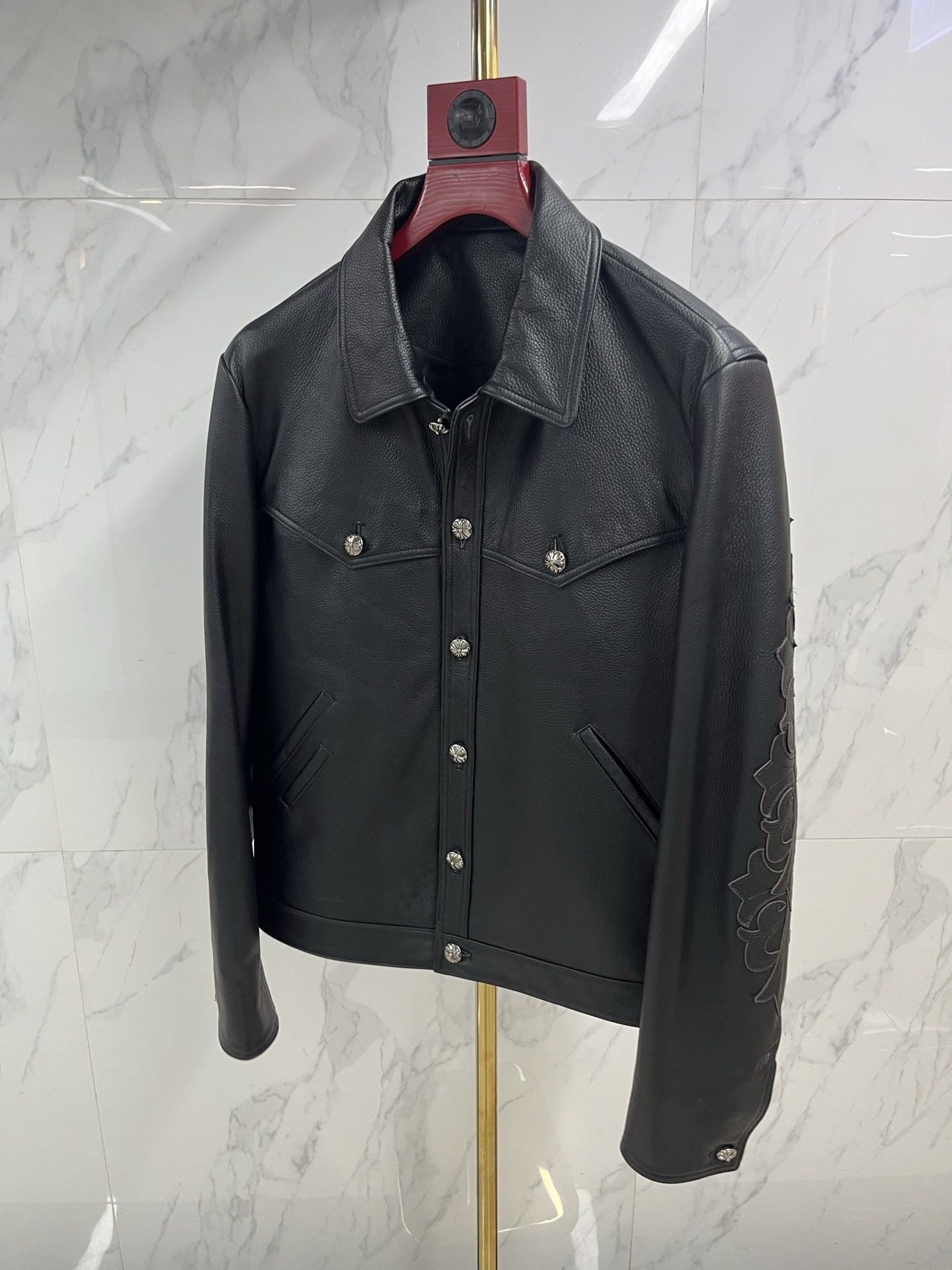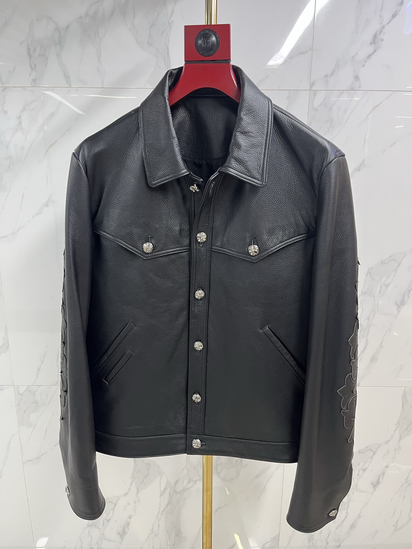 This Chrome Hearts cowhide embroidered airport jacket is the ultimate fusion of wilderness spirit and contemporary functionality. The cowhide carries the power of the earth, and the embroidered图腾 burn with undying faith. It is not merely simple travel gear, but a mobile图腾 dedicated to the modern nomad—wrapping the body in the toughness of top-tier leather, illuminating the journey with the锋芒 of intricate embroidery. Choosing it is to declare in the manner of Chrome Hearts: every takeoff and landing is a soul's expedition; every play of light and shadow above the clouds is a witness to the knight's glory. Wear it, and the earth is underfoot, the legend is underway.