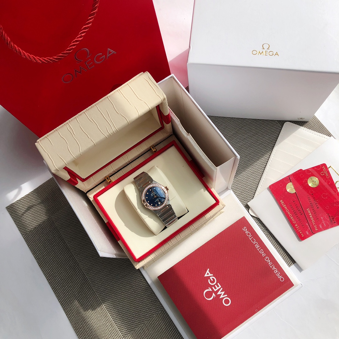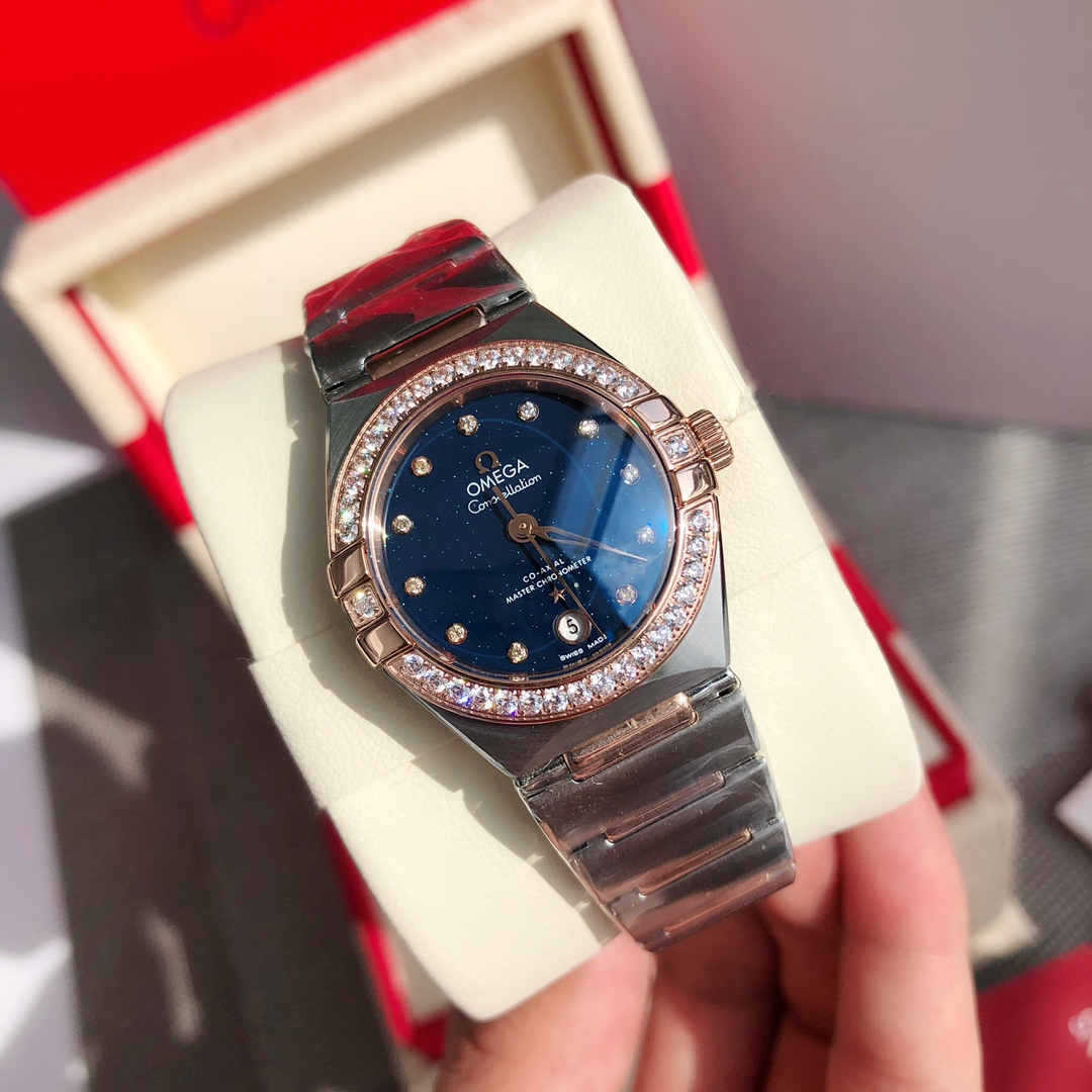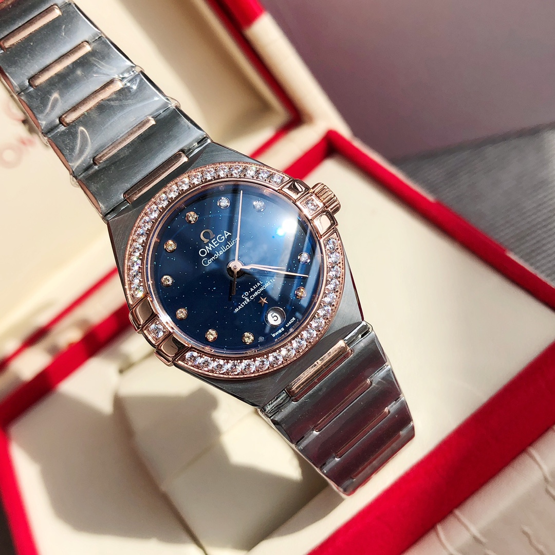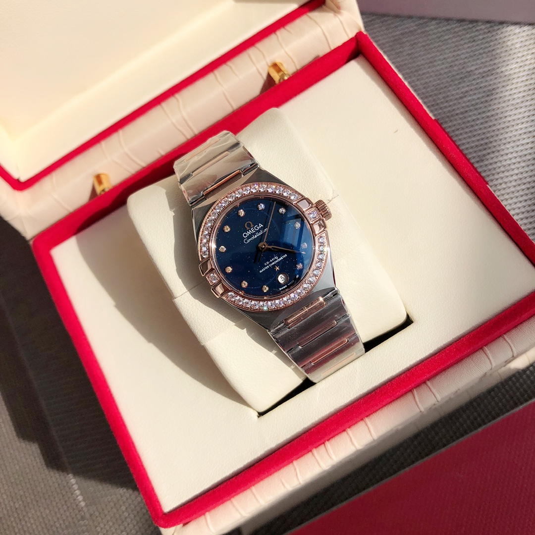 Omega 5th Gen 29mm Constellation for women. Synced with official upgrades, 24-month development. Coaxial 8700 movement, 316L steel case/bracelet, refined claws, hidden clasp, new design, sapphire crystal.