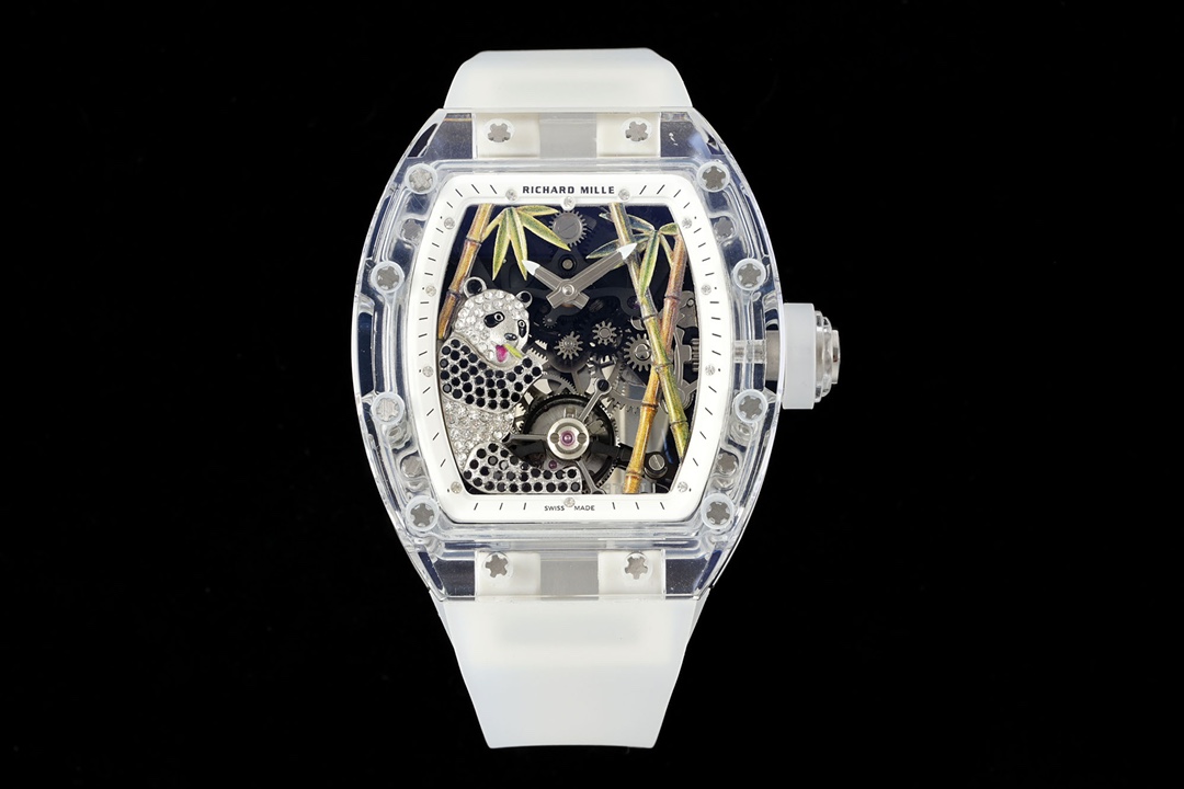 RICHARD MILLE Panda Eating Bamboo Crystal RM26-01 Tourbillon Watch. Lifelike panda with gems, complex crystal case, double skeletonized base, 28800 vph stable movement.