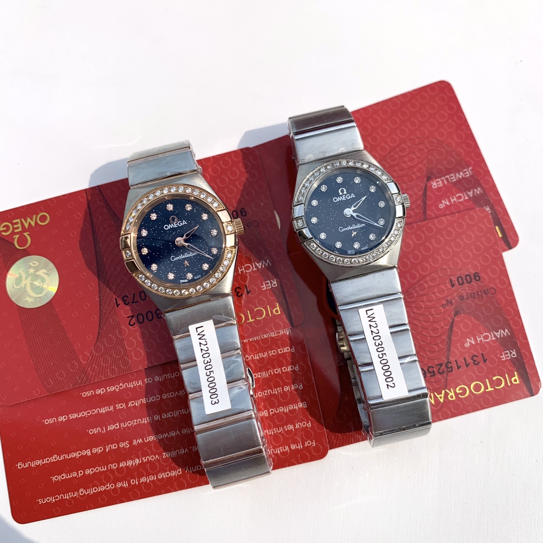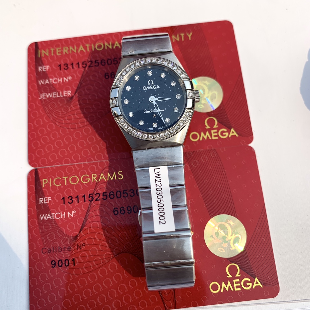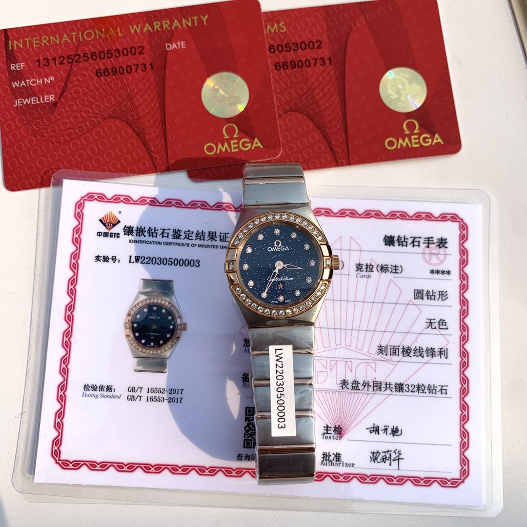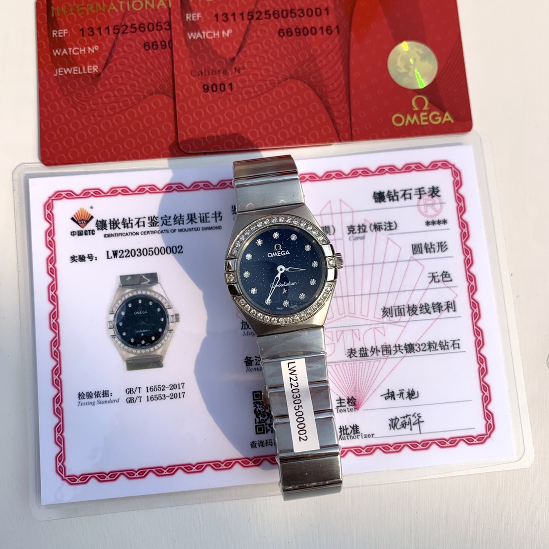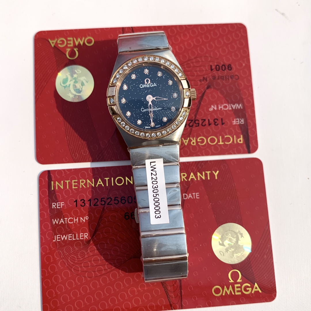 New Omega Constellation 5th Gen with diamonds. Upgraded from Gen 4. Features 12 diamonds, 32 natural diamonds, blue dial. Includes GTC certificate. Original packaging.