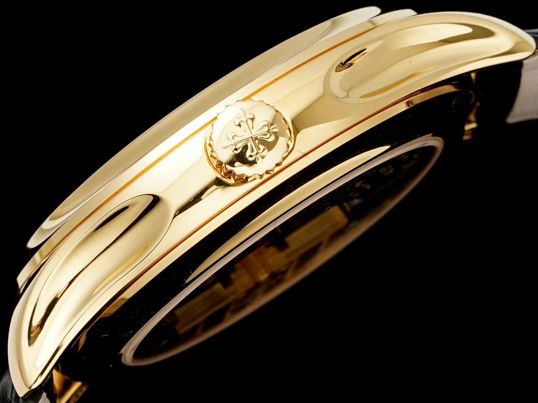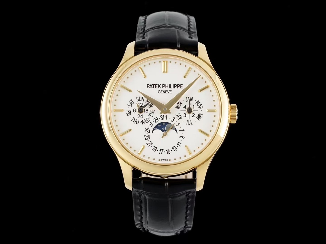 3K's new Patek Philippe 5327/5140 watch features a 40mm case, perpetual calendar, moon phase, and 24-hour display. Powered by Cal.240 Q movement, it includes quick-adjust buttons and a leather strap. A classic, elegant timepiece.