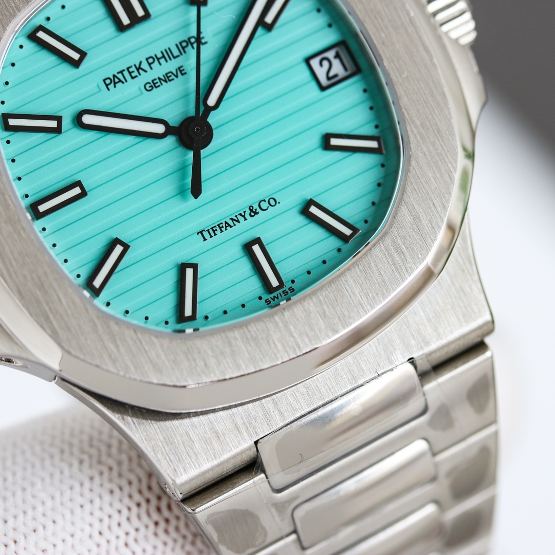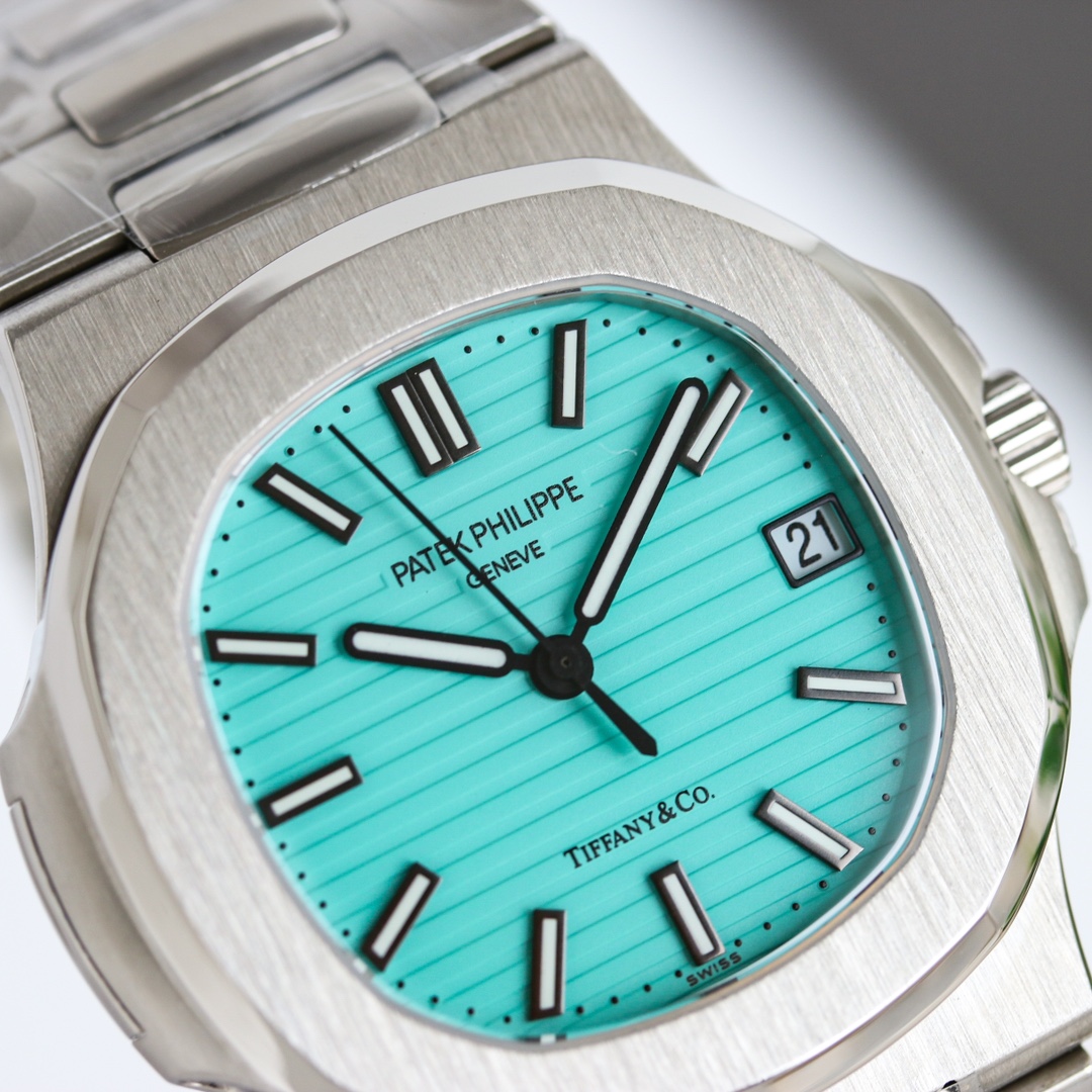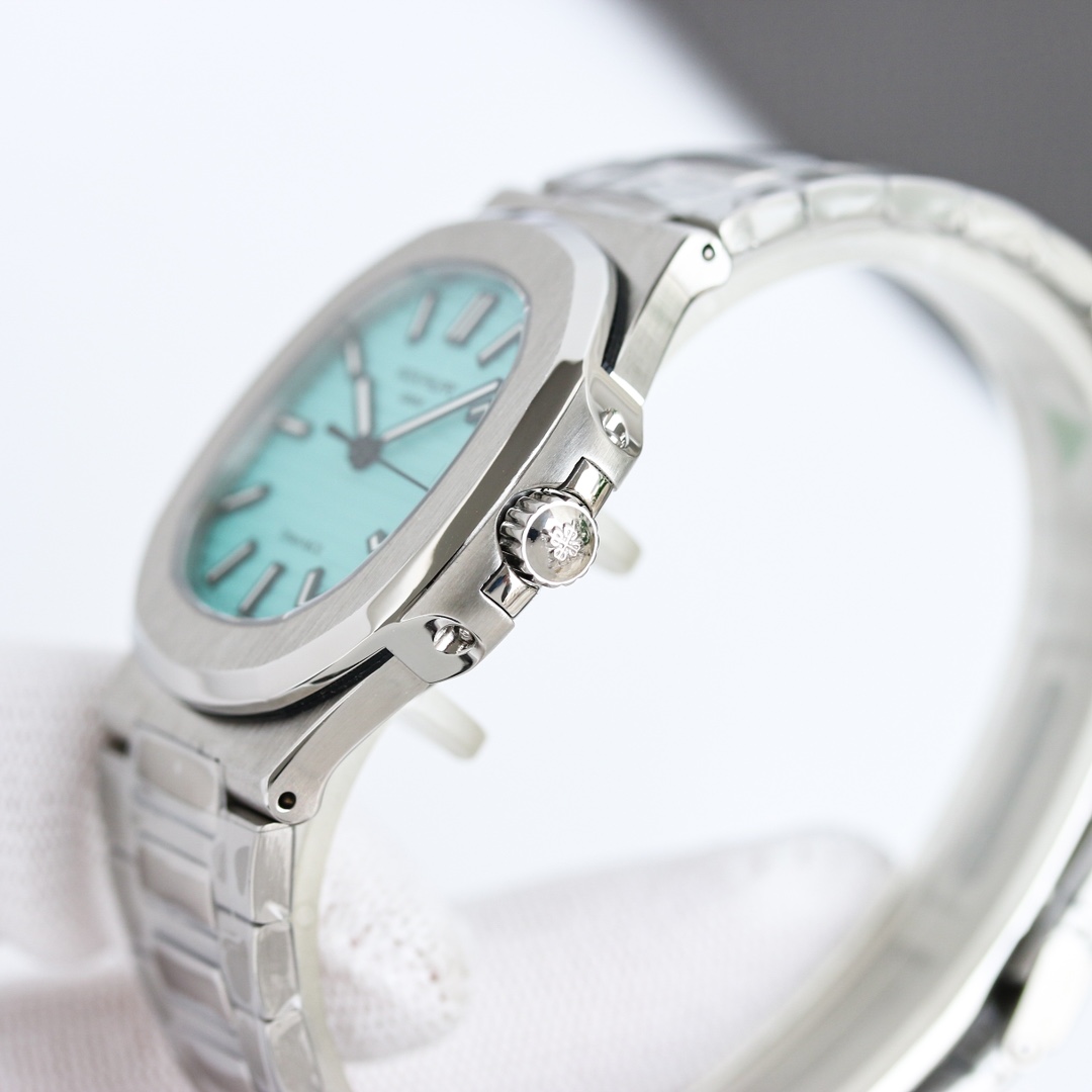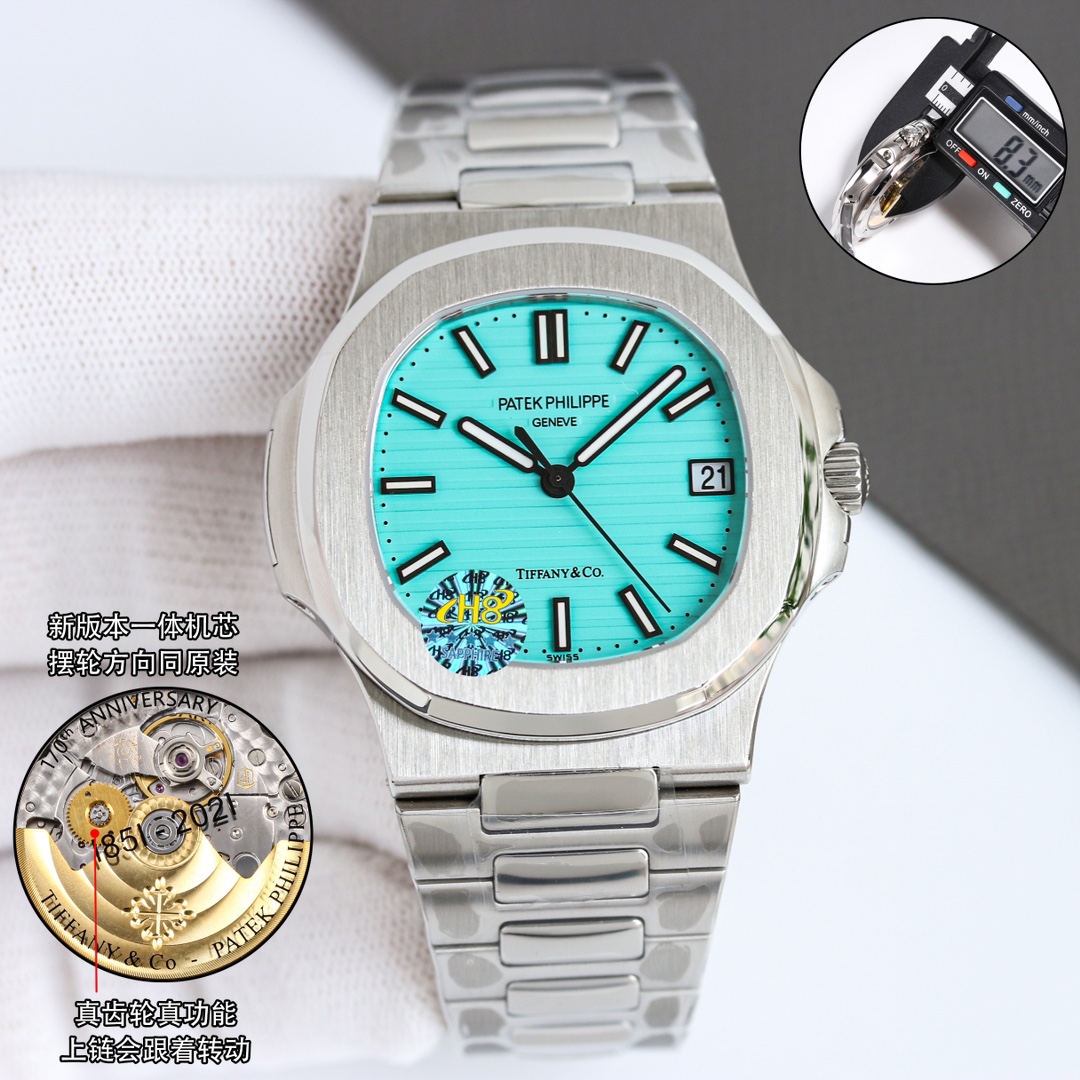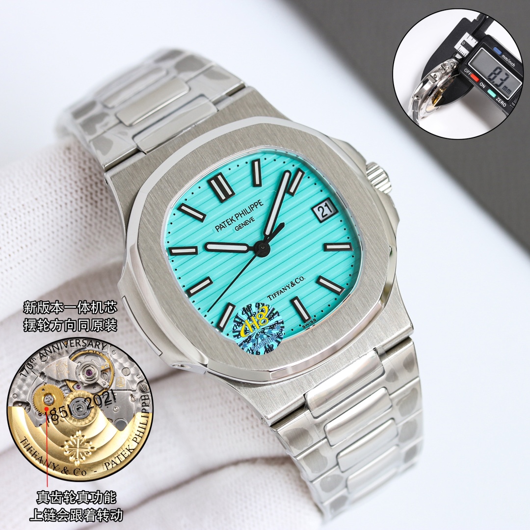 OMF Patek Philippe Nautilus upgraded: engraved movement, noise reduction, 9015 to 324SC, luminous dial, aligned date, smooth crown, 8.3mm thickness.