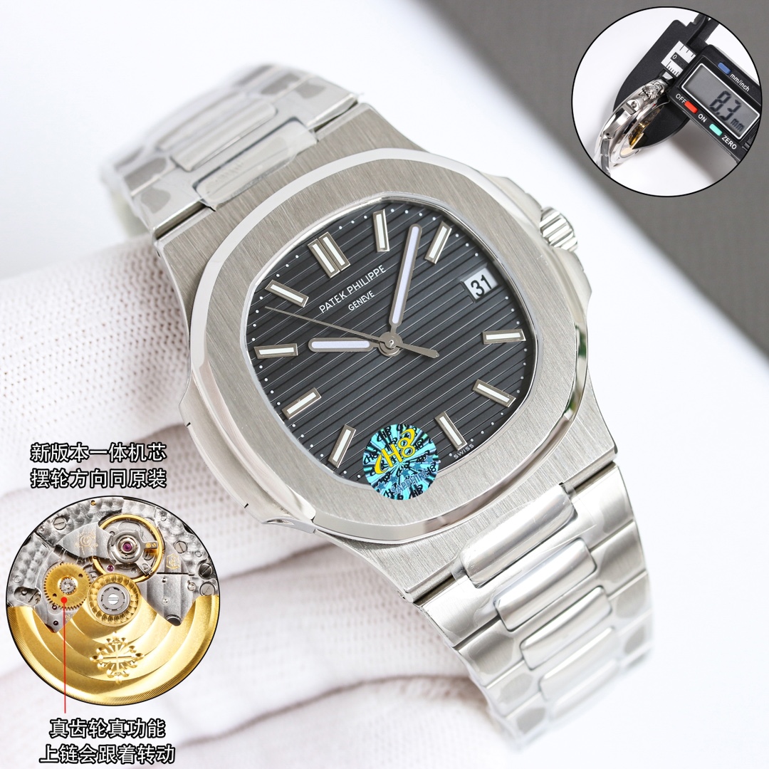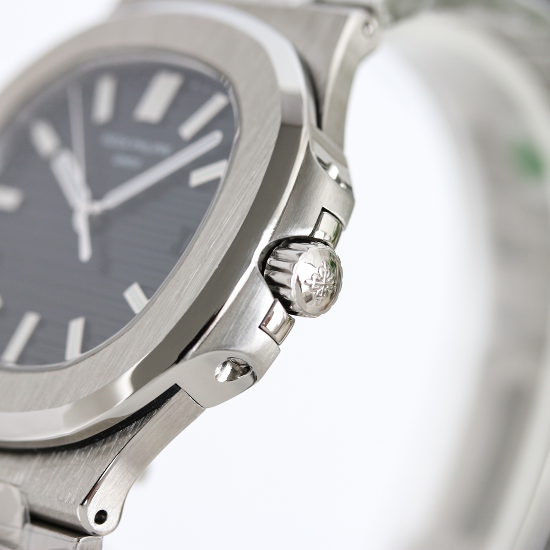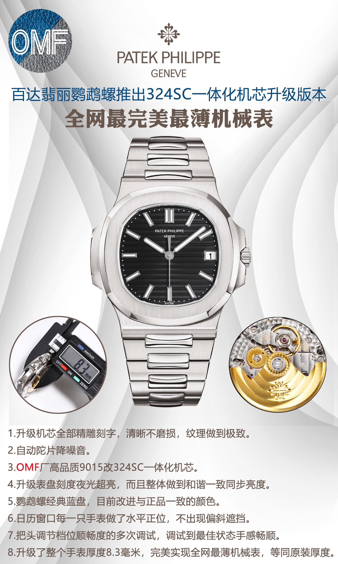 OMF Patek Philippe Nautilus upgraded: engraved movement, quieter rotor, 9015 to 324SC, brighter lume, authentic blue dial, aligned date, smooth crown, 8.3mm thin.