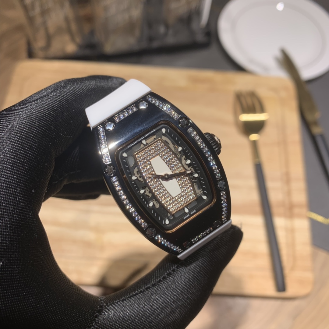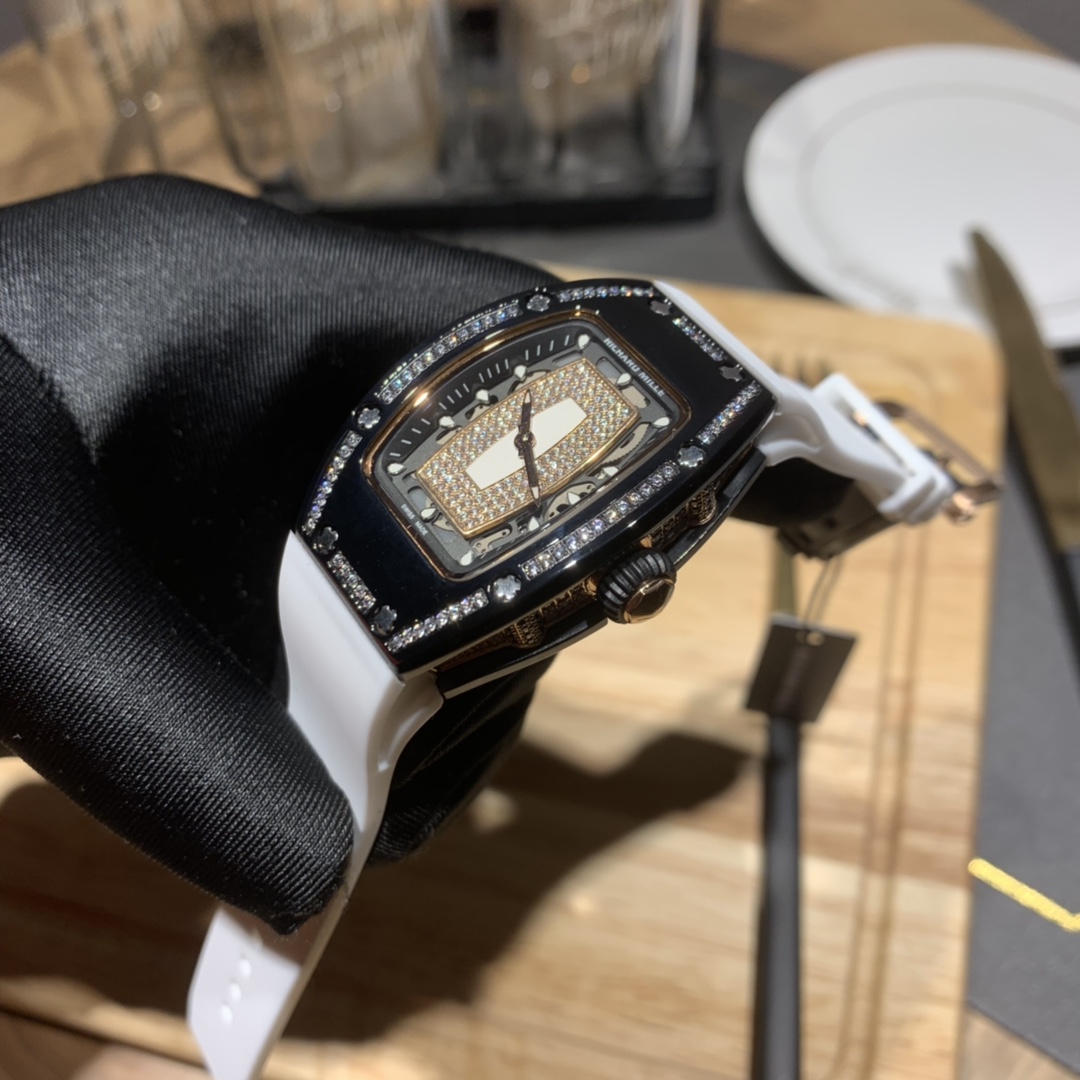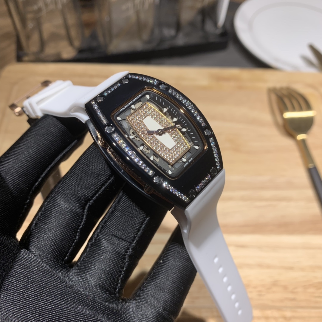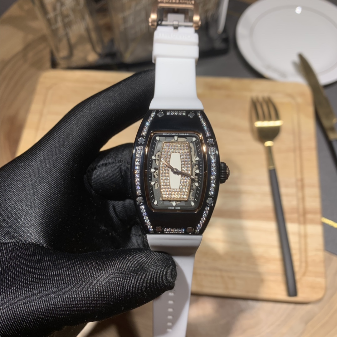 Richard Mille RM007-1 "Diamond Crown" watch for women. 45x31mm automatic with diamonds, titanium case, skeleton dial. Combines art and technical innovation.