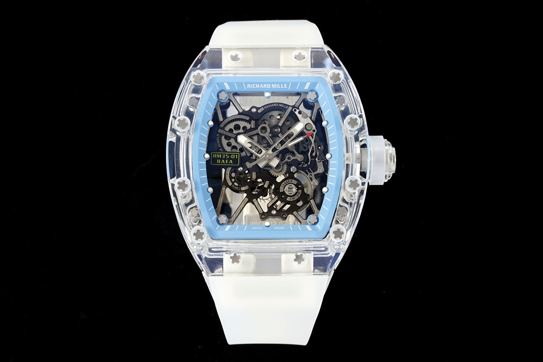 RICHARD MILLE RM35-01 with integrated RMUL3 movement, transparent crystal case, titanium screws, natural rubber strap. Size: 51mm x 42.7mm x 15.8mm.