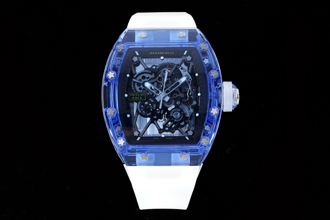 【Integrated Movement, Crystal Case】 RICHARD MILLE RM35-01: New crystal version with RMUL3 movement. Features transparent case, titanium screws, real gears, and fluororubber strap. Size: 51x42.7x15.8mm.