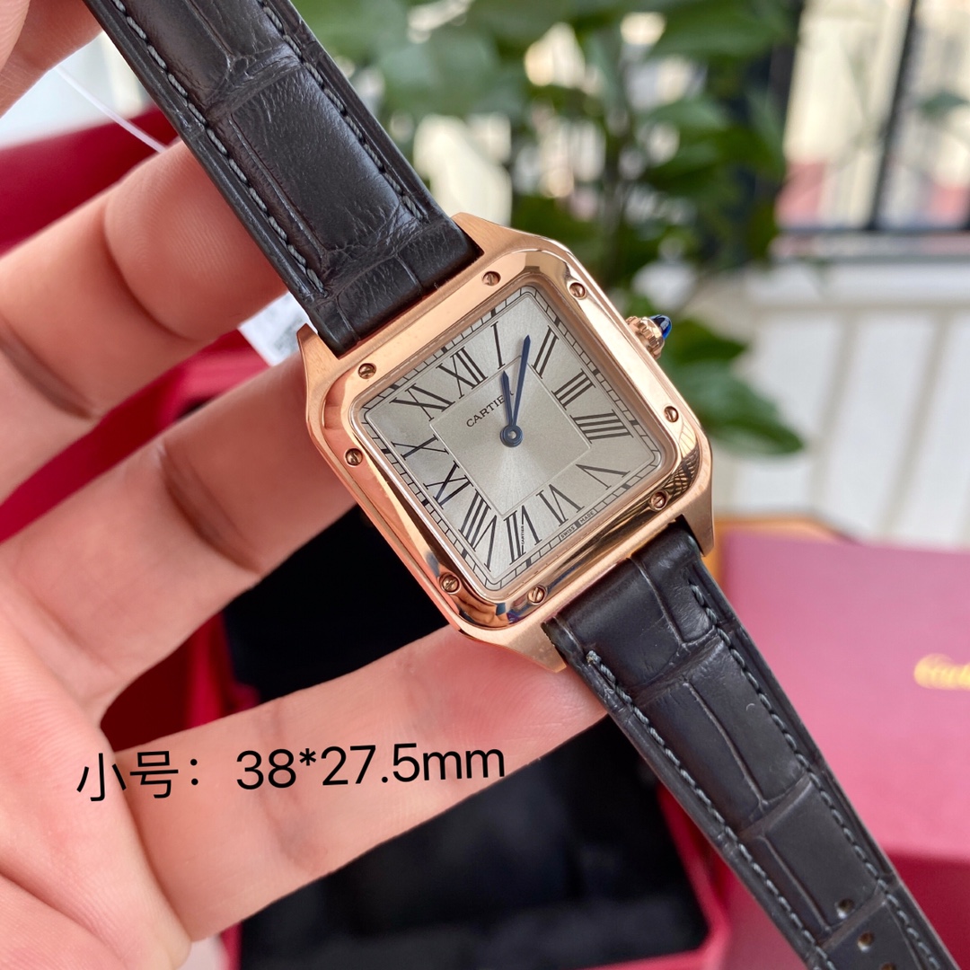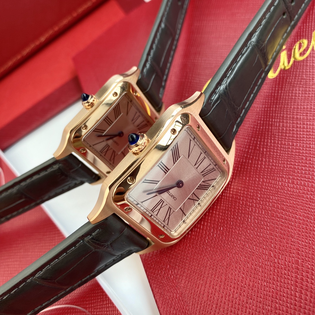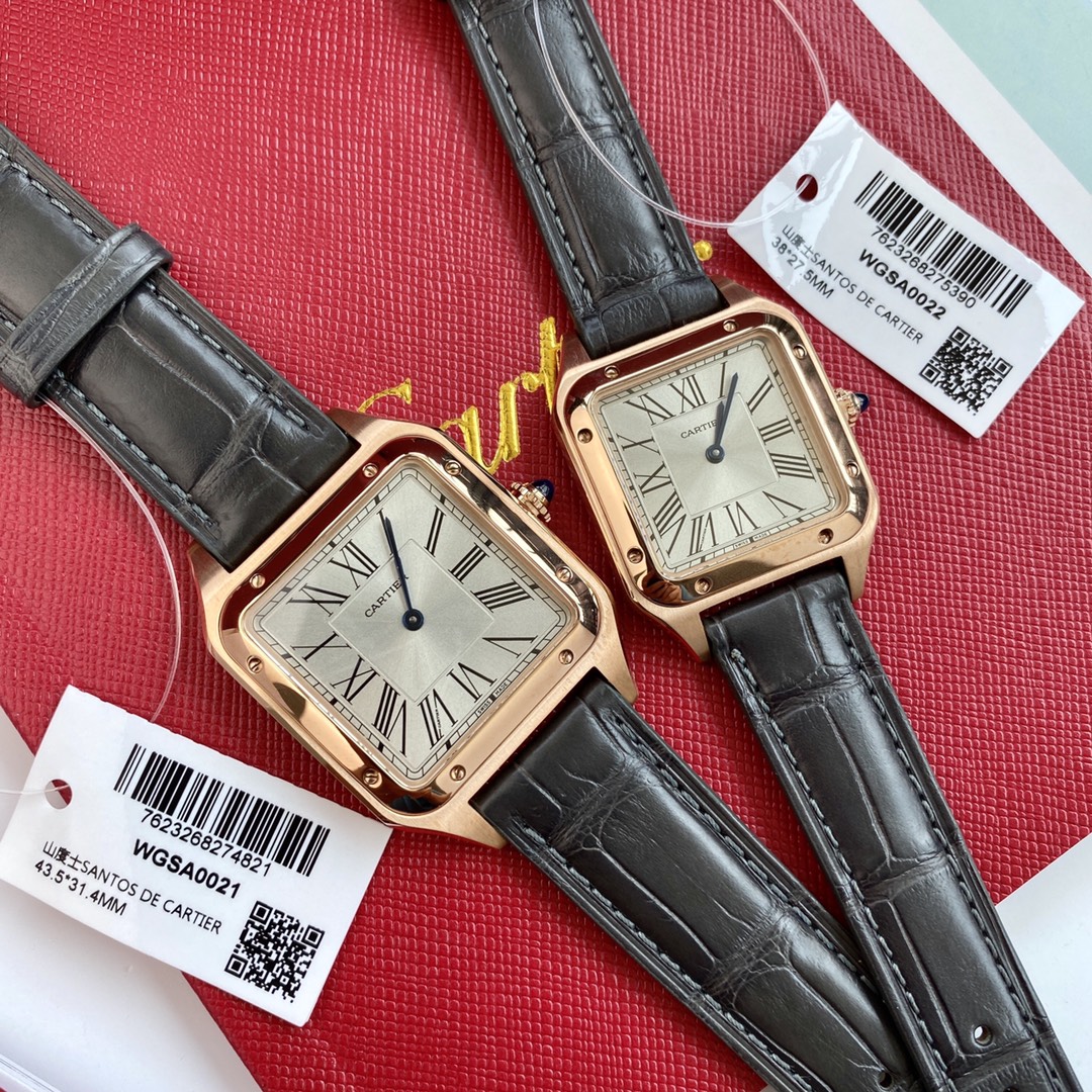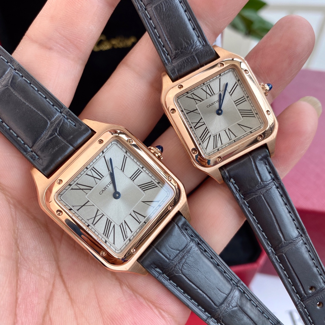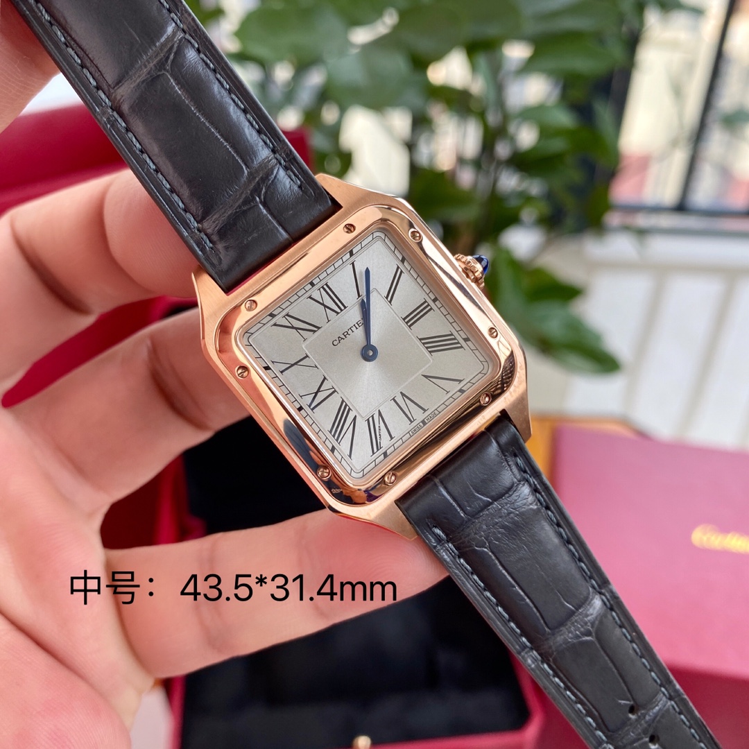 Cartier Santos: iconic square watch, first modern wristwatch. Steel case, blue hands, Roman numerals, alligator strap. Swiss quartz, full set.