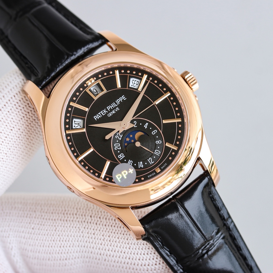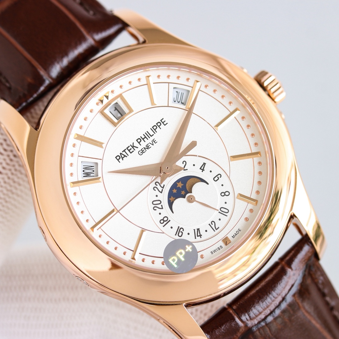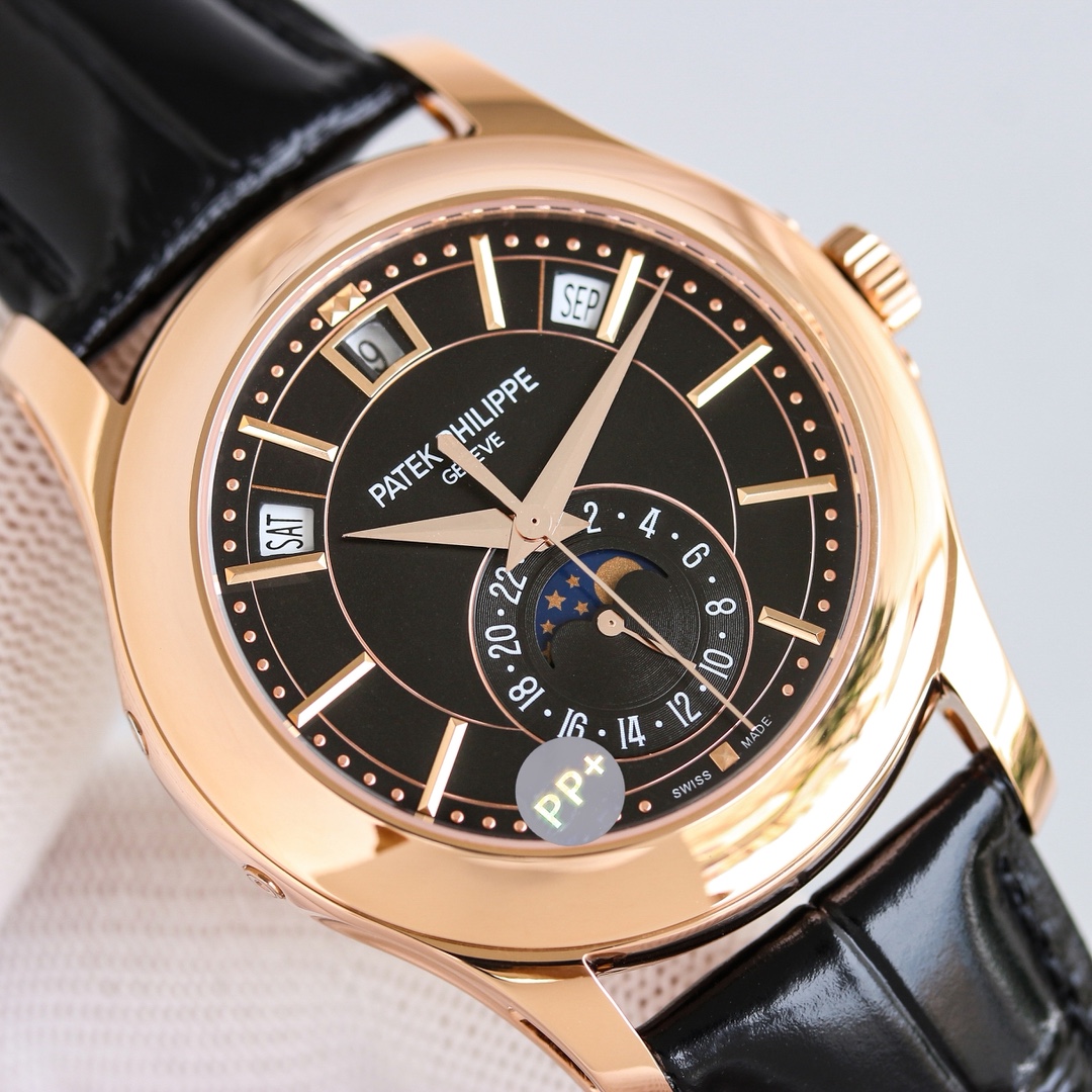 Patek Philippe 5205 chronograph. 40mm, 11.4mm thick. Cal.324S movement. Date, day, month, moon phase. Sapphire crystal, original folding clasp.