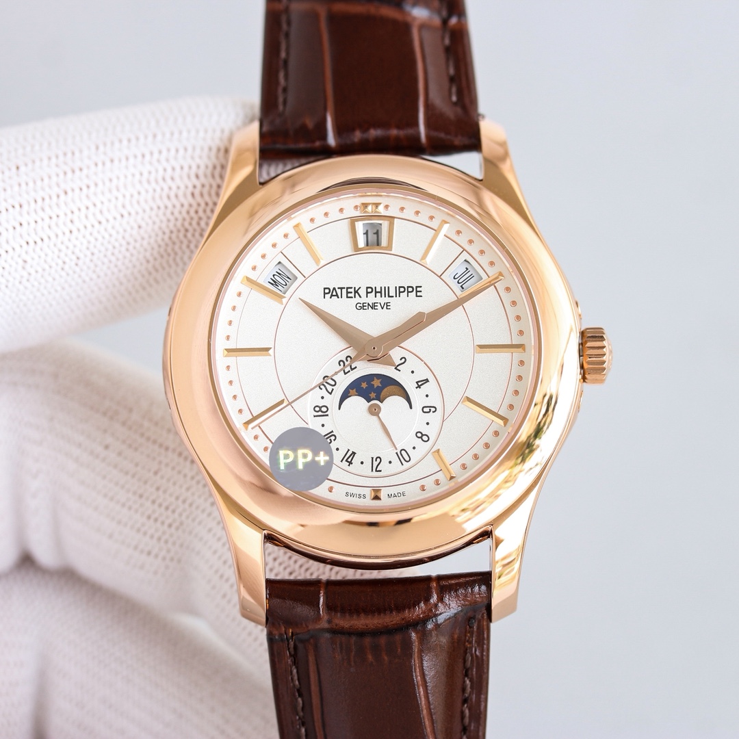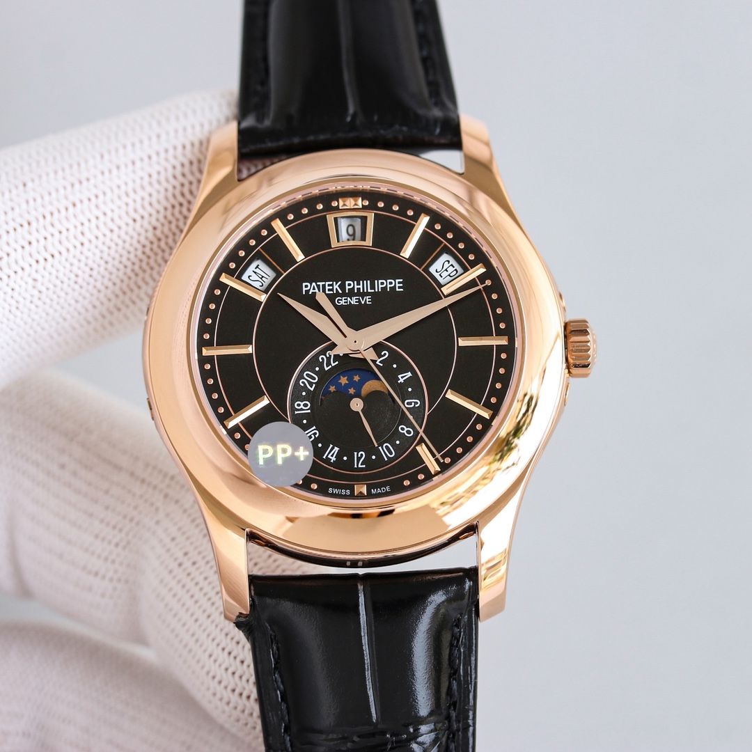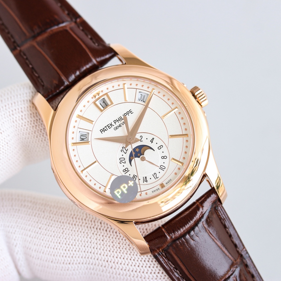 Patek Philippe 5205 chronograph. 40mm, 11.4mm thick. Cal.324S movement. Date, day, month, moon phase. Sapphire crystal, original folding clasp.