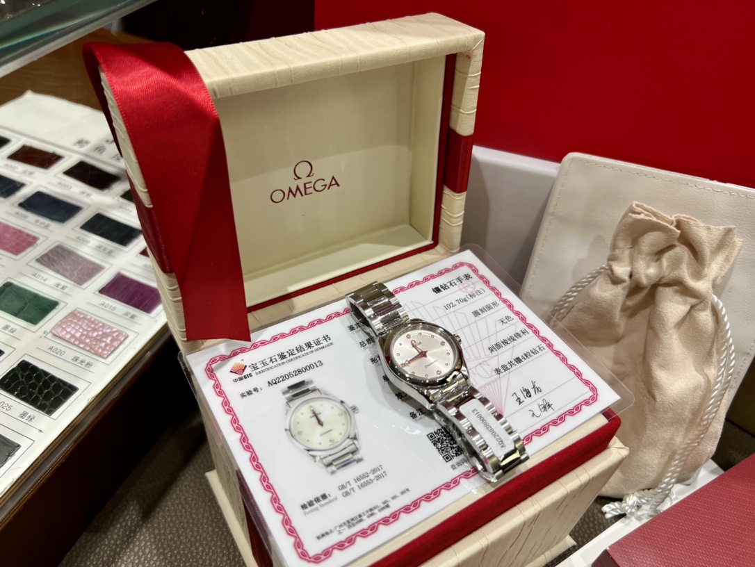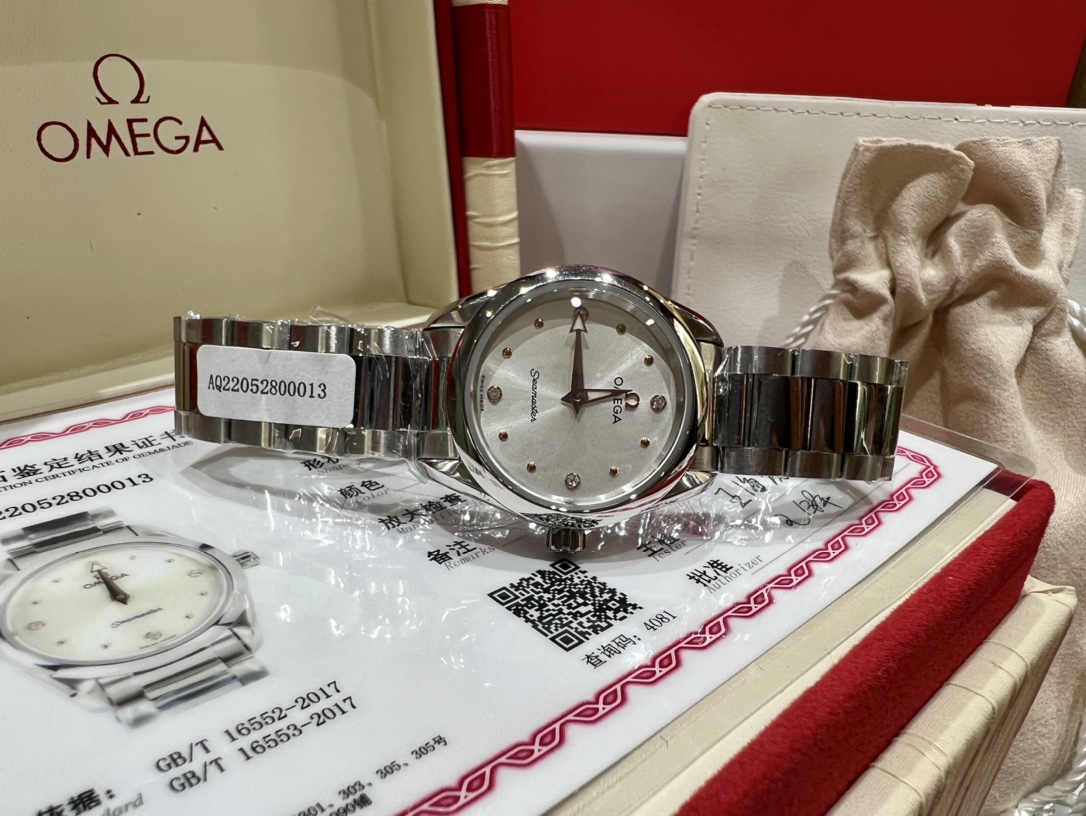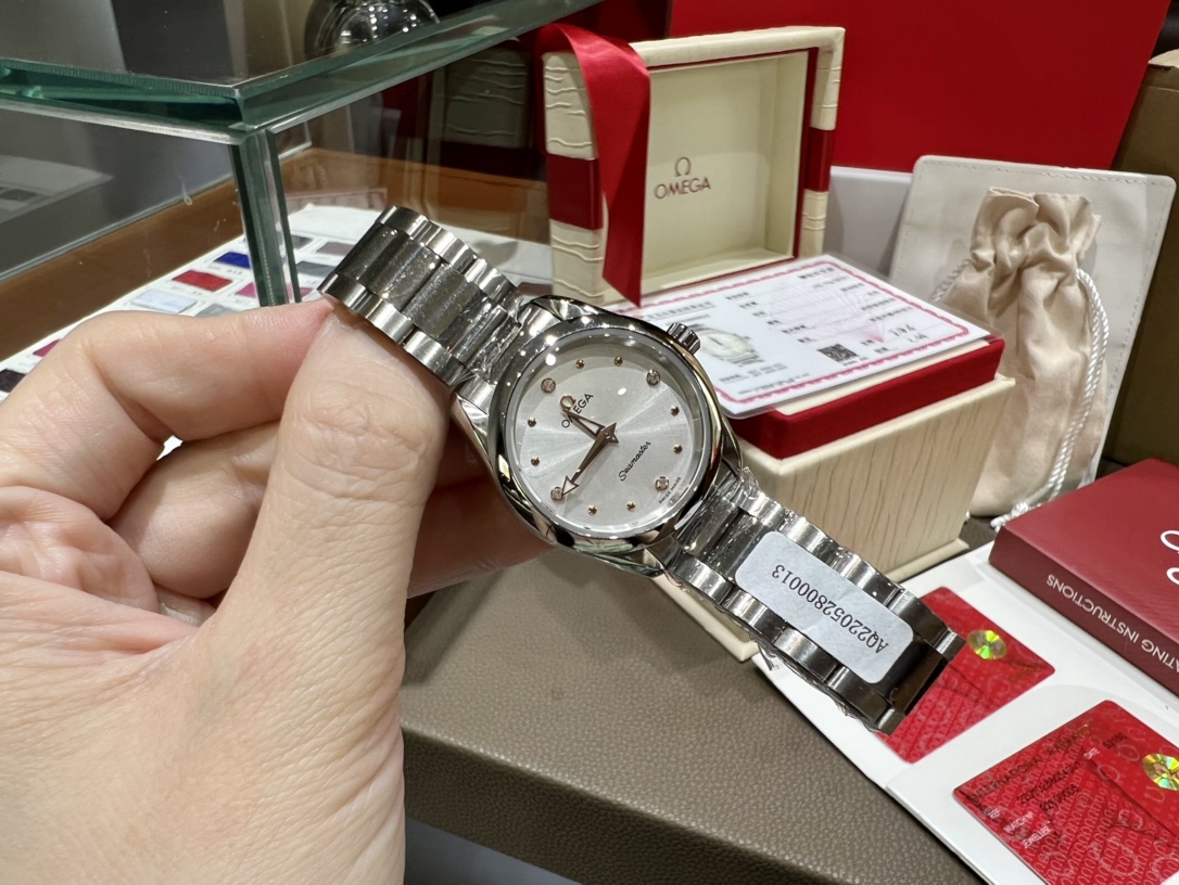 Omega Seamaster Aqua Terra: 28mm steel women's watch with 12 diamonds, mother-of-pearl dial, rhodium-plated hands. Features Omega 4061 movement, GTC certificate.