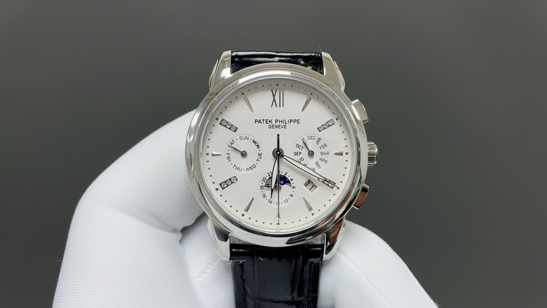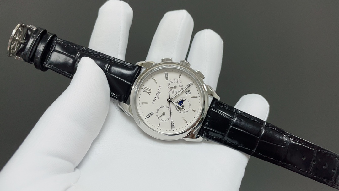 Taiwan factory 2025 Patek Philippe perpetual calendar watch. 41mm, multi-function mechanical movement, Italian leather strap, butterfly clasp.