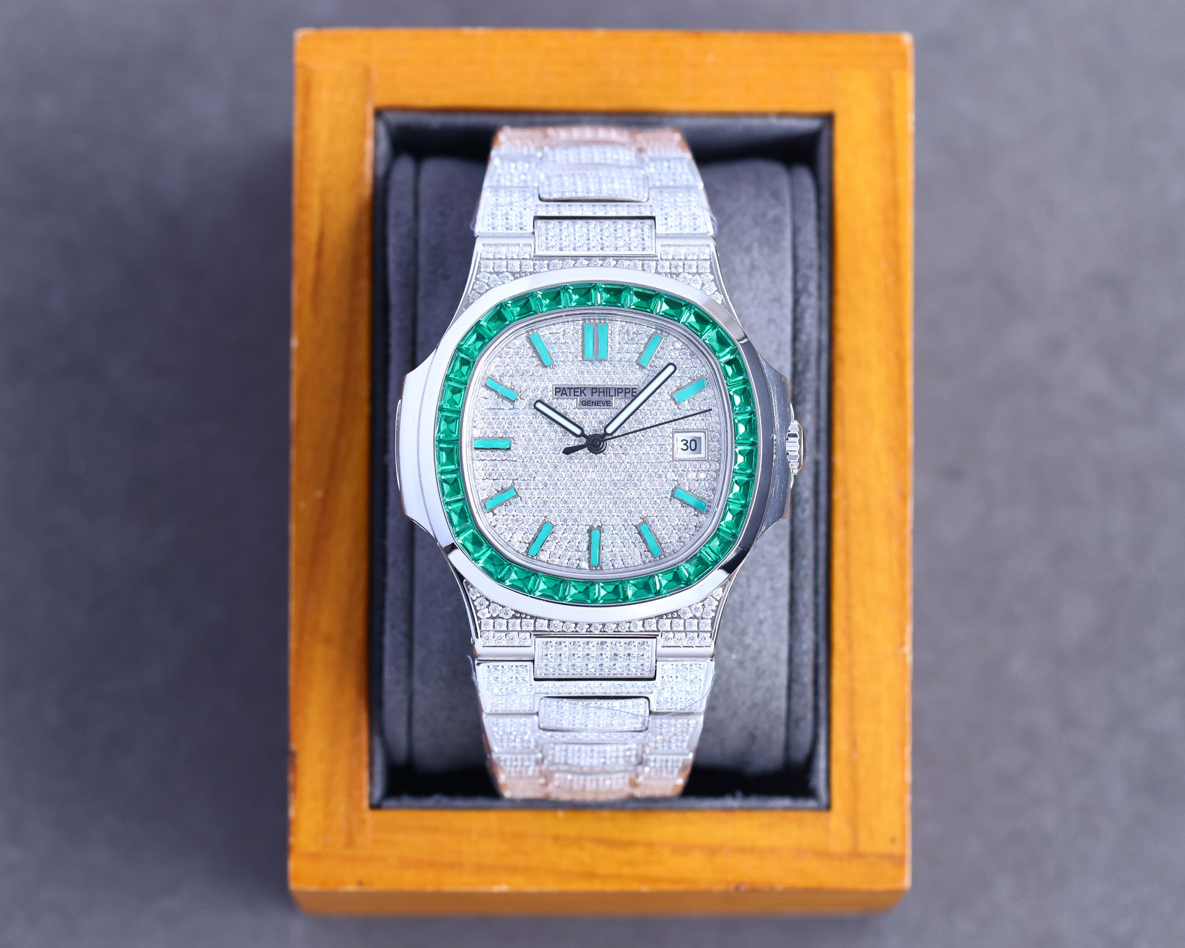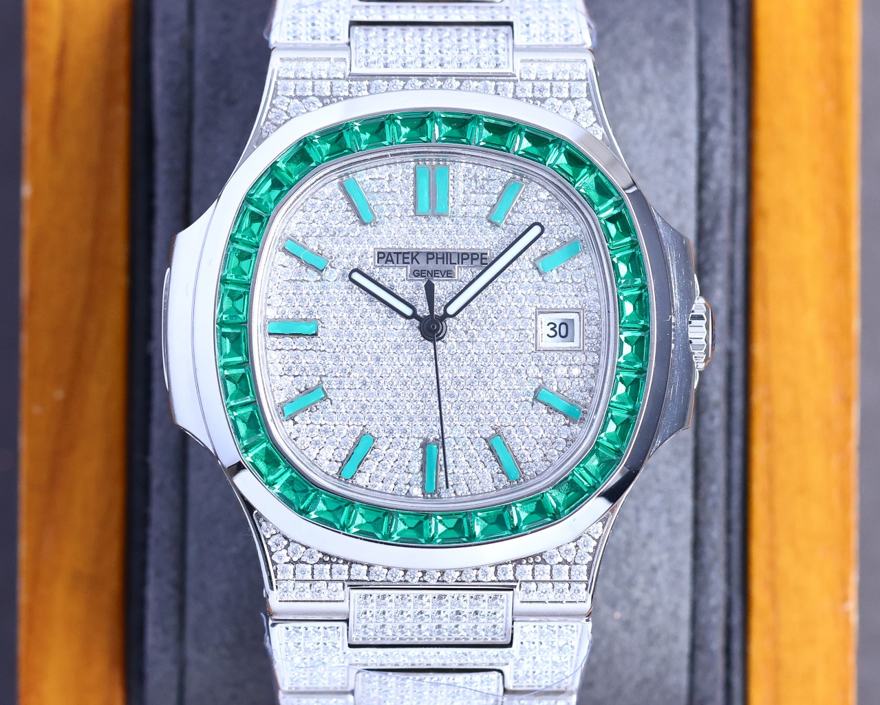 R factory replica Patek Philippe Nautilus, full diamond upgrade, custom ergonomic bracelet, original movement, complete packaging.