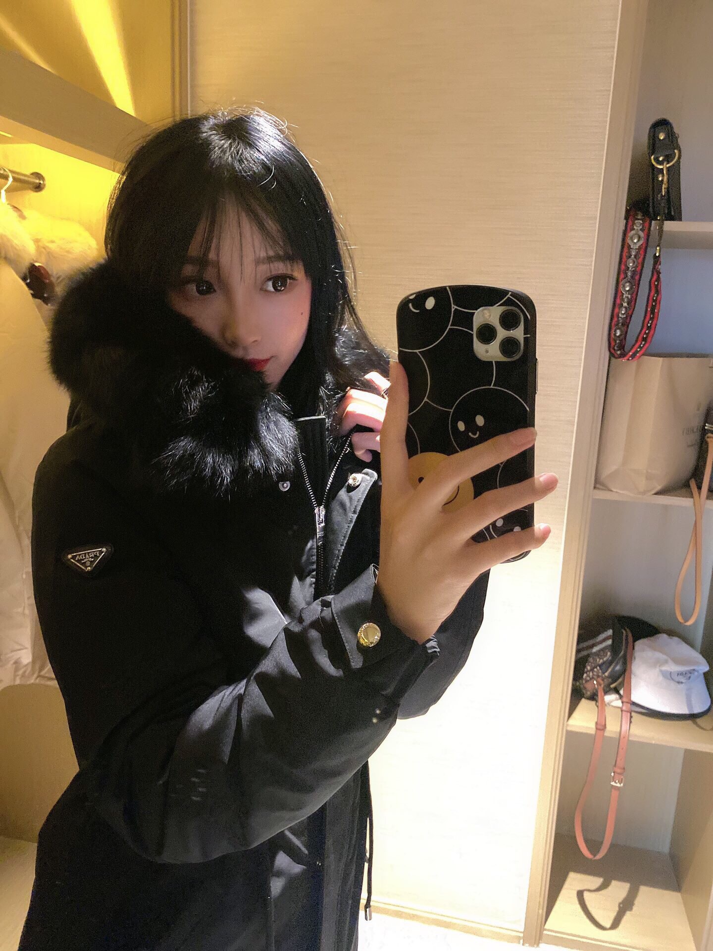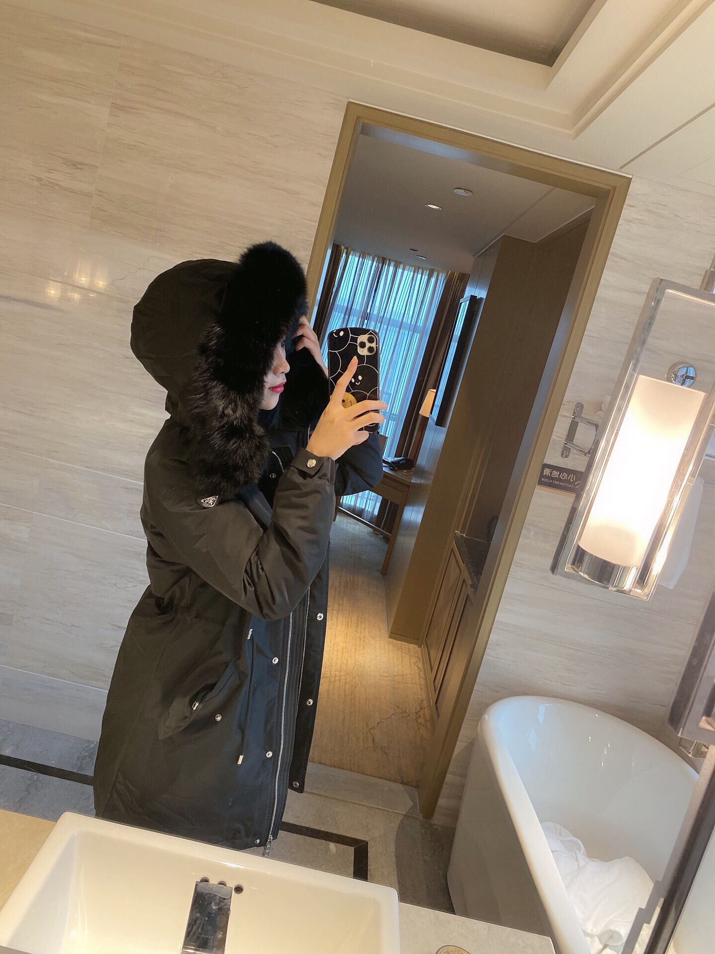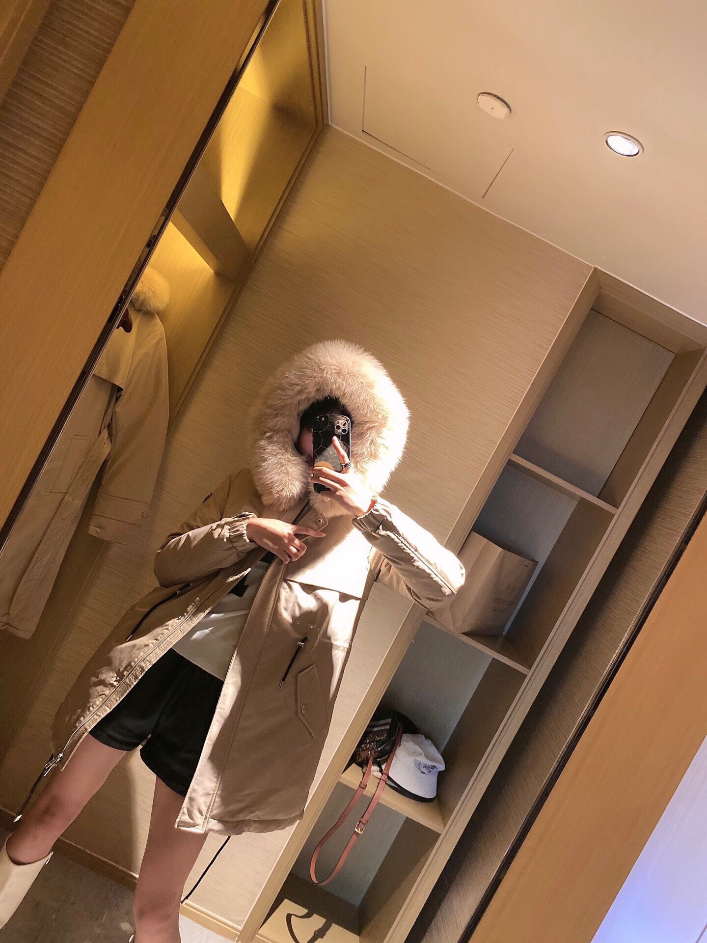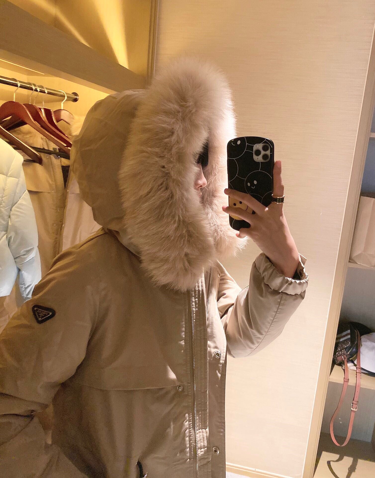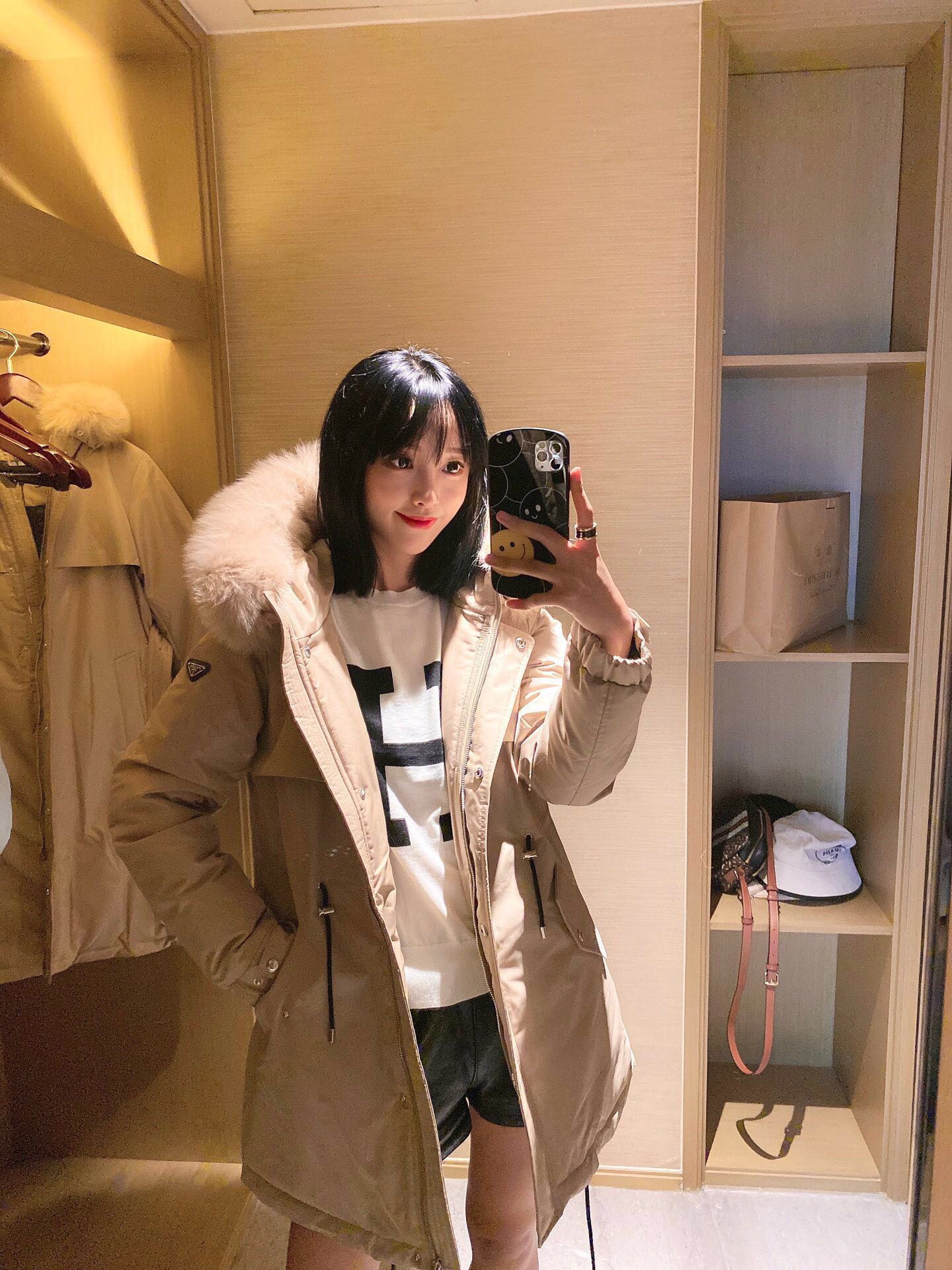 90% white duck down, elastic drawstring design, waist-fitting style. Oversized fox fur collar. Leather ▲ badge logo patch on the sleeve. High-end and luxurious 👍 Super windproof and warm 🔥 Slightly thick fabric with light raindrop ☔️ resistance.
