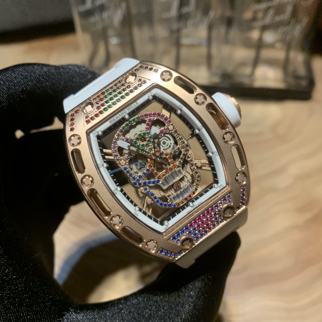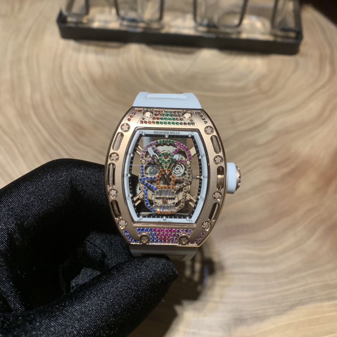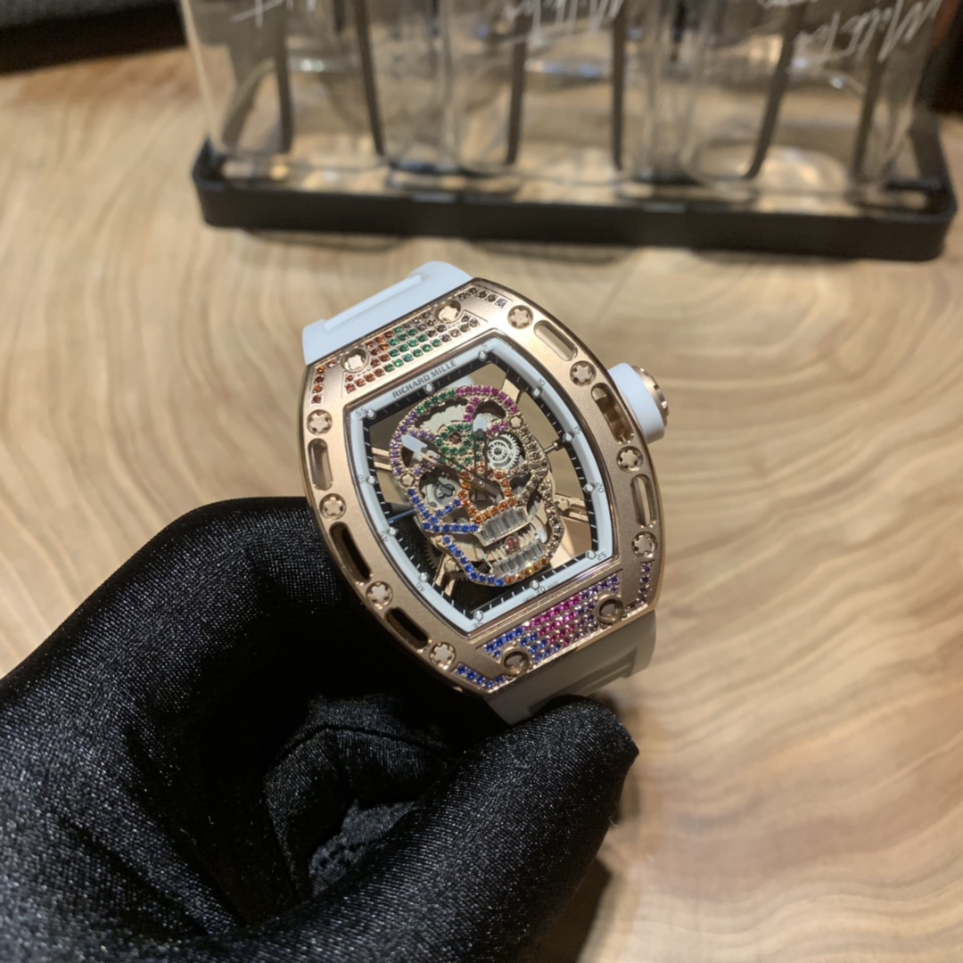 Richard Mille RM-052 Skull Series. Upgraded colorful diamond version. Full diamond case, imported mechanical movement, anti-glare sapphire crystal, suspended skeleton design. Bold skull motif captures watch enthusiasts' hearts.