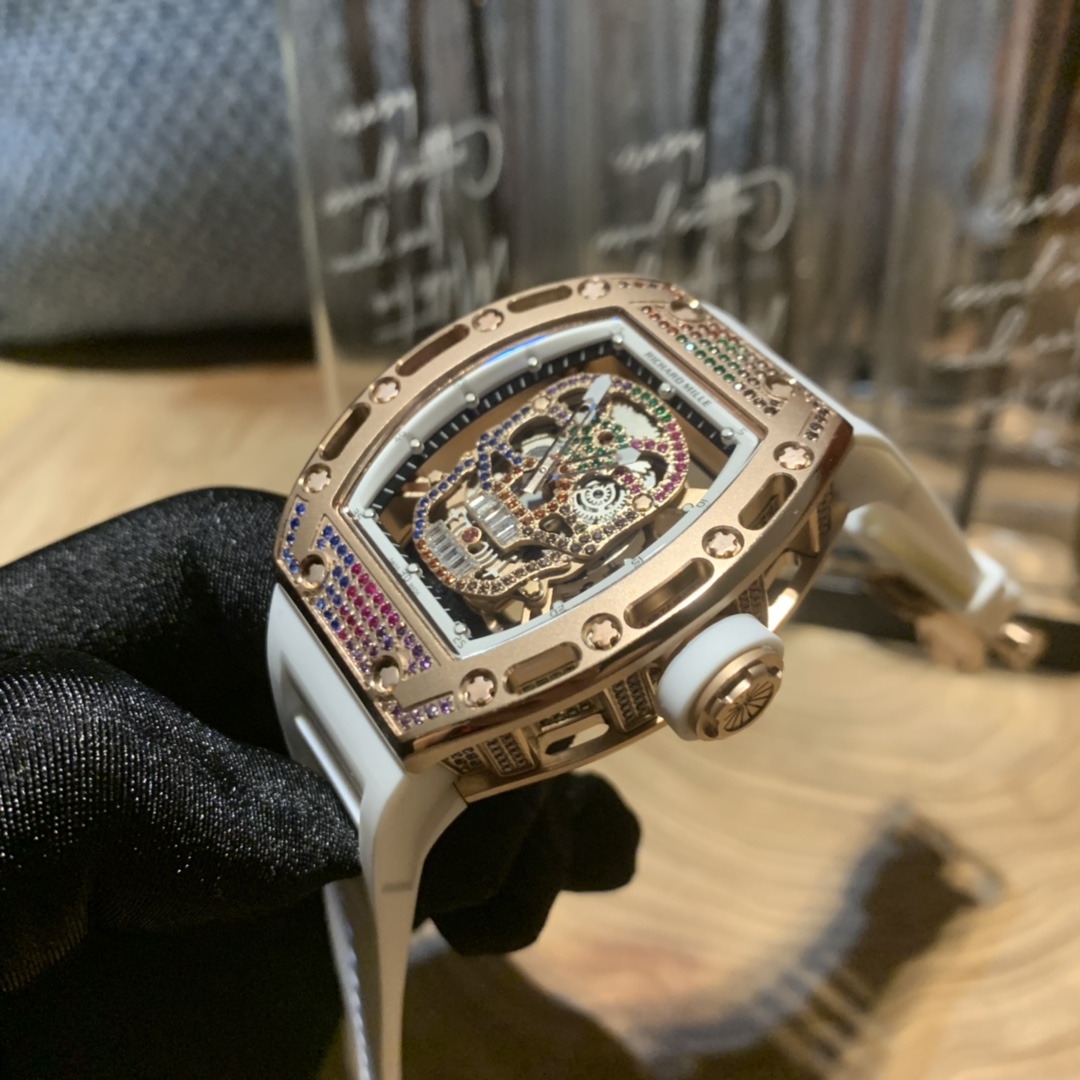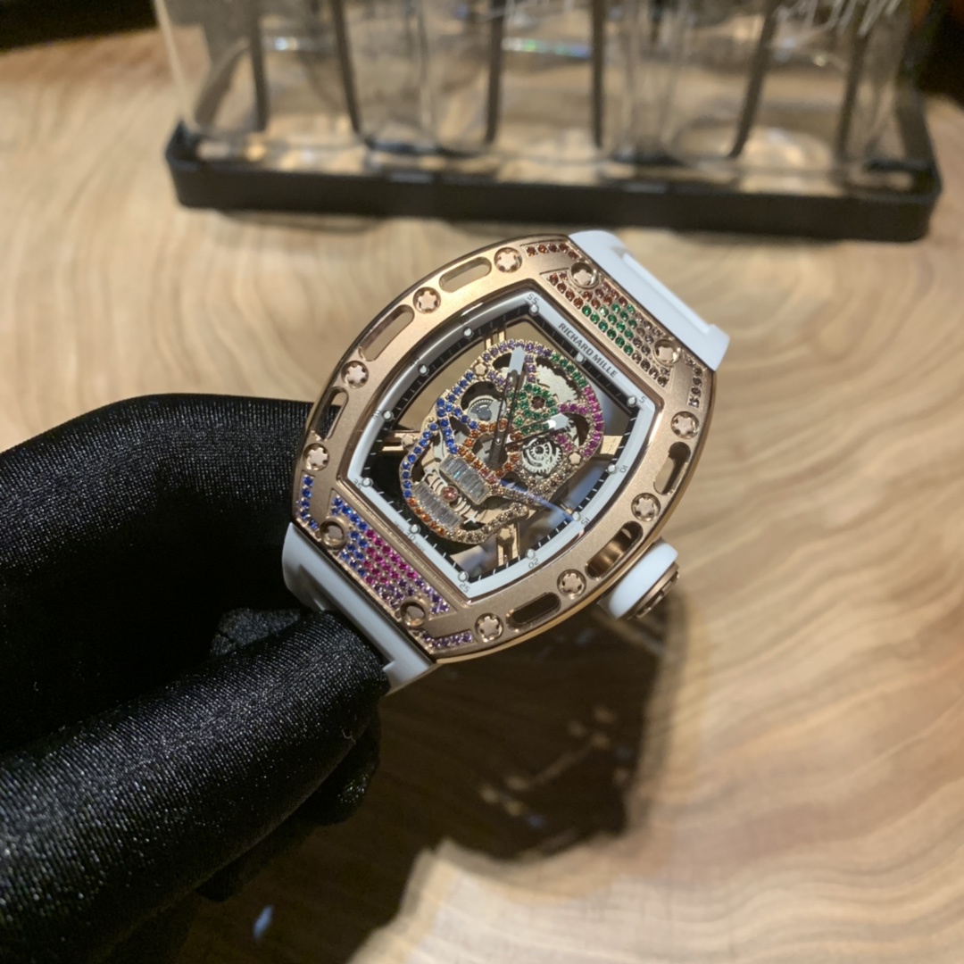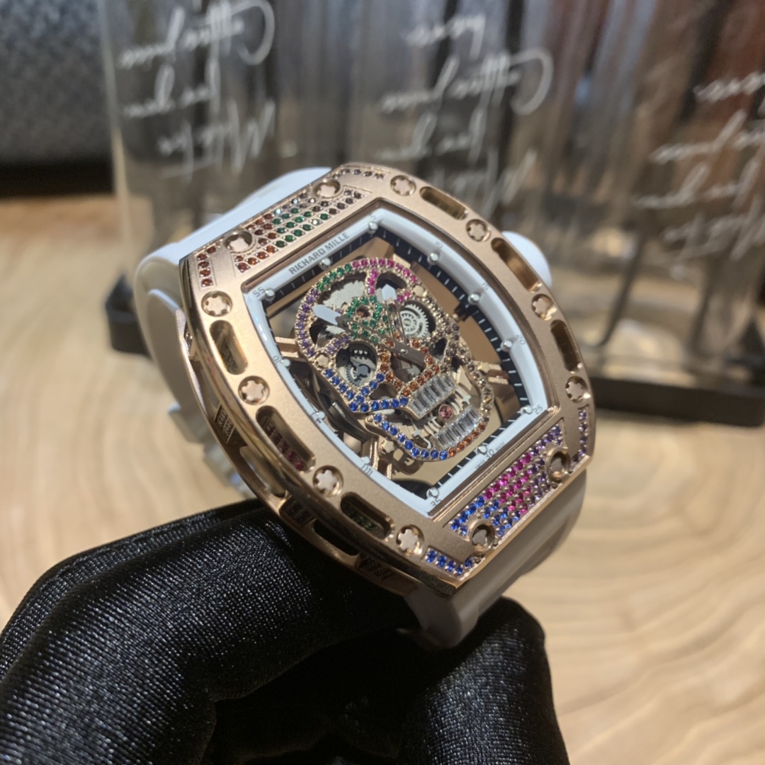 Richard Mille RM-052 Skull Series. Upgraded colorful diamond version. Full diamond case, imported mechanical movement, anti-glare sapphire crystal, suspended skeleton design. Bold skull motif captures watch enthusiasts' hearts.