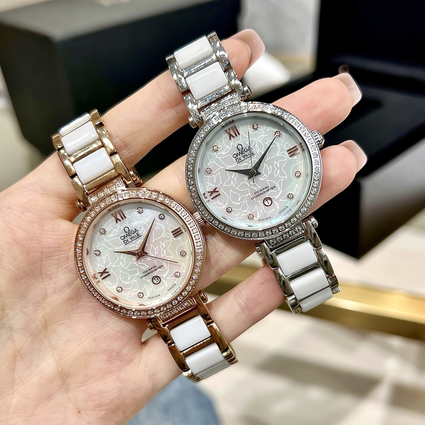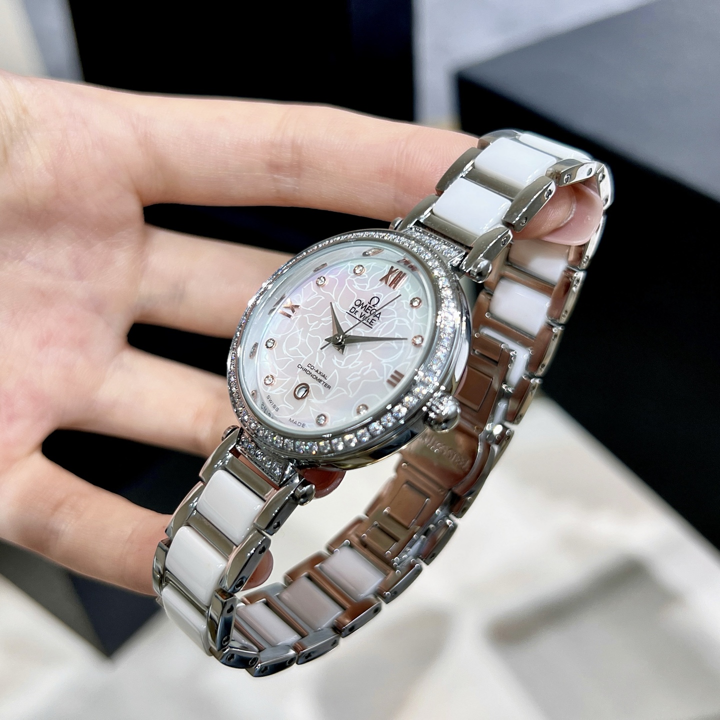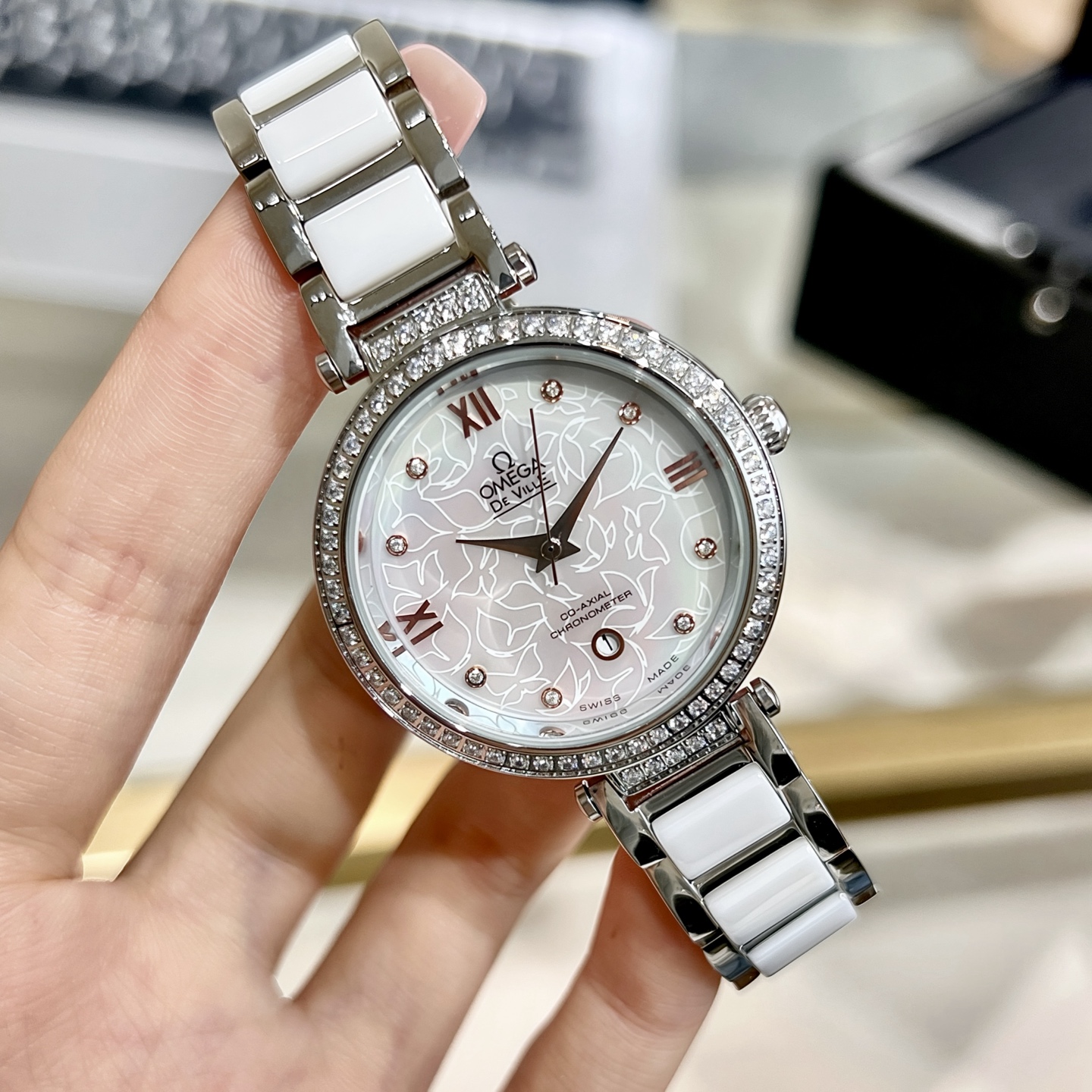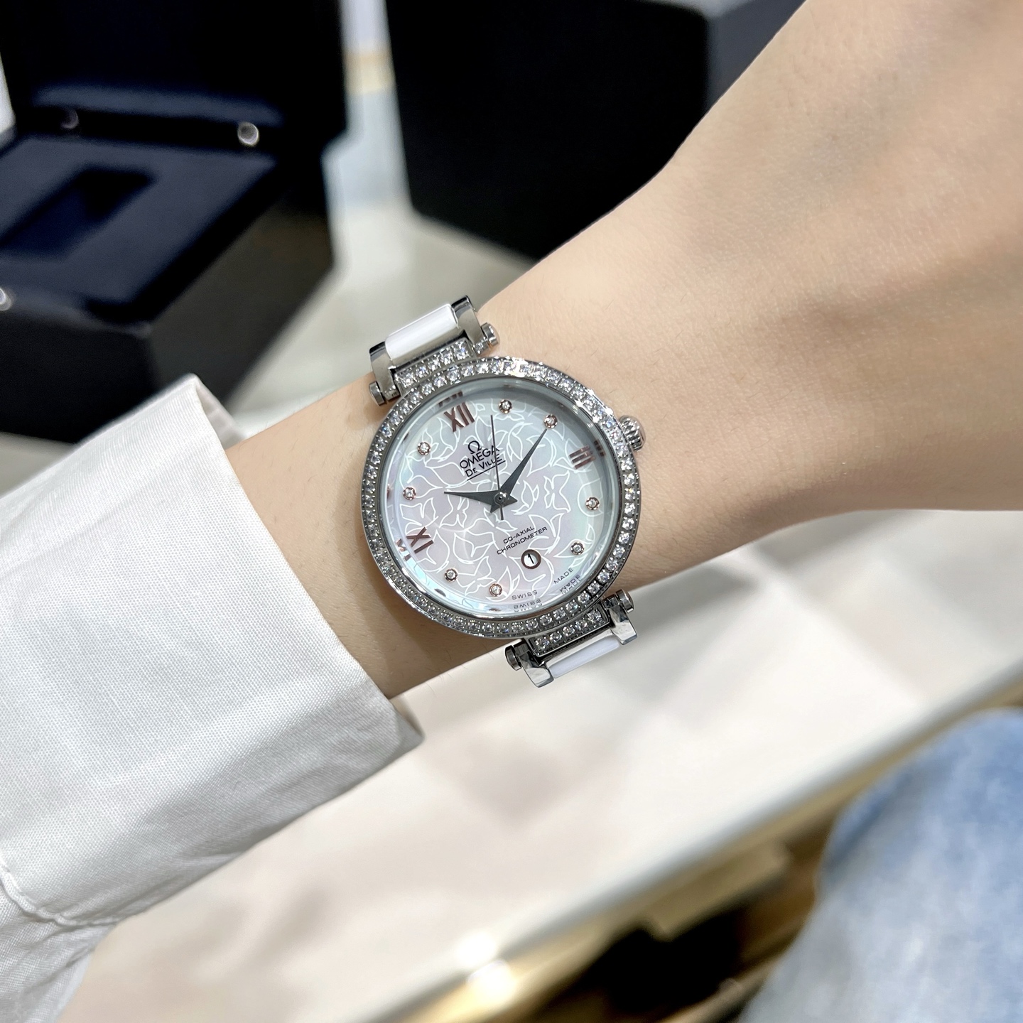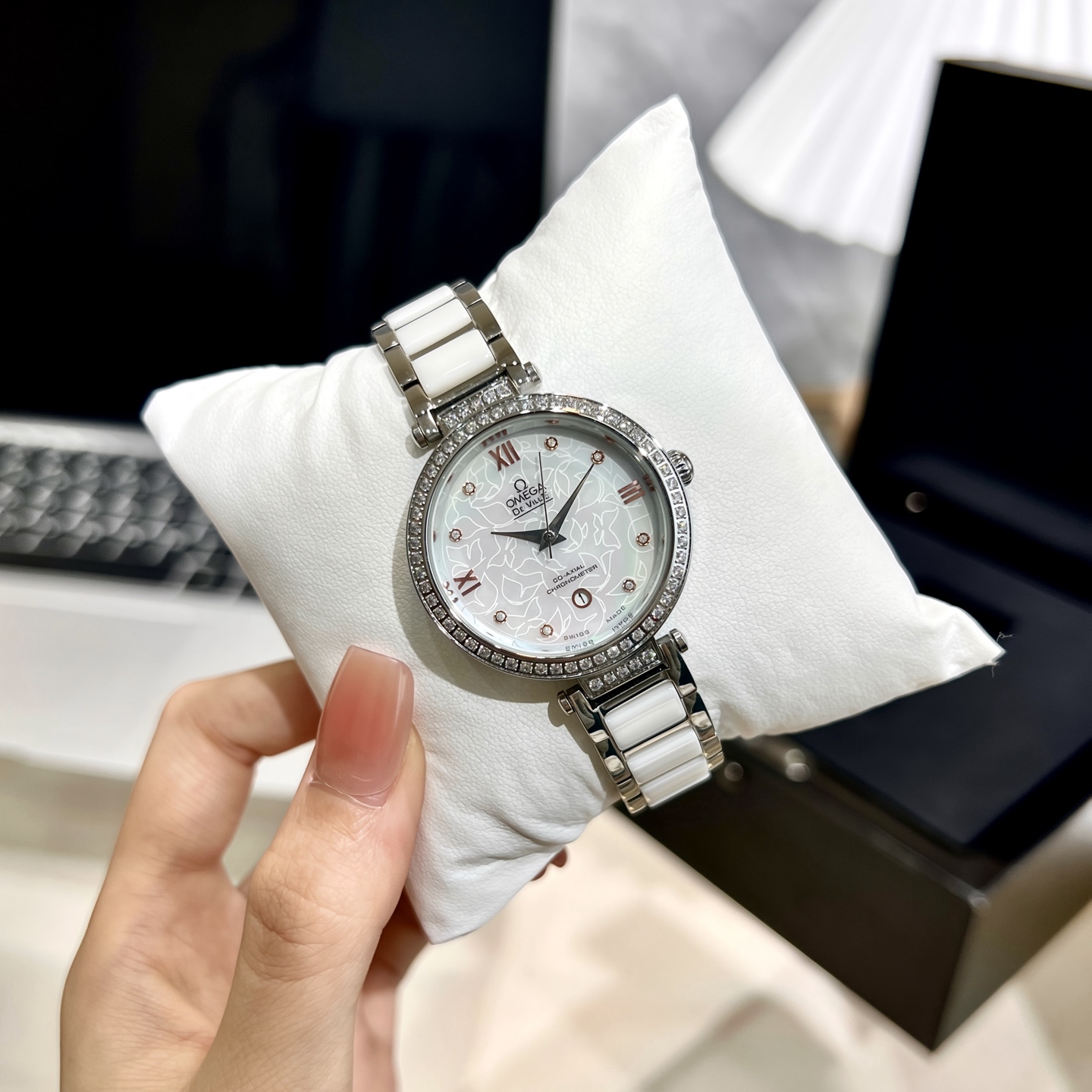 Omega's new watch: 34mm, ceramic & steel strap, skeleton flywheel, mother-of-pearl dial, minimalist numerals. Elegant, romantic design.
