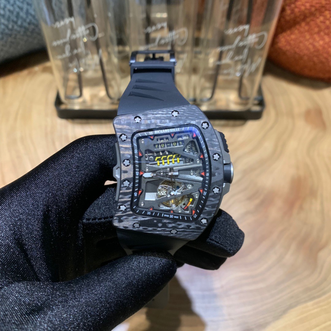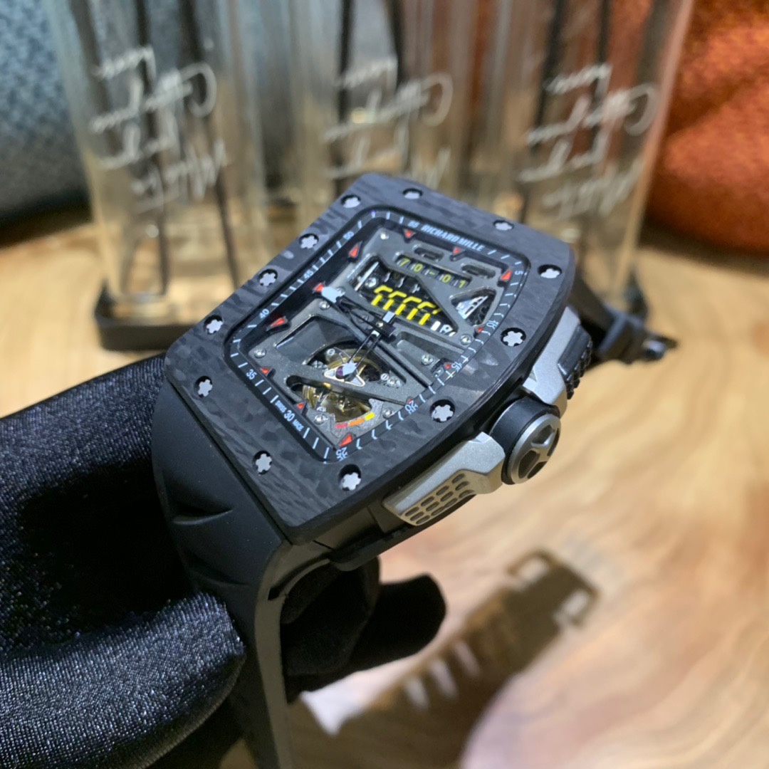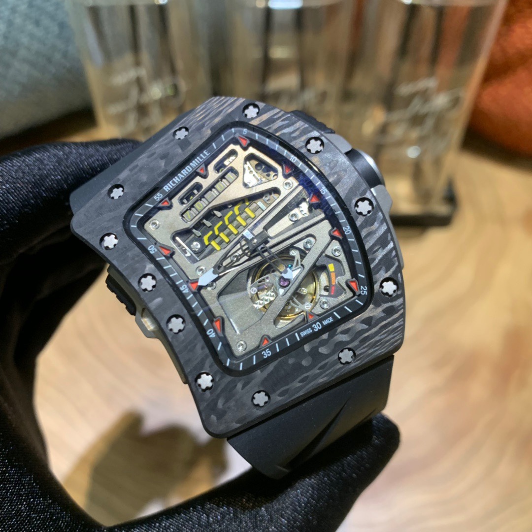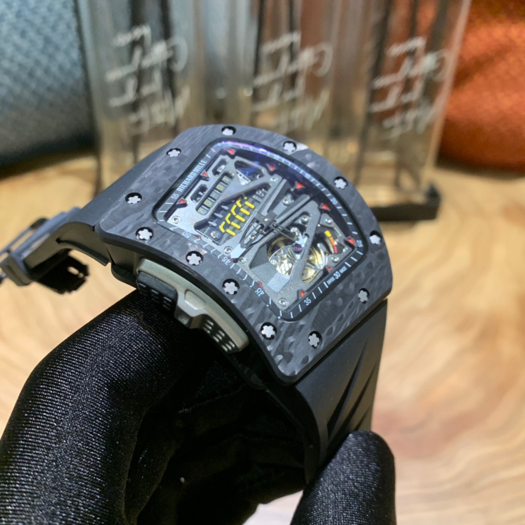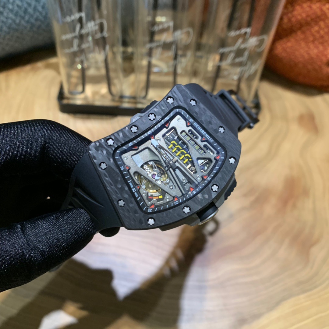 Richard Mille RM70-01, a 2018 tourbillon bike racing watch with Alain Prost. Luminous carbon fiber case, F1-inspired NTPT tech, original multi-function movement.