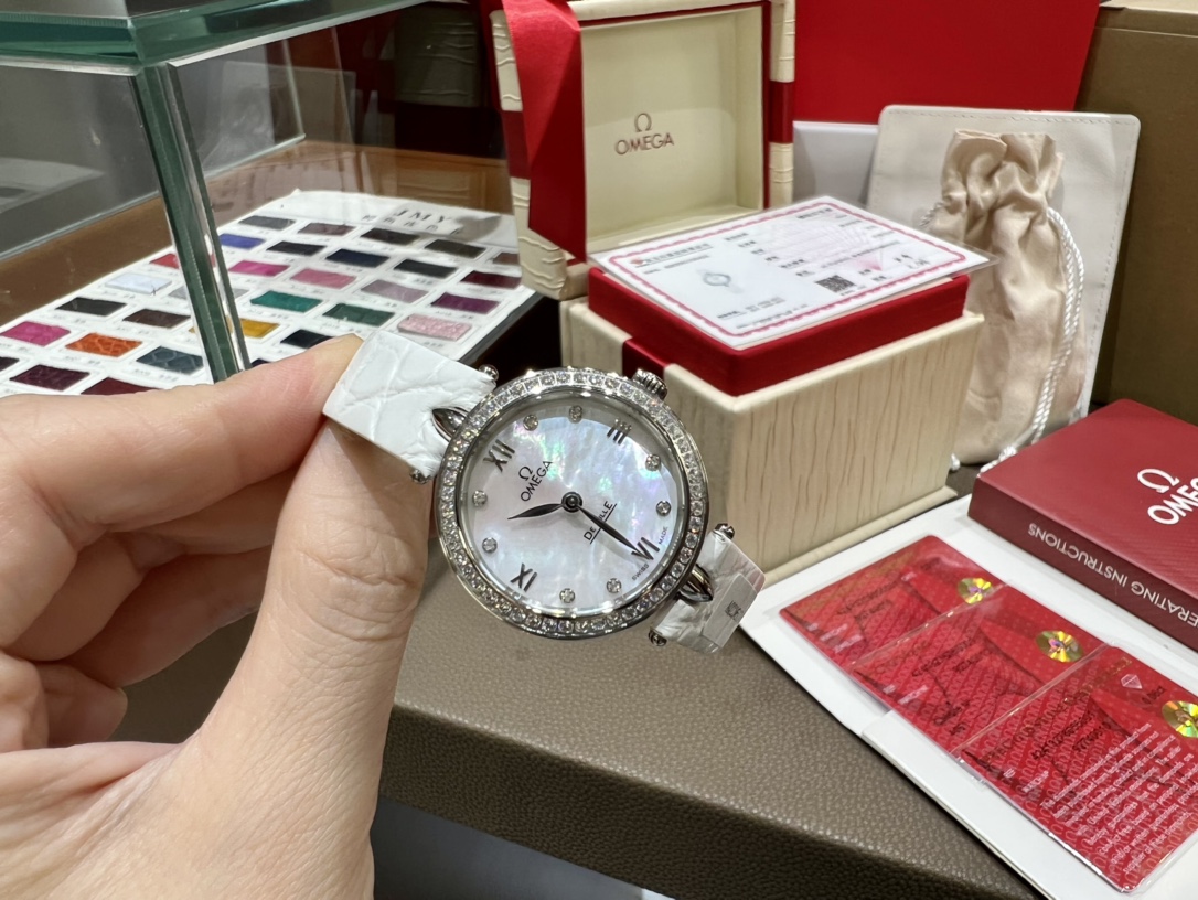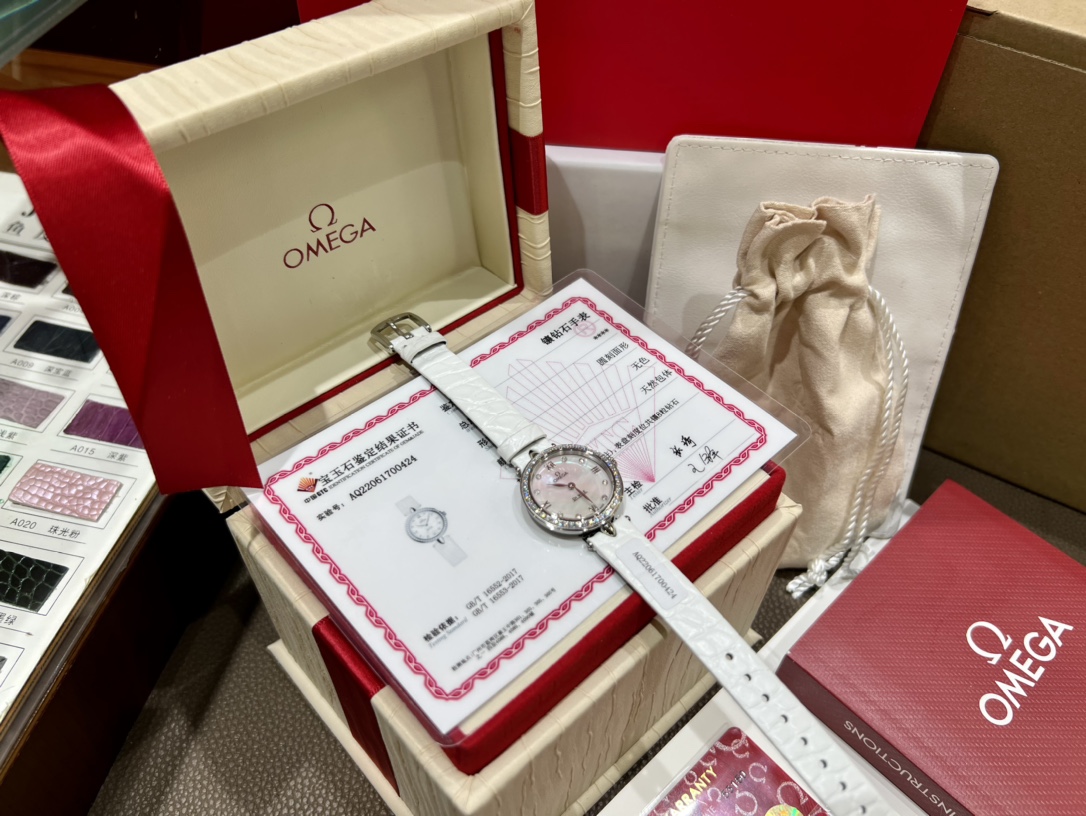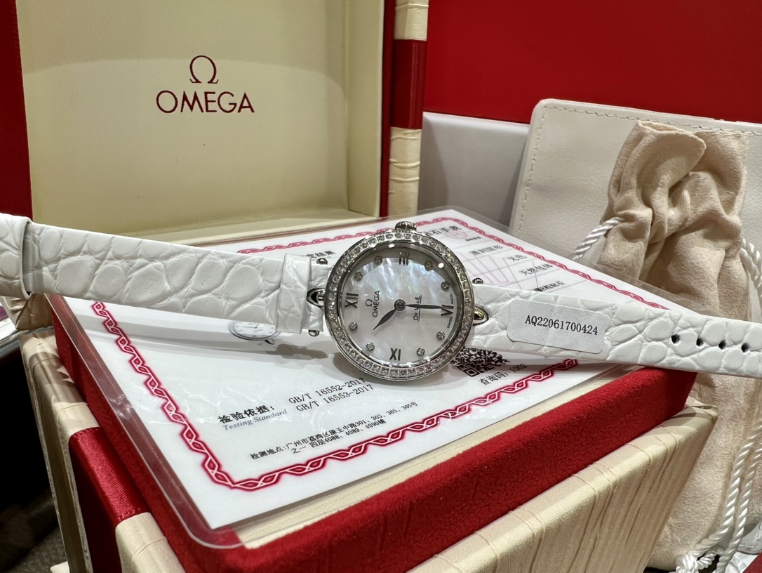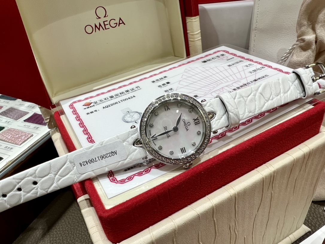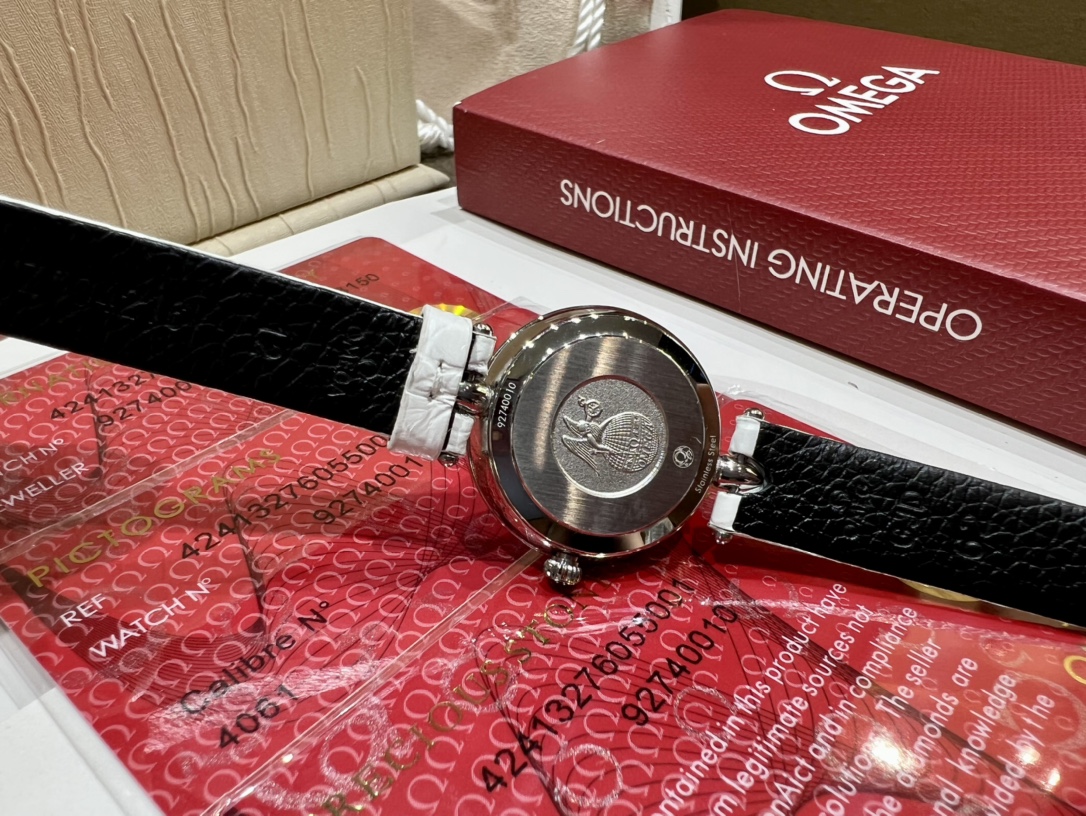 Omega De Ville Prestige Dewdrop watch: 27.4mm steel case, mother-of-pearl dial with diamonds, alligator strap, 4061 movement. GTC certificate.