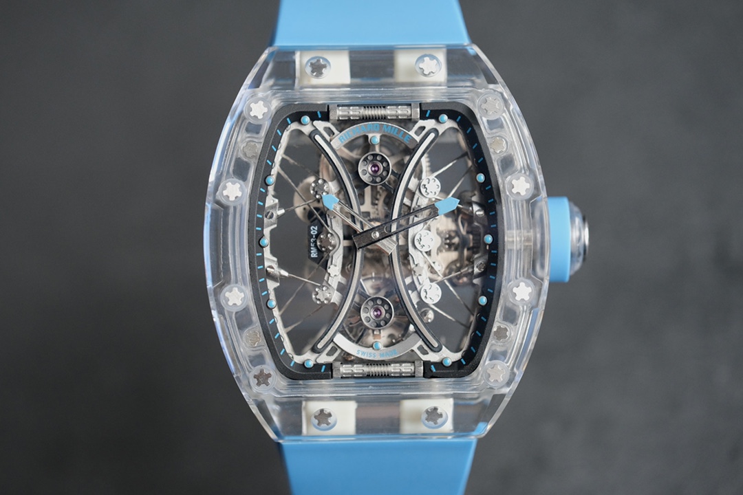RICHARD MILLE Ice Blue Crystal Polo RM53-02 Tourbillon Watch. Complex crystal tonneau case, double skeletonized base, 28800 vph. Suspended movement with steel cables. Comfortable rubber strap.