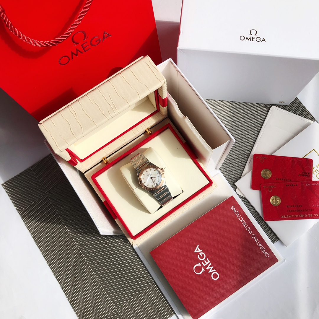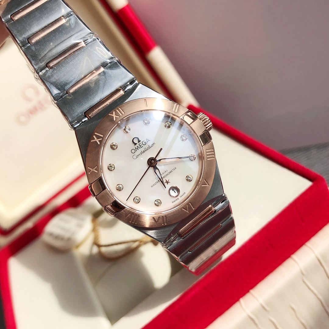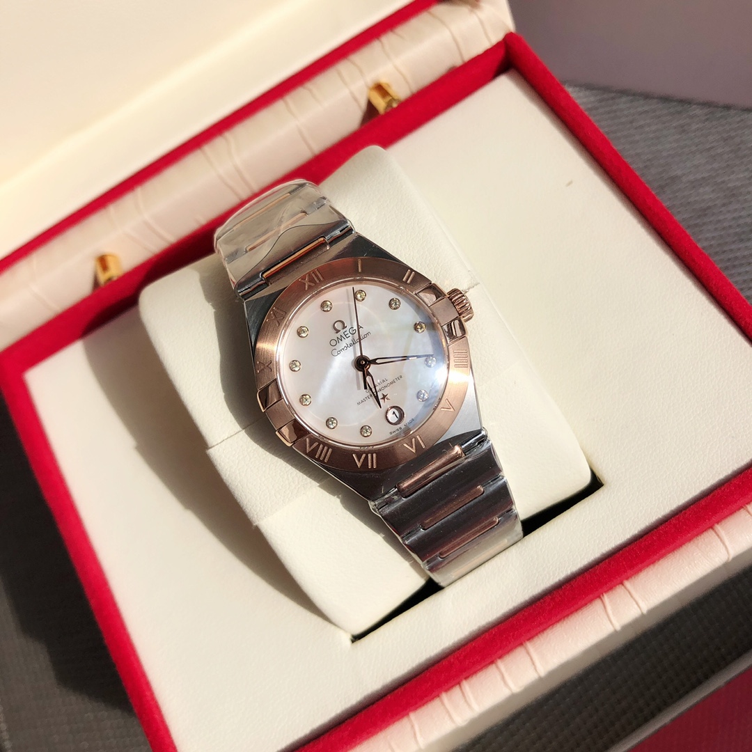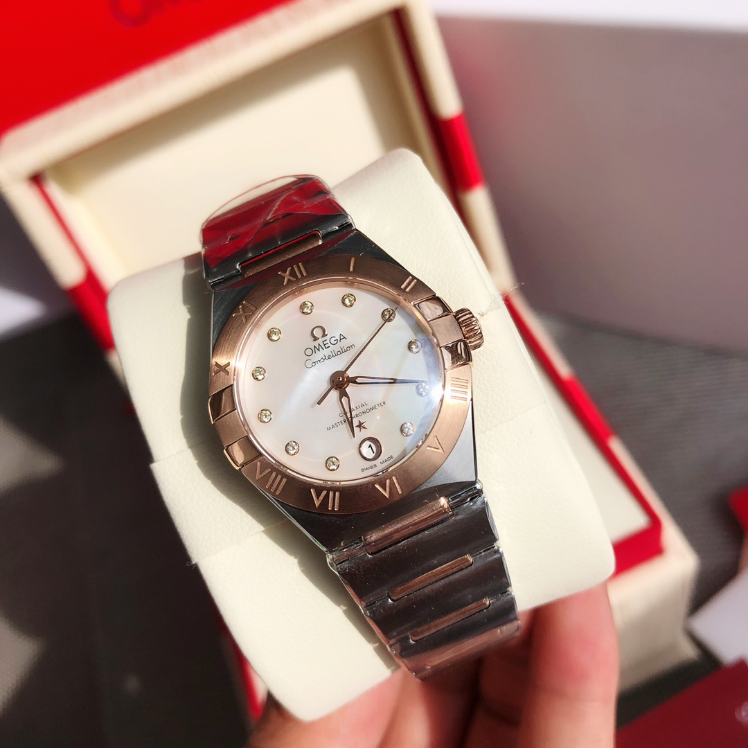 Omega 5th Gen Constellation 29mm women's watch. Synced with official upgrades, 8700 co-axial movement, 316L steel, refined case/bracelet, hidden clasp, sapphire crystal.