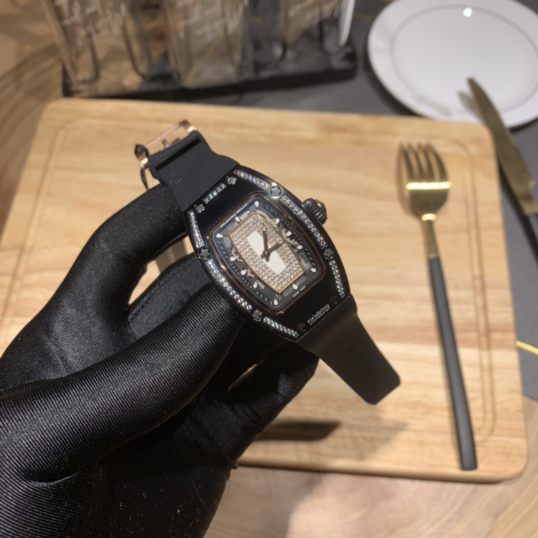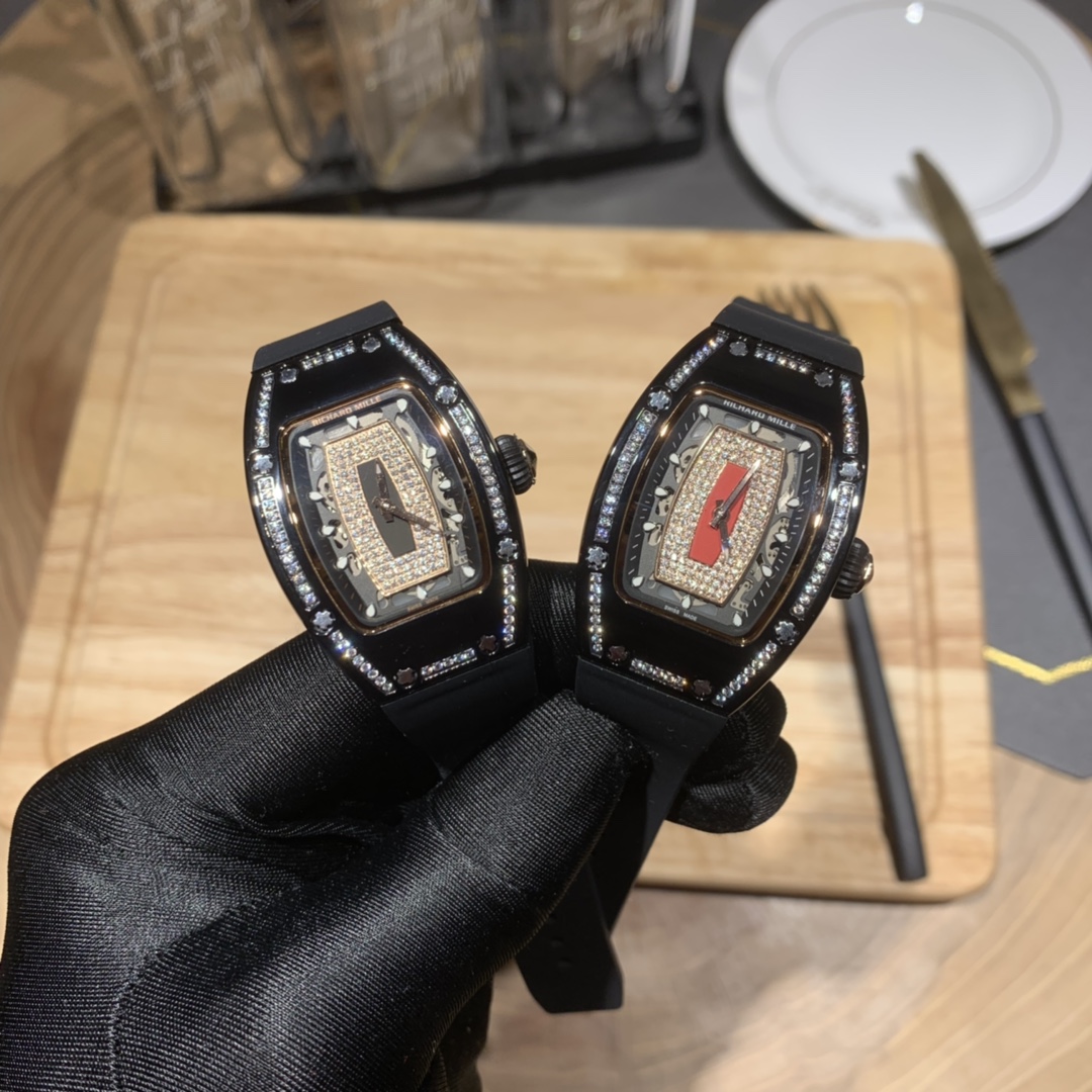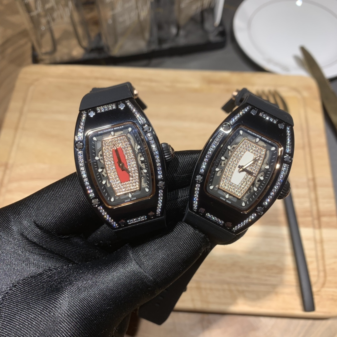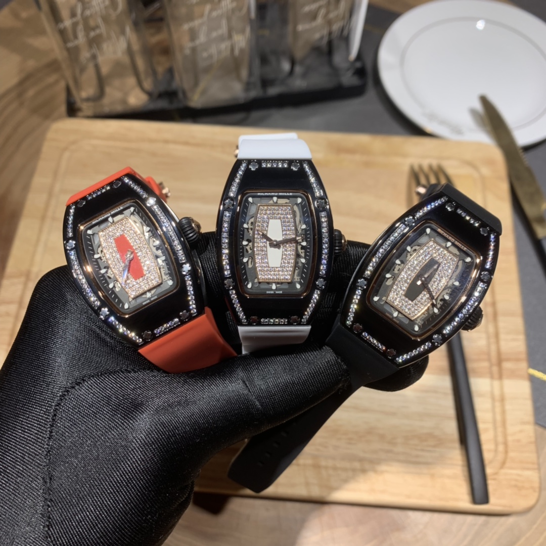 Richard Mille RM007-1 "Diamond Crown" watch for women. Features diamonds, 45x31mm tonneau case, automatic movement, titanium with PVD. Combines art and tech for small wrists.