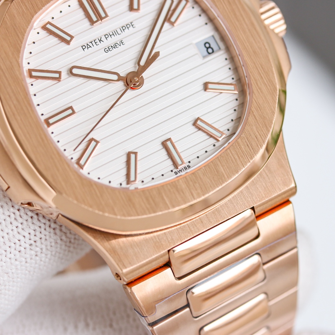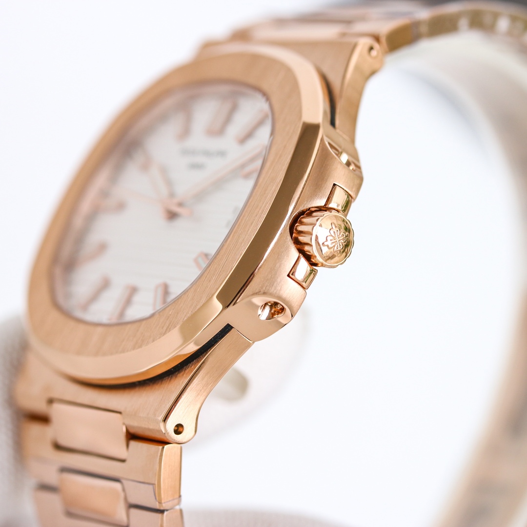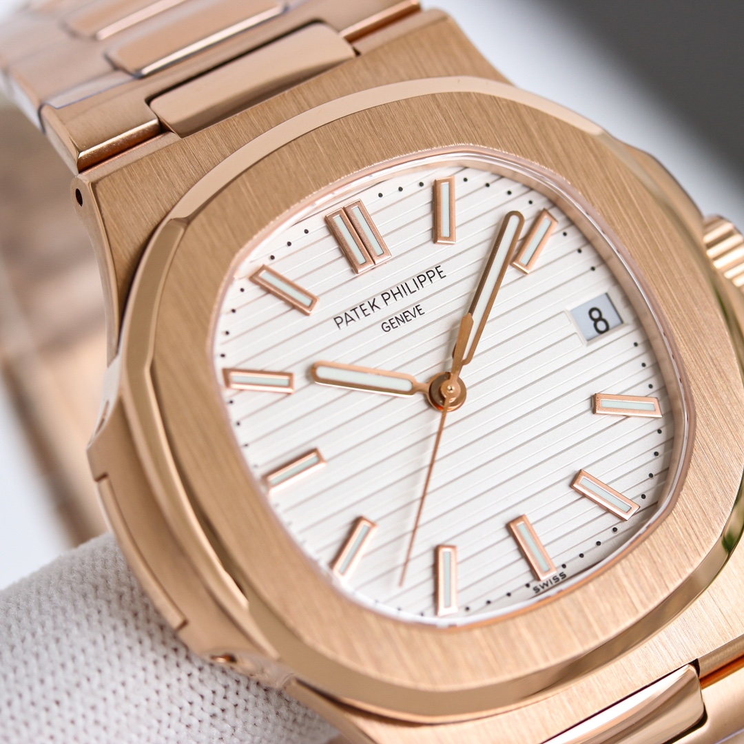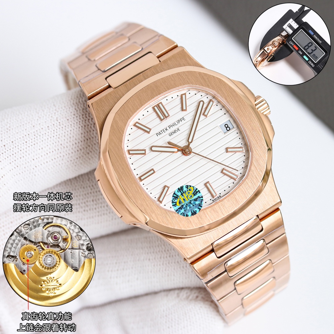 White case 1700, gold case 1750, diamond +50. OMF Patek Philippe Nautilus upgraded: engraved movement, reduced noise, bright lume, corrected color, aligned date, smooth crown, 8.3mm thickness.