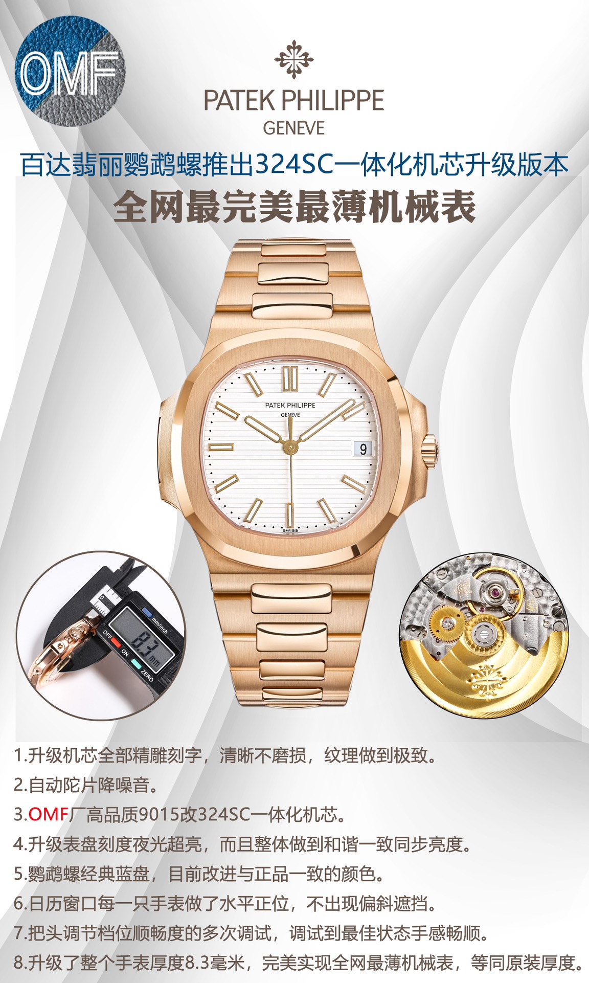 OMF Patek Philippe Nautilus upgraded: engraved movement, quieter rotor, super bright lume, authentic blue dial, aligned date, smooth crown, 8.3mm thickness.