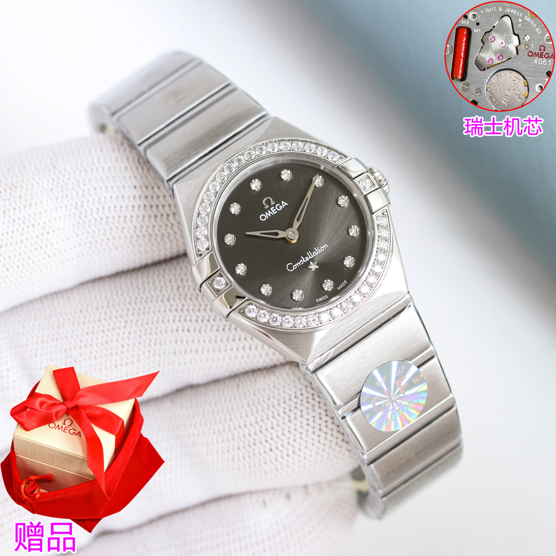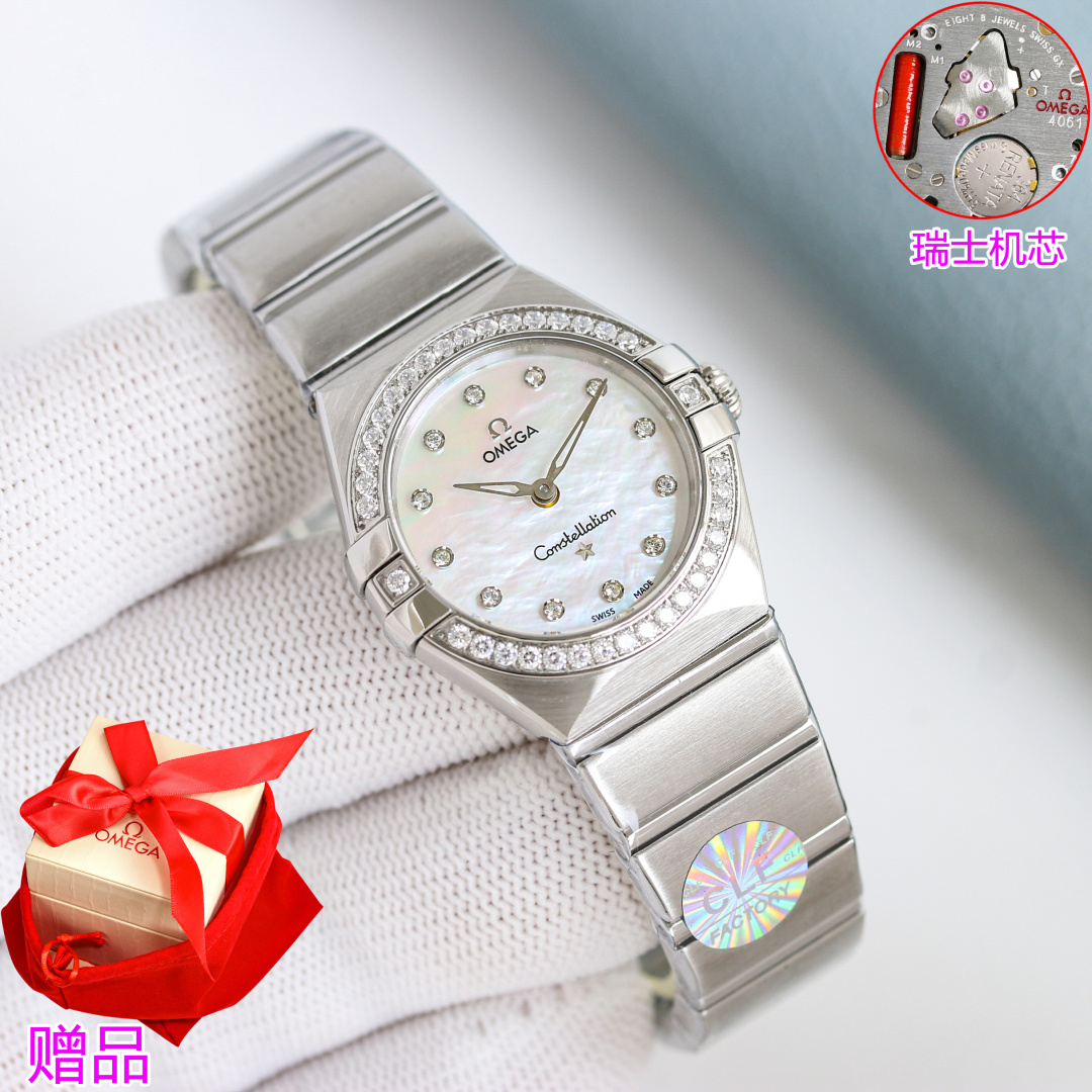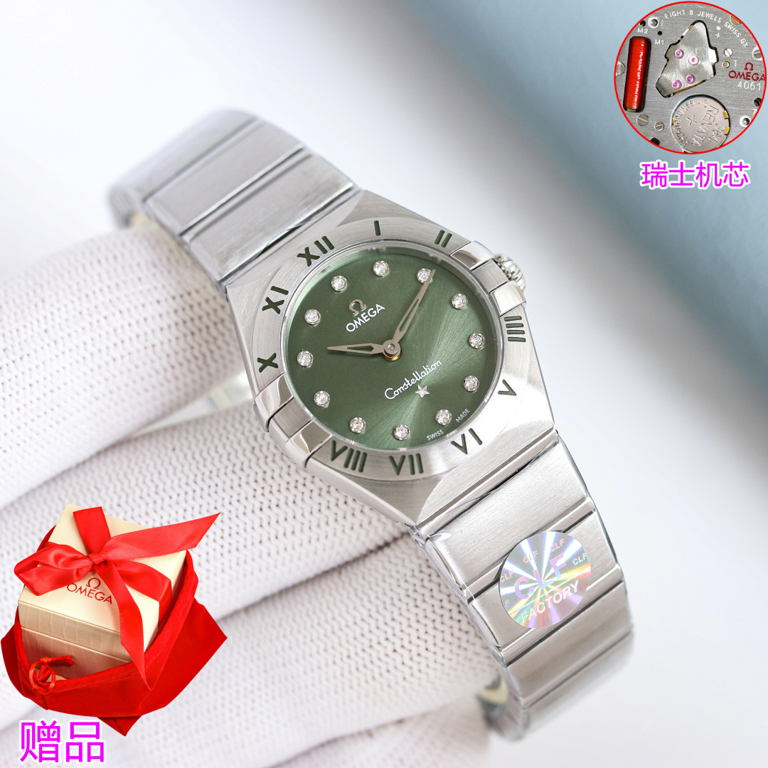 CLF Omega Constellation 28mm Swiss quartz watch. Slim claws, polished case, enhanced waterproofing. High restoration of bezel and case back. Elegant dial, polished bracelet with adjustable clasp. Imported Swiss movement, precise and reliable. Stylish and elegant, the top choice for women.