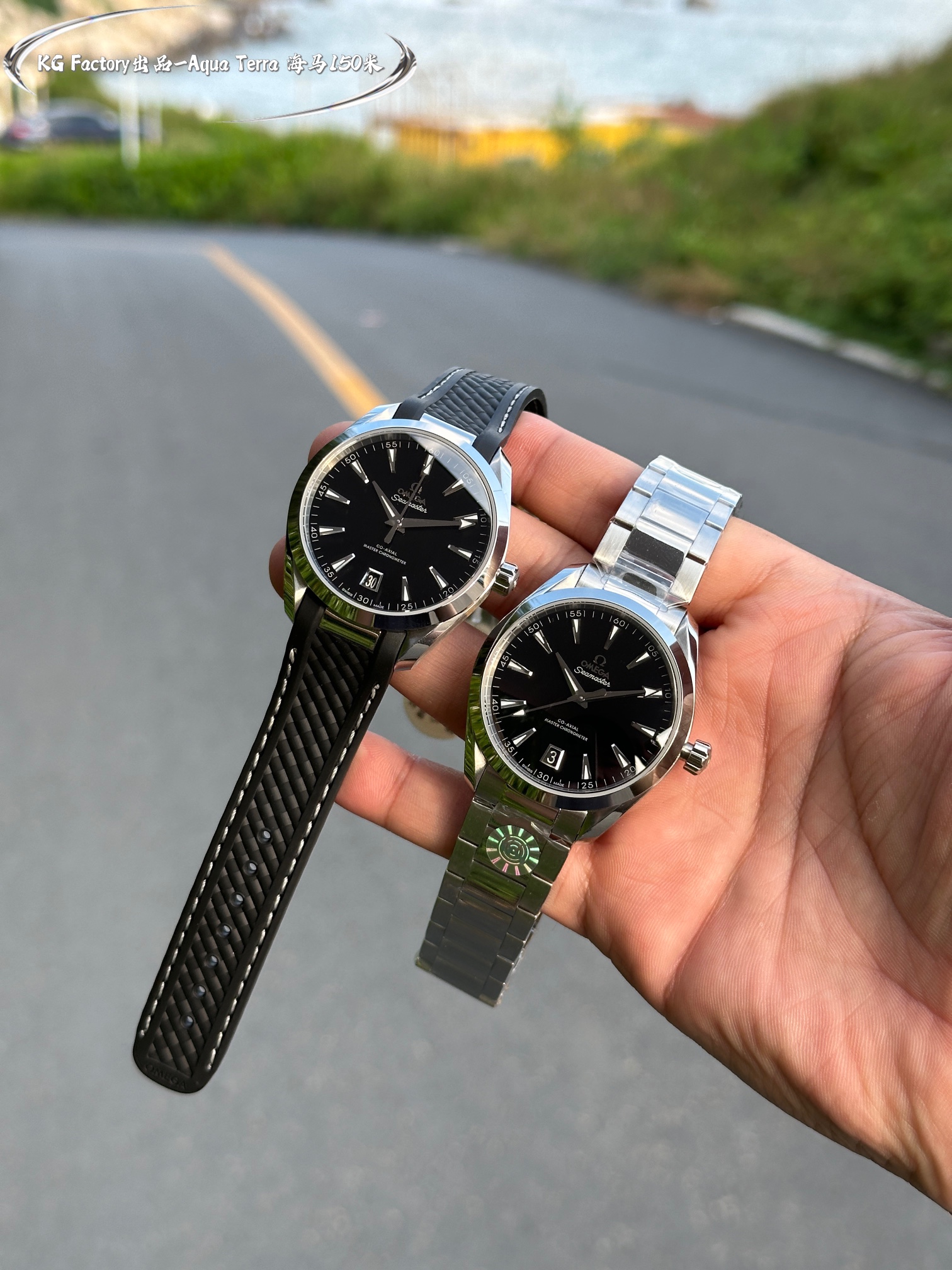 KG factory Omega Seamaster 150m Aqua Terra. 41mm 2024 black enamel dial, exclusive natural strap, steel case, upgraded 8900 movement, sapphire crystal.