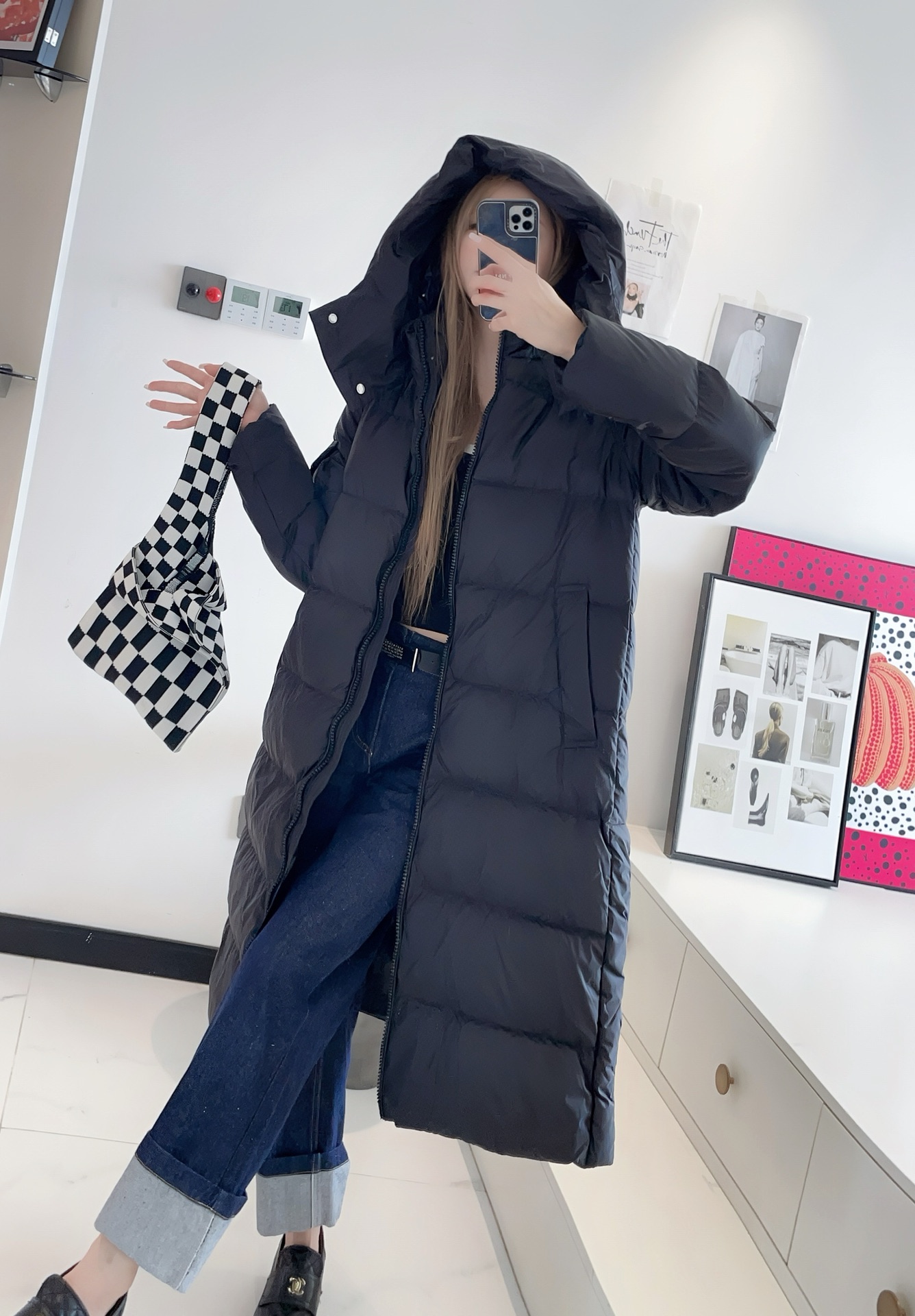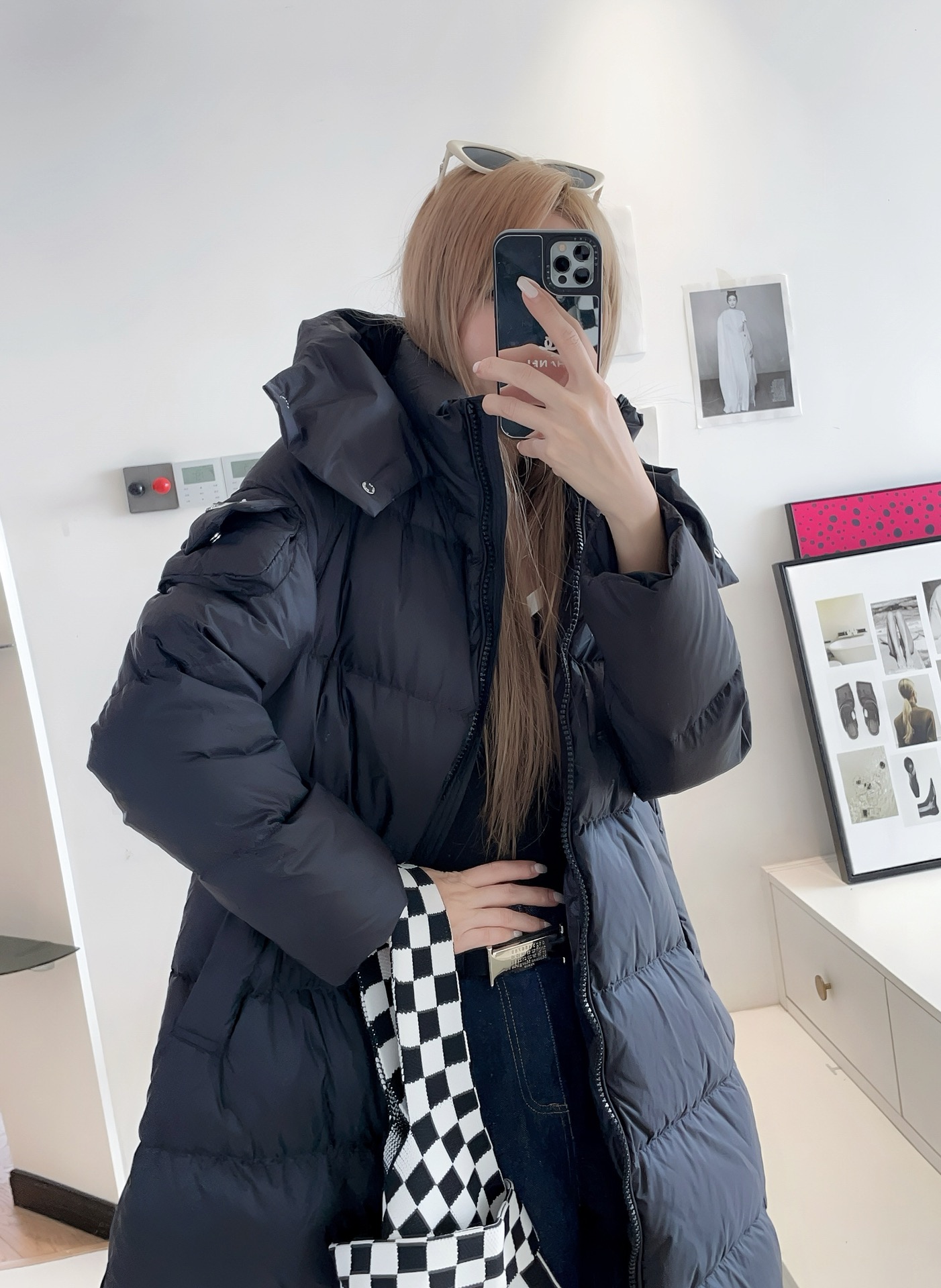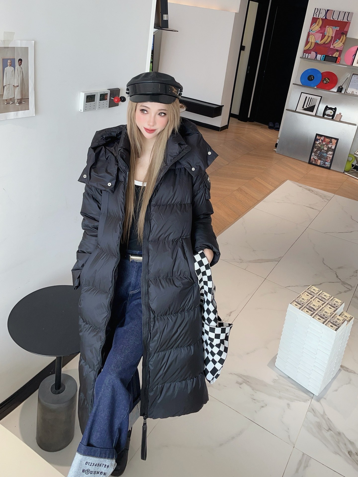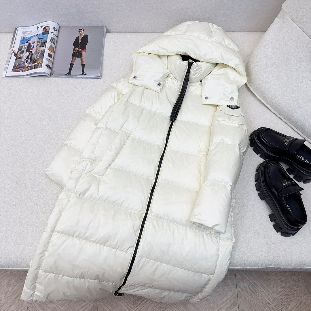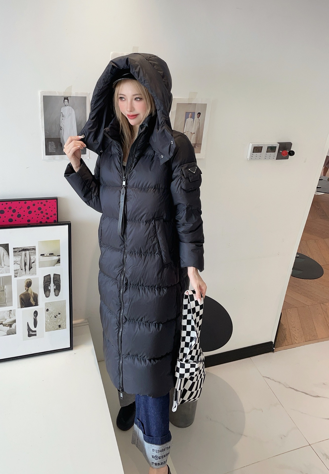 Top-grade foreign trade Prada long down jacket, latest autumn/winter style with small sleeve bag decoration, triangular logo, hooded long down jacket. Classic slightly A-line silhouette, high exposure and practicality, super stylish. Filled with 90% white goose down, excellent warmth without bulkiness. YB metal accessories + sleeve logo leather patch, details add extra points. Recommended. Three colors available in stock, sizes S/M/L/XL.