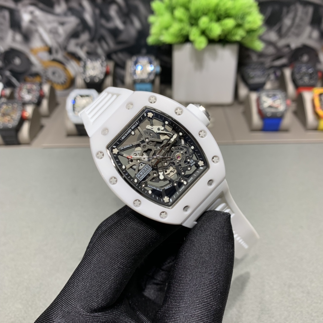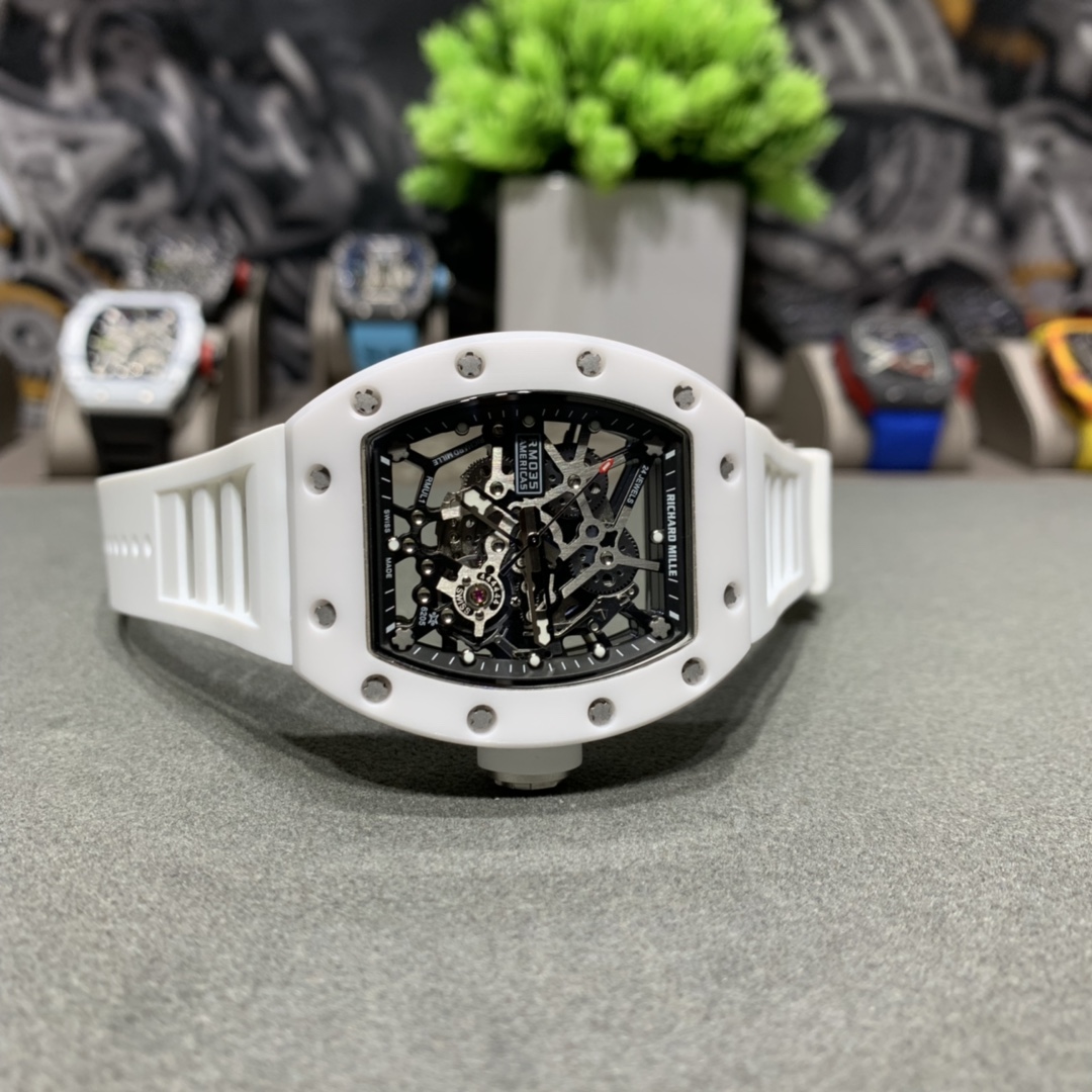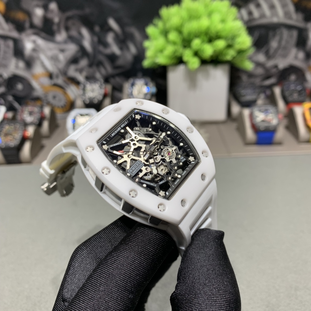 Richard Miller RM-035: Full skeleton, 3-part case with Korean ceramic bezel, 316 steel middle case, automatic movement, 50x42mm.